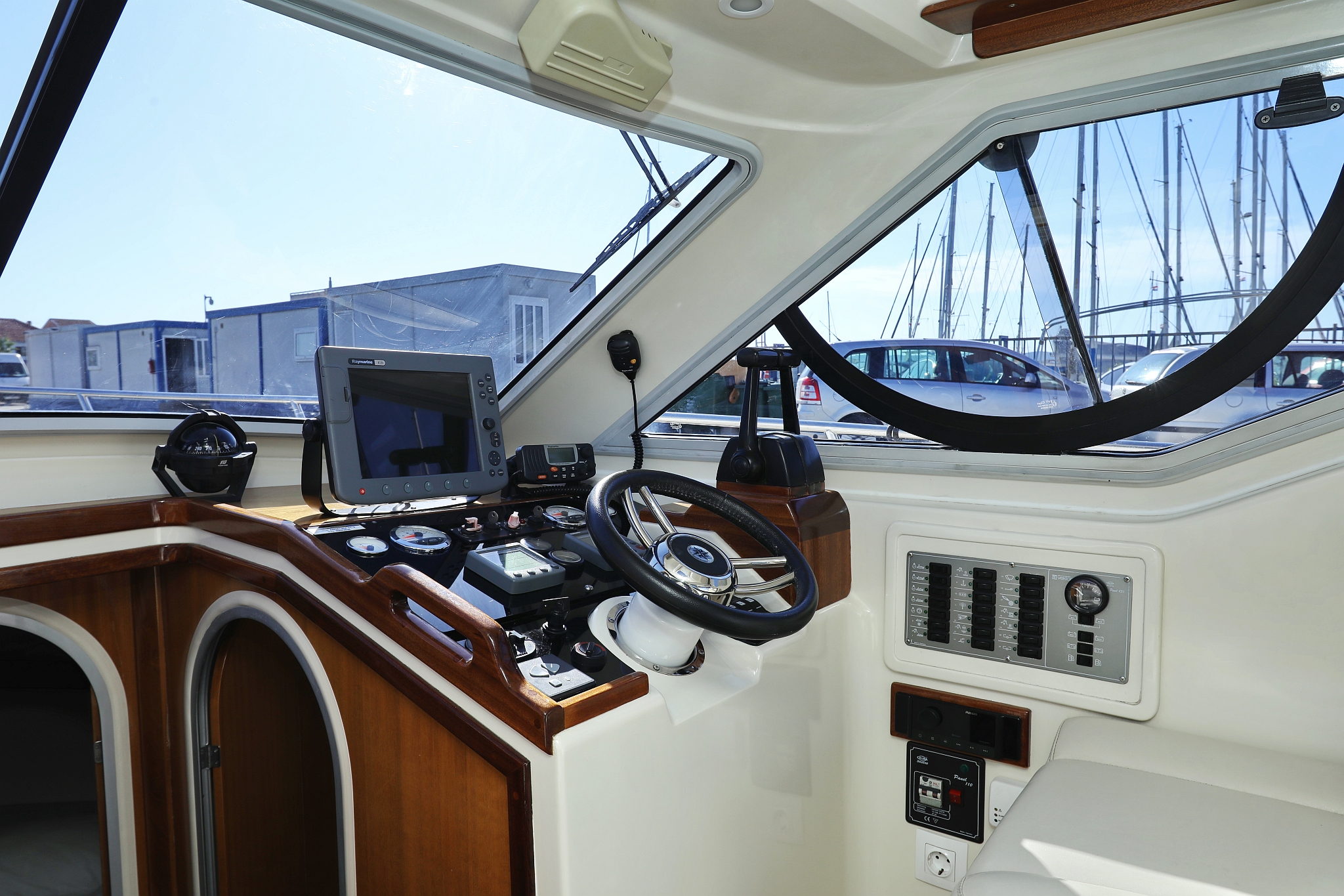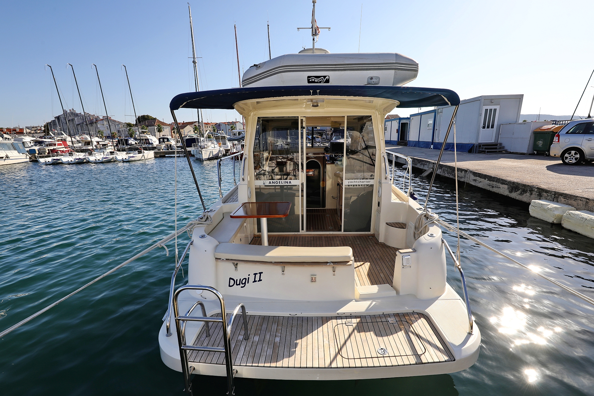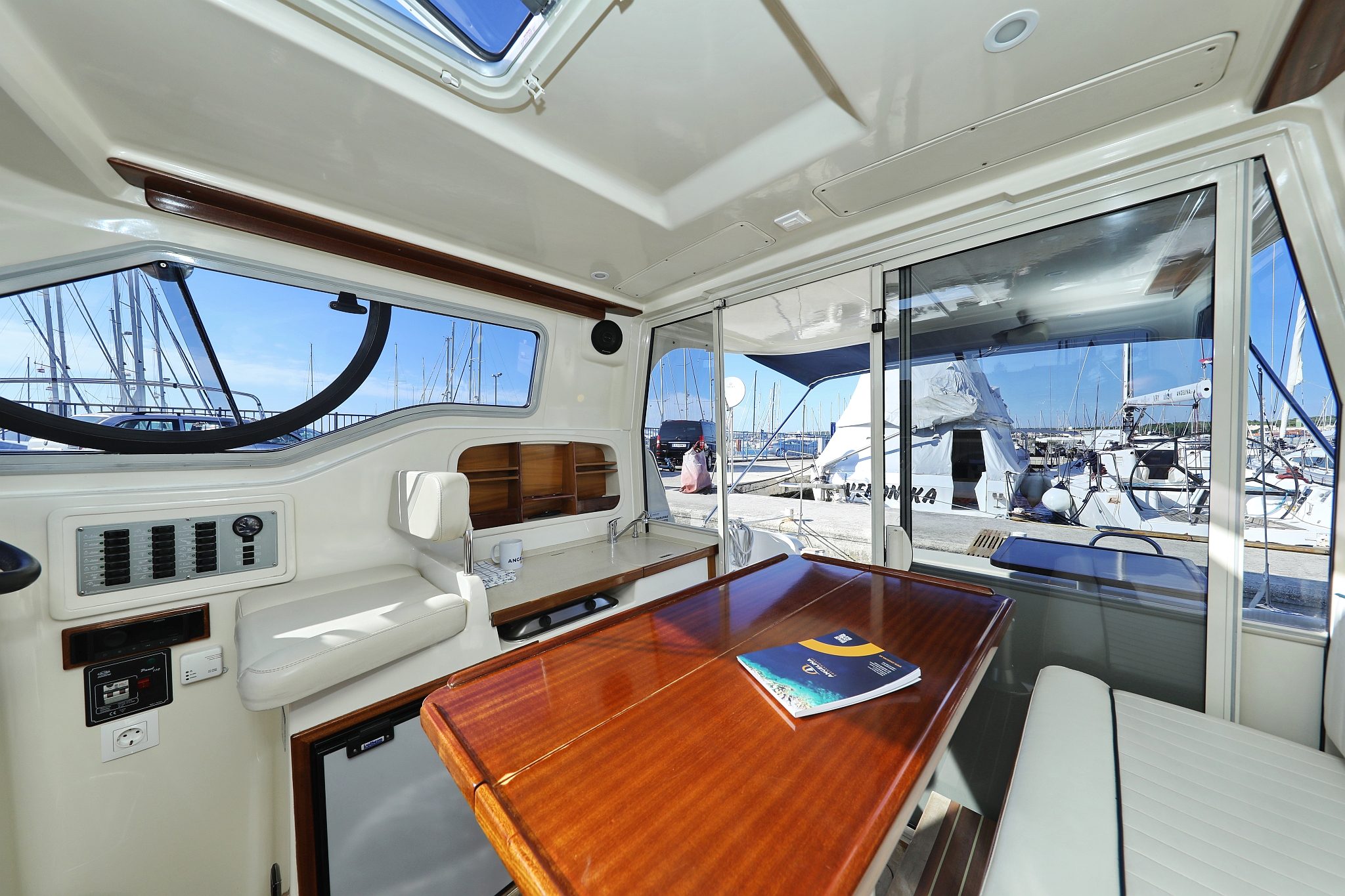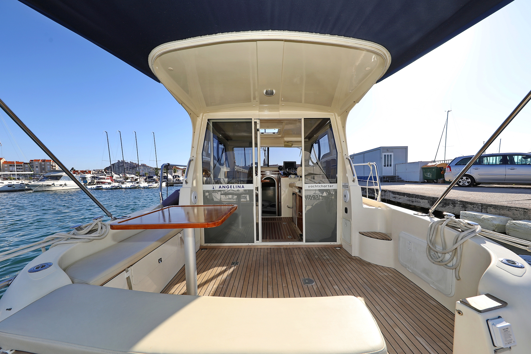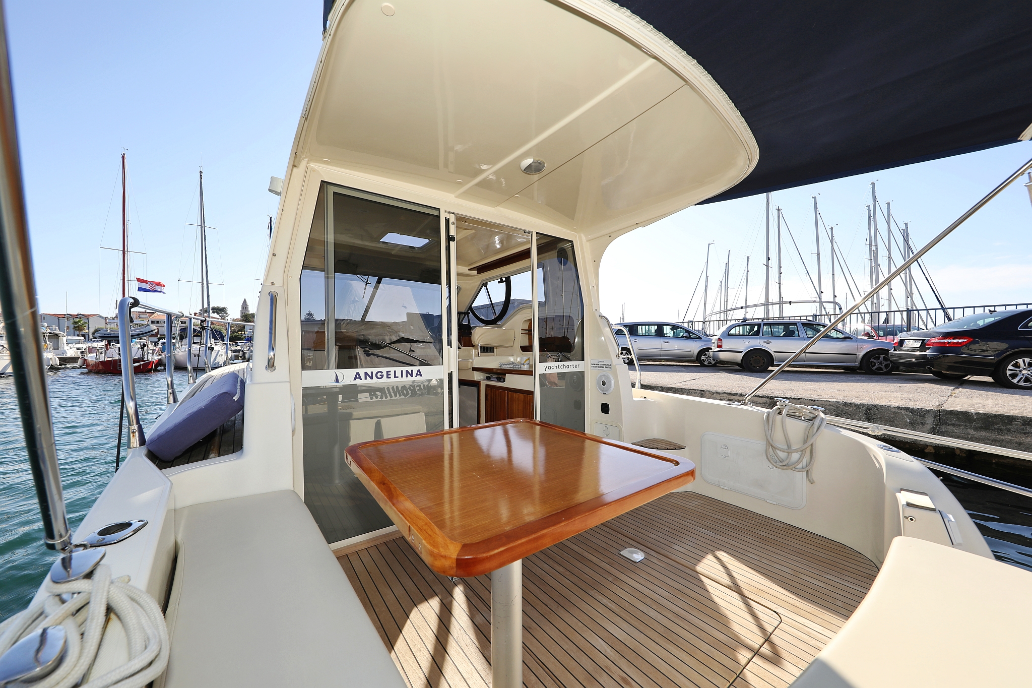 | Outside | 220 V-Landanschluss, Abnehmbarer Cockpittisch, Anker mit Kette, Badeplattform, Cockpitdusche, Cockpitlautsprecher, elektr. Ankerwinsch, Fender, Gangway, Hardtop, Kugelfender, Solaranlage, Teak im Cockpit |