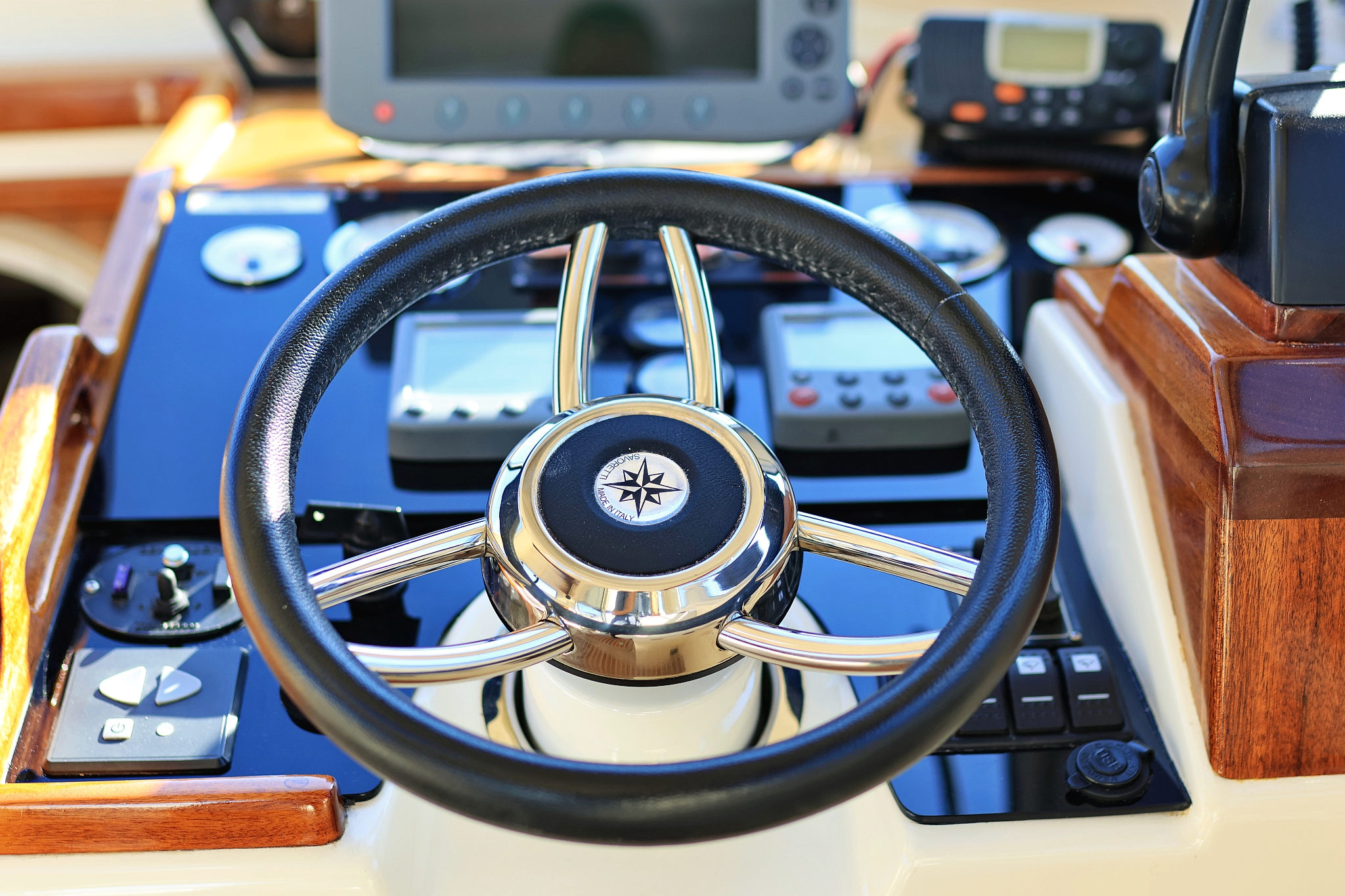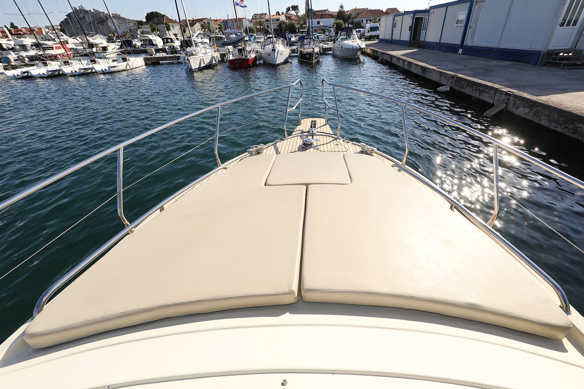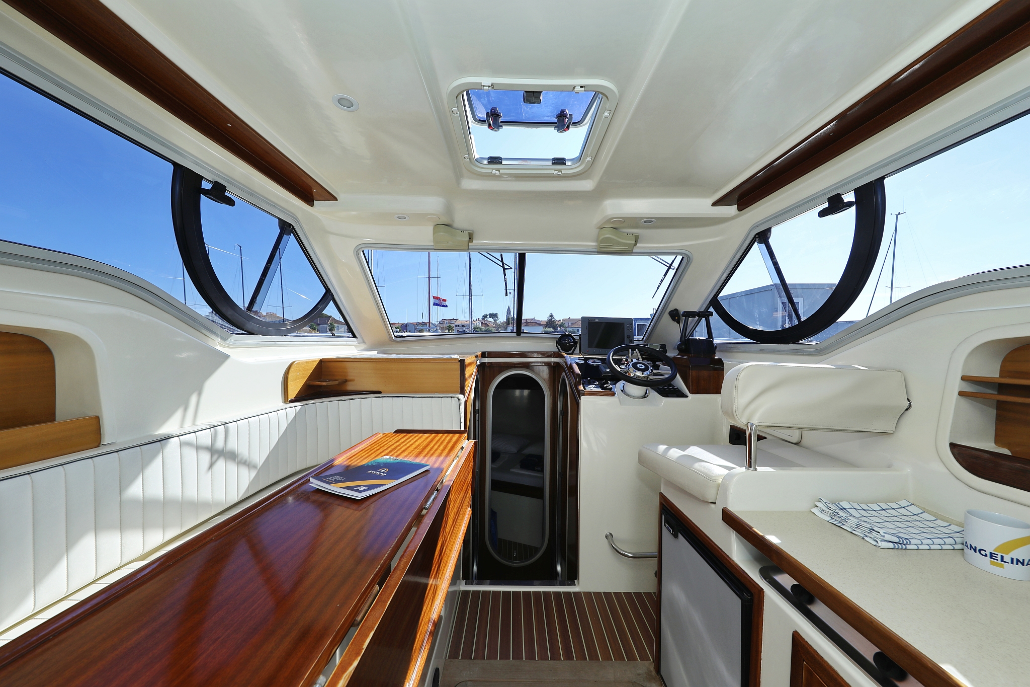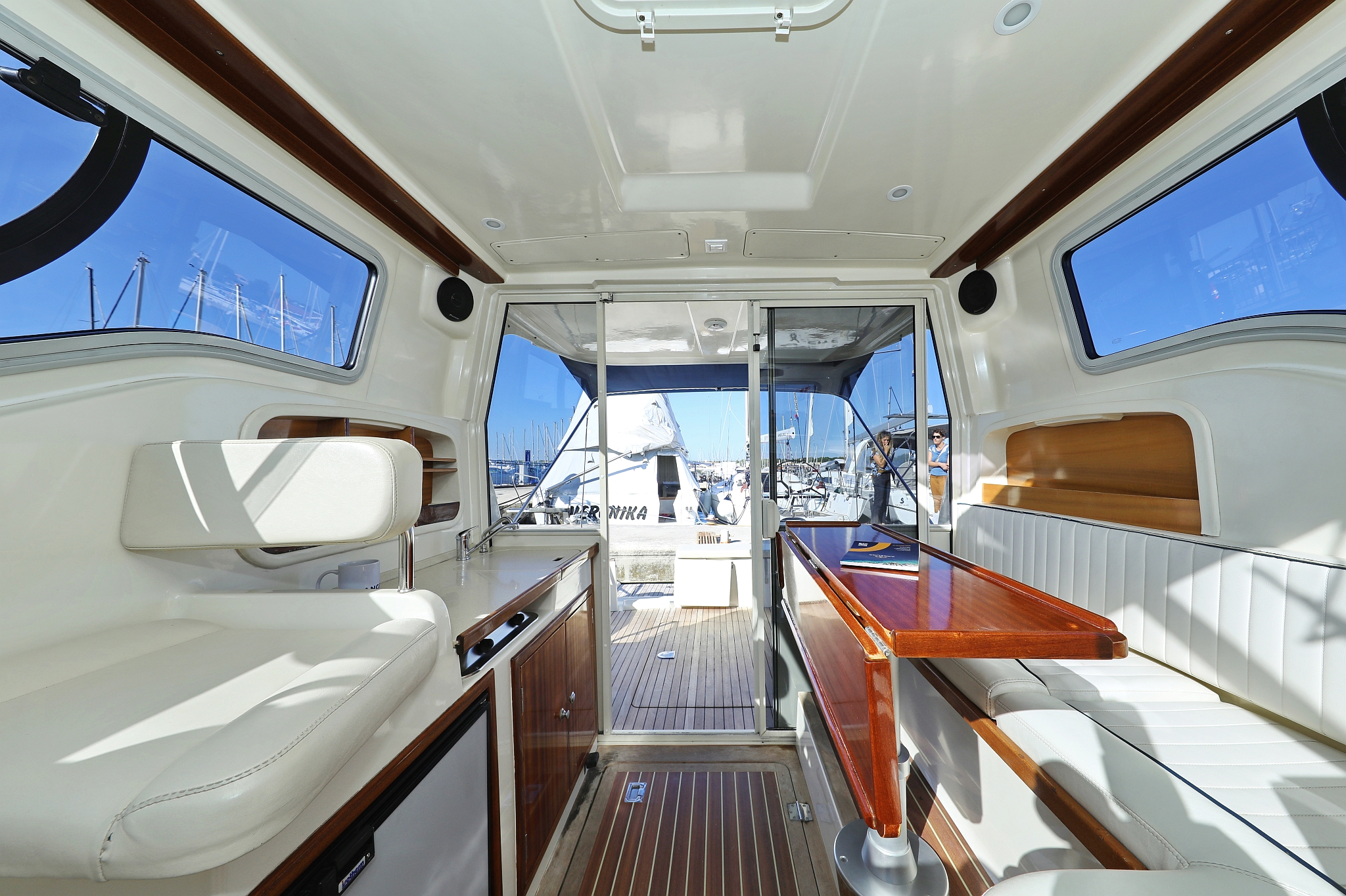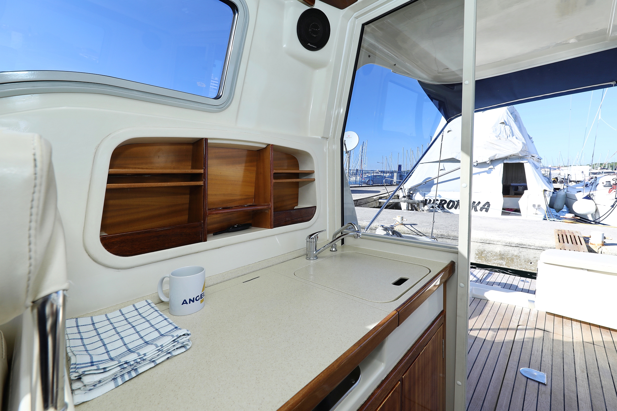 | Outside | 220 V-Landanschluss, Abnehmbarer Cockpittisch, Anker mit Kette, Badeplattform, Cockpitdusche, Cockpitlautsprecher, elektr. Ankerwinsch, Fender, Gangway, Hardtop, Kugelfender, Solaranlage, Teak im Cockpit |