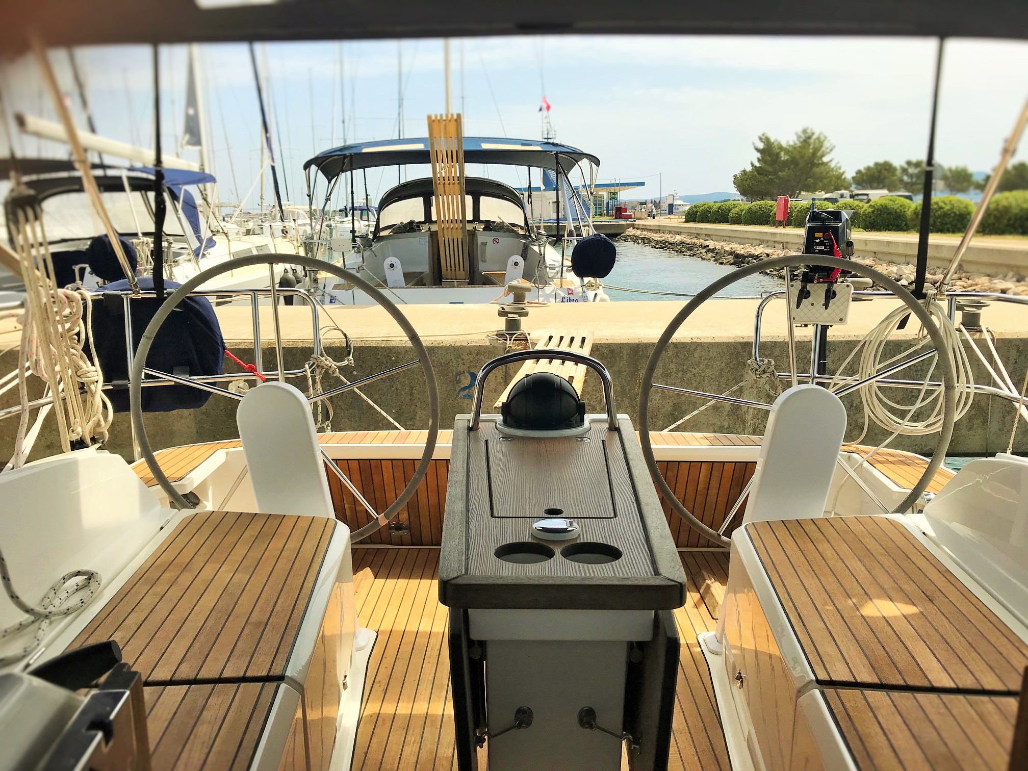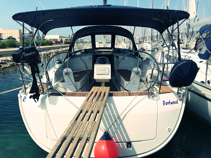 | Outside | 12 V-Anschluss, 220 V-Landanschluss, Anker mit Kette, Badeleiter, Badeplattform, Biminitop, Bootshaken, Cockpitdusche, Cockpitlautsprecher, Cockpitpolster, Cockpittisch, Deckbürste, Dieselkanister , elektr. Ankerwinsch, Fender, Festmacherleinen, Gangway, Kunststoff-Eimer (Pütz), Sprayhood, Wasserkanister , Wasserschlauch, Windex, Winschen |