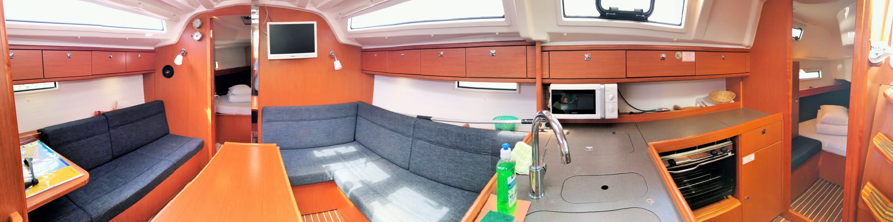| Inside | 12V Steckdose, 220V Steckdosen, Backofen, Borduhr, Dusche, Fäkalientank, Gasherd, Gefrierschrank, Kleiderbügel, Klobürste, Kühlschrank, Ladegerät, Luftpumpe für Beiboot, Mikrowelle, Pantryausstattung, Radio mit CD, Salontisch absenkbar, Spülbecken, Trichter, TV, Ventilator, Warmwasser, WC-Pumpe |