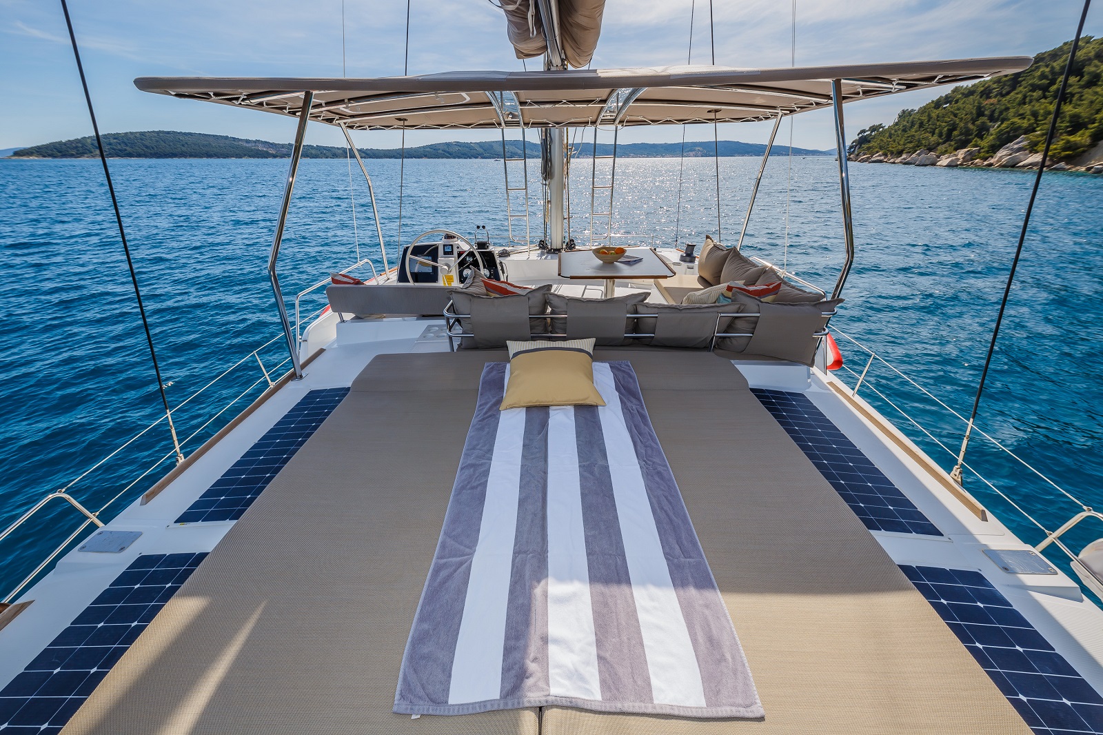 | Inside | FUSION Sound System, Gasherd mit Backofen, Gefrierschrank, Generator, Geschirrspüler, Heizung, Inverter 12V/220V, Kaffeemaschine, Klimaanlage (ohne Landstrombedarf), Kühlschrank, Ladegerät, Lautsprecher im Salon, Lautsprecher in Salon und Cockpit, LCD Fernseher, Mikrowelle, Pantryausstattung, Salontisch absenkbar, Ventilatoren in Kabinen, Warmwasser, Waschmaschine, Watermaker, WC (elektr.) |