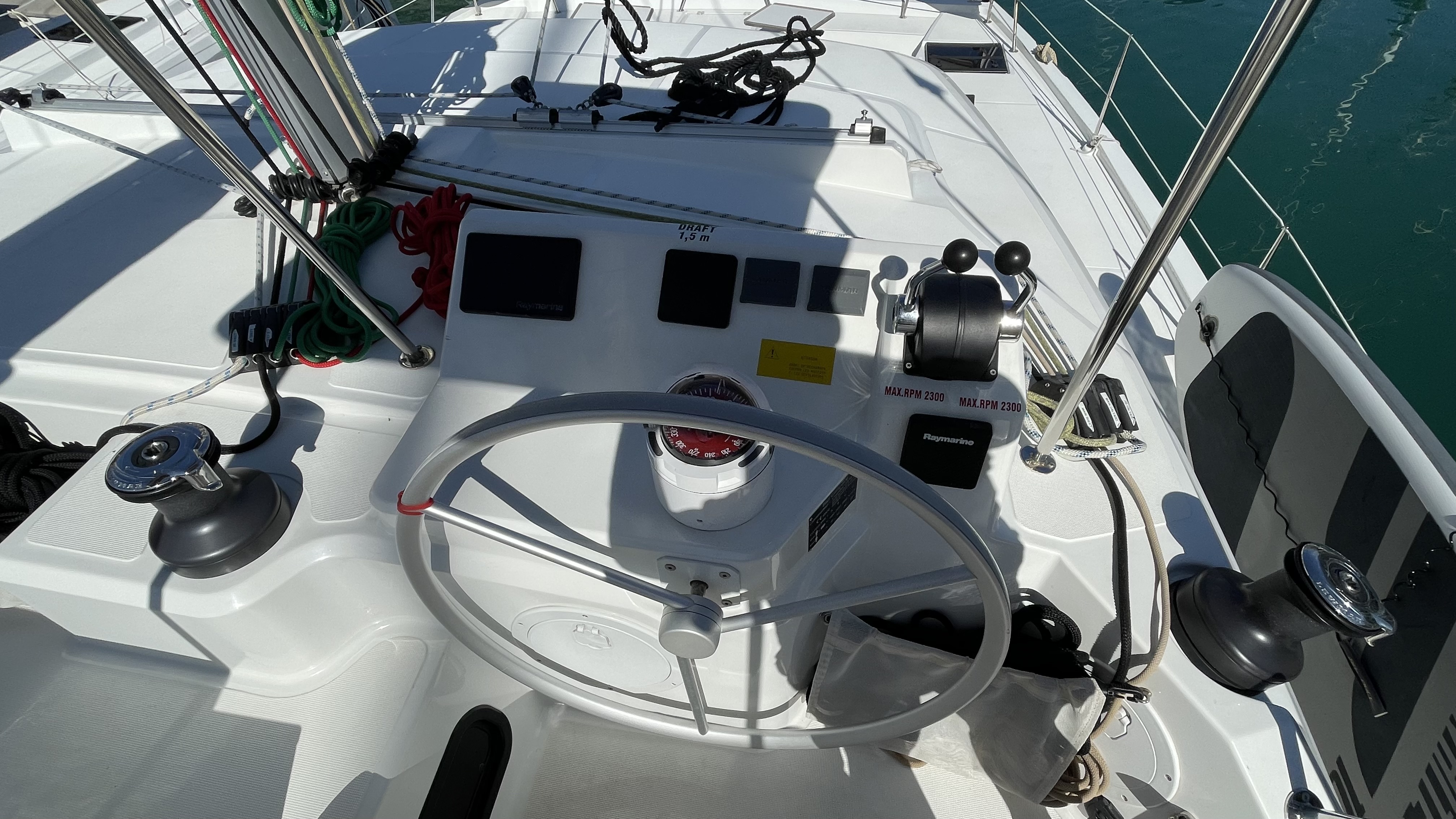 Der Bali Catspace hat ein hydraulisches Ruder. Rückmeldung vom Steuer ist 0,0 und die Reaktionen auf (relativ große) Ruderbewegungen dauert 6-7 Sekunden! Nach einiger Zeit kann man sich aber einigermaßen dran gewöhnen, sodass man wenigstens geradeaus fahren kann.