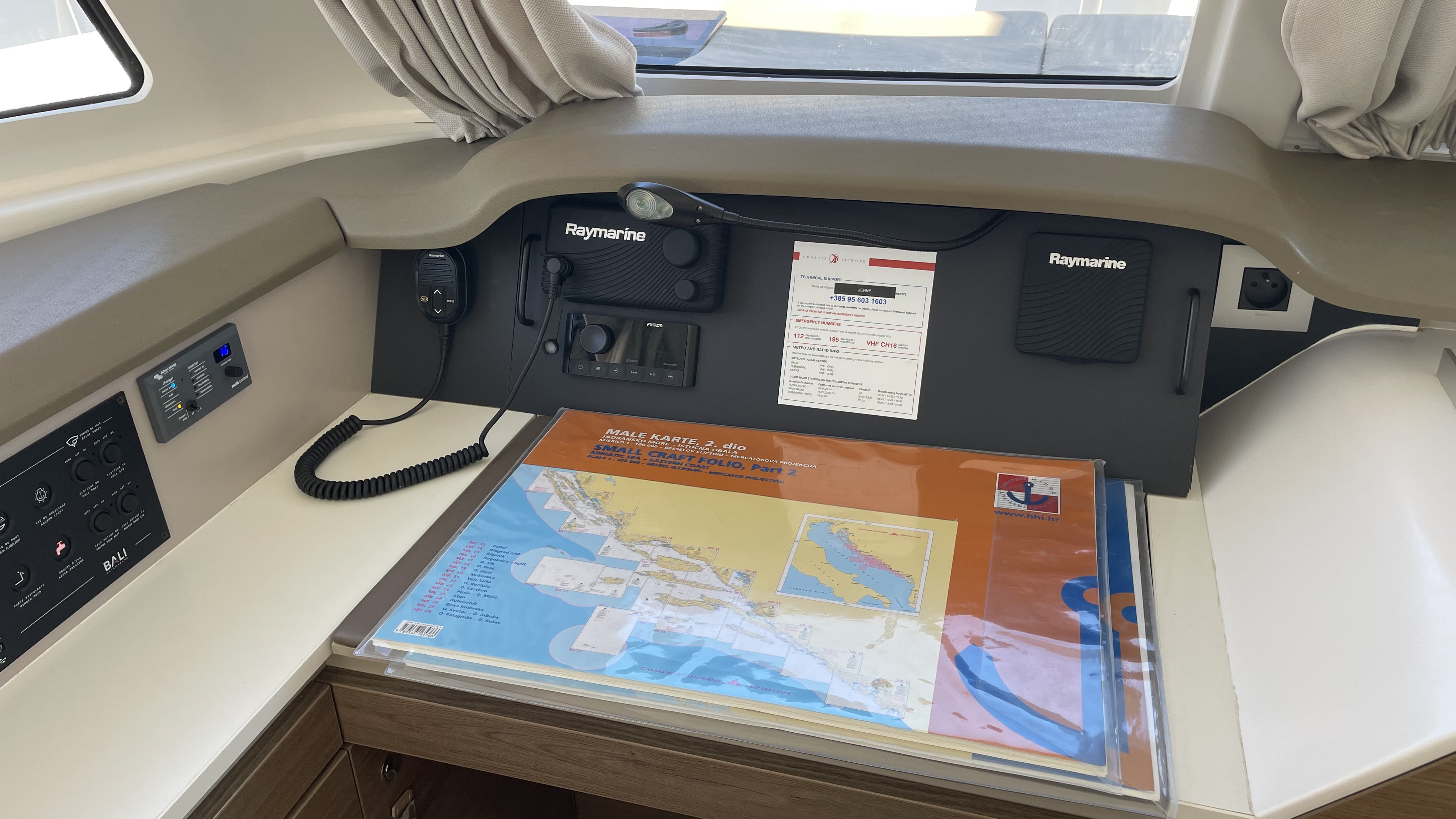 | Navigation | GPS mit Kartenplotter im Cockpit, Hafenhandbücher, Seekarten, Tridata (Log, Echolot, Windm.) |