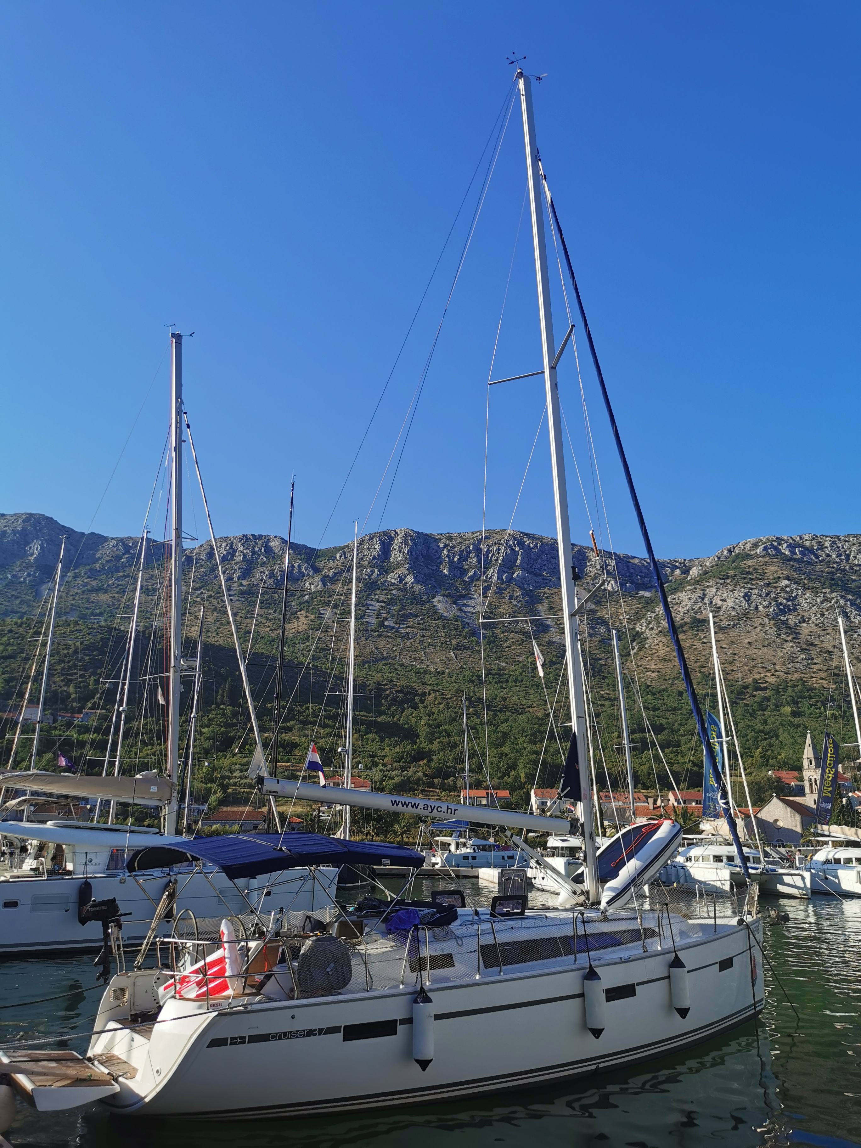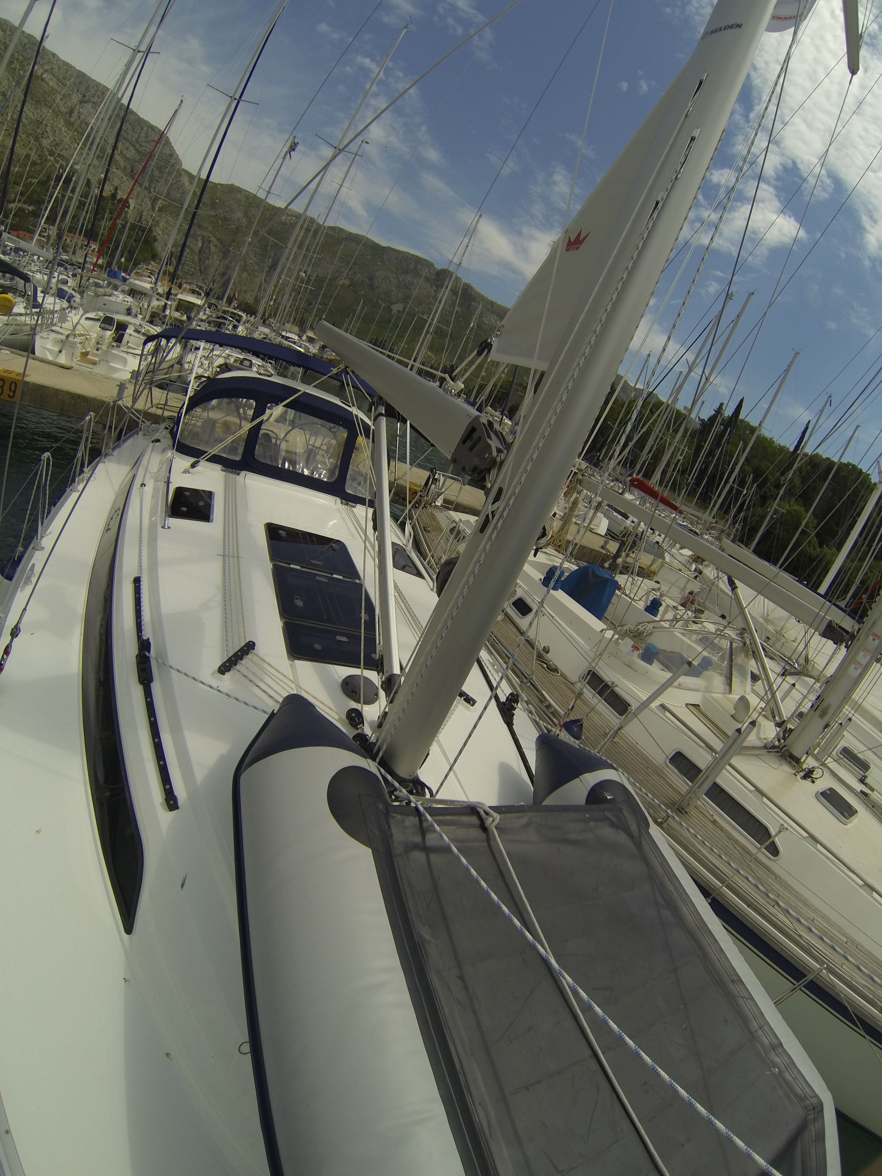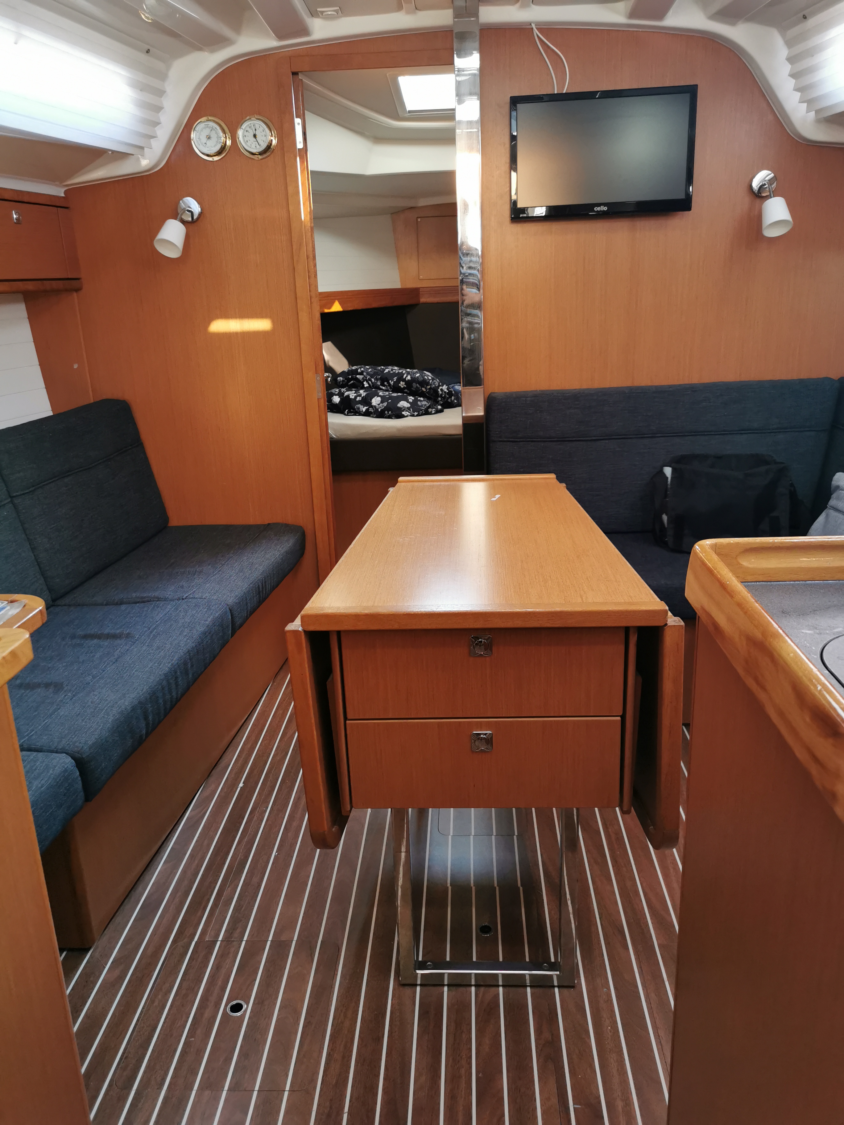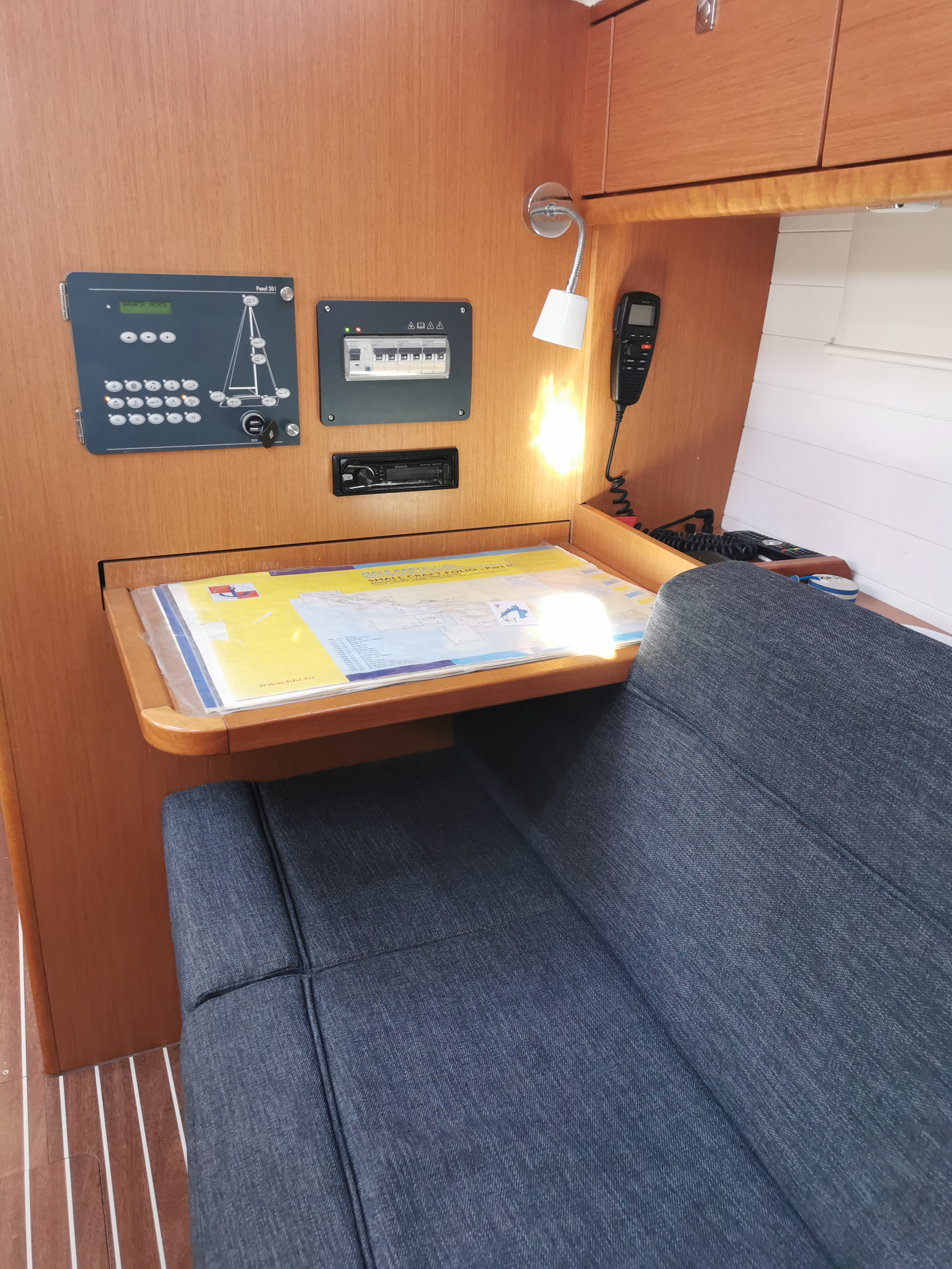 | Navigation | Barometer, Fernglas, GPS mit Kartenplotter im Cockpit, Hafenhandbücher, Handpeilkompass, Navigationsbesteck, Seekarten, Tridata (Log, Echolot, Windm.) |