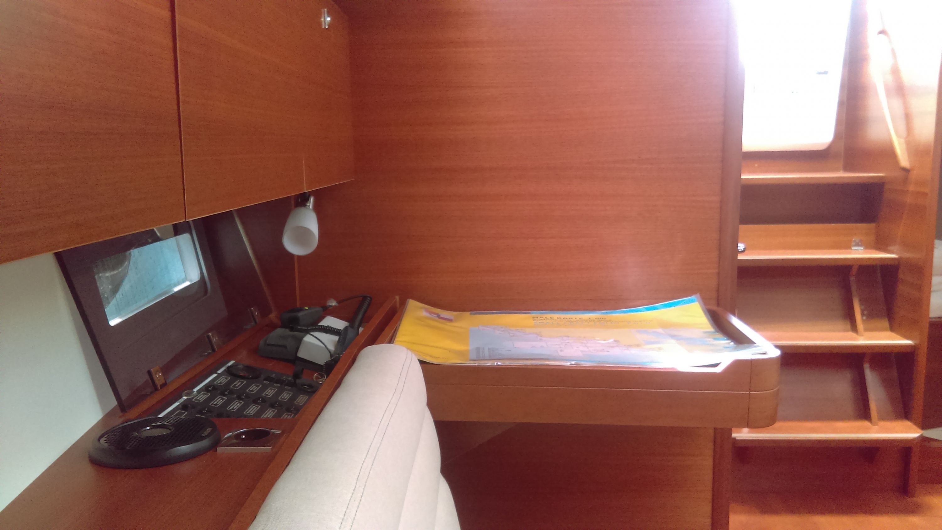| Navigation | Barometer, Fernglas, GPS mit Kartenplotter im Cockpit, Hafenhandbücher, Handpeilkompass, Navigationsbesteck, Seekarten, Tridata (Log, Echolot, Windm.) |