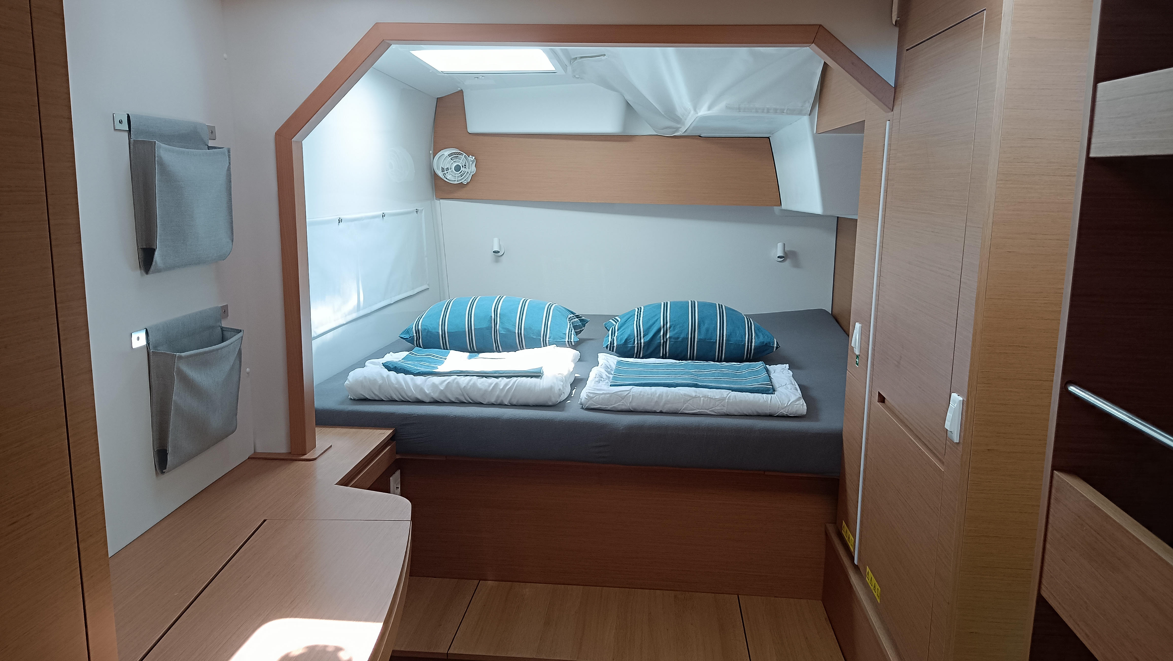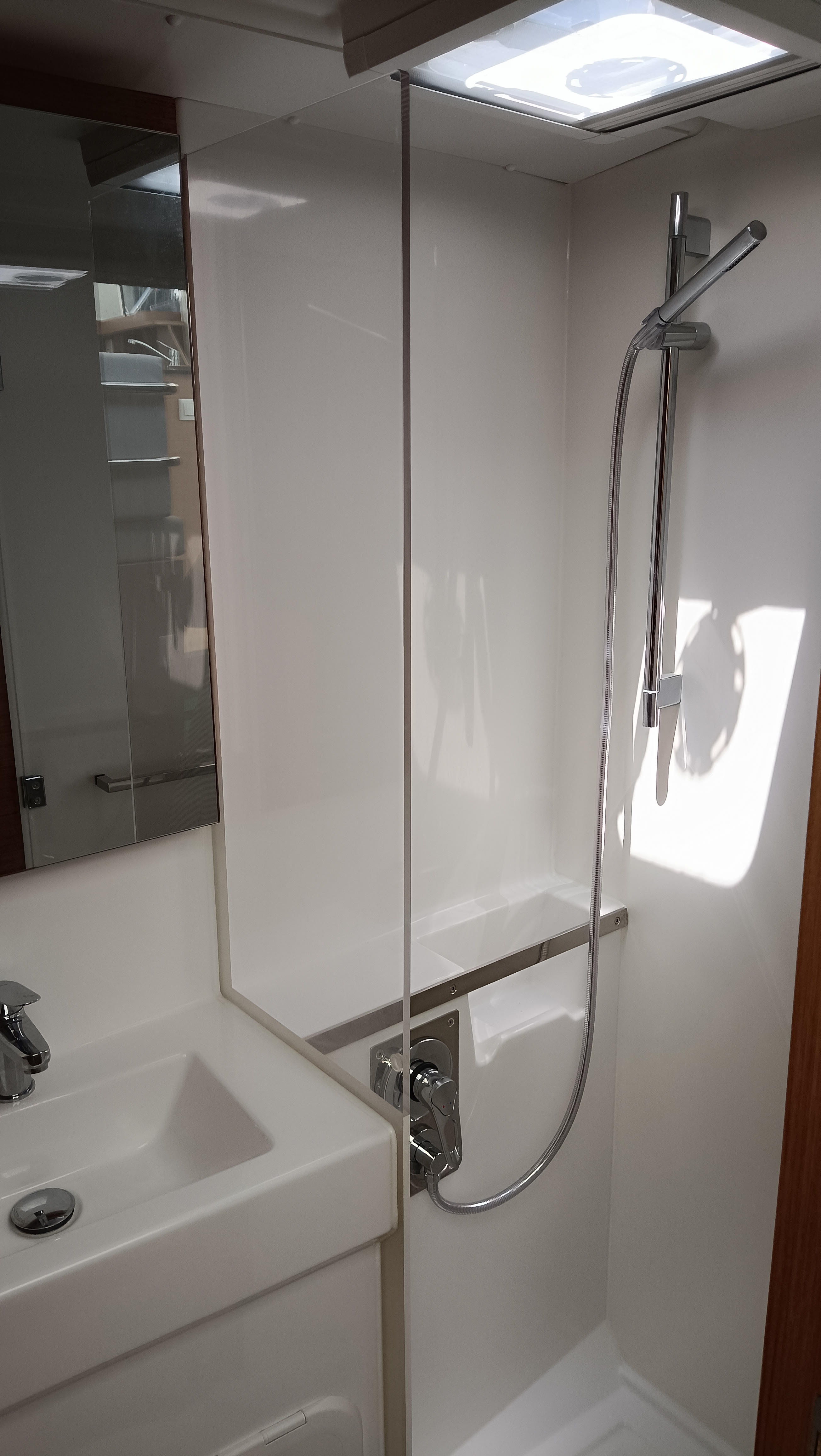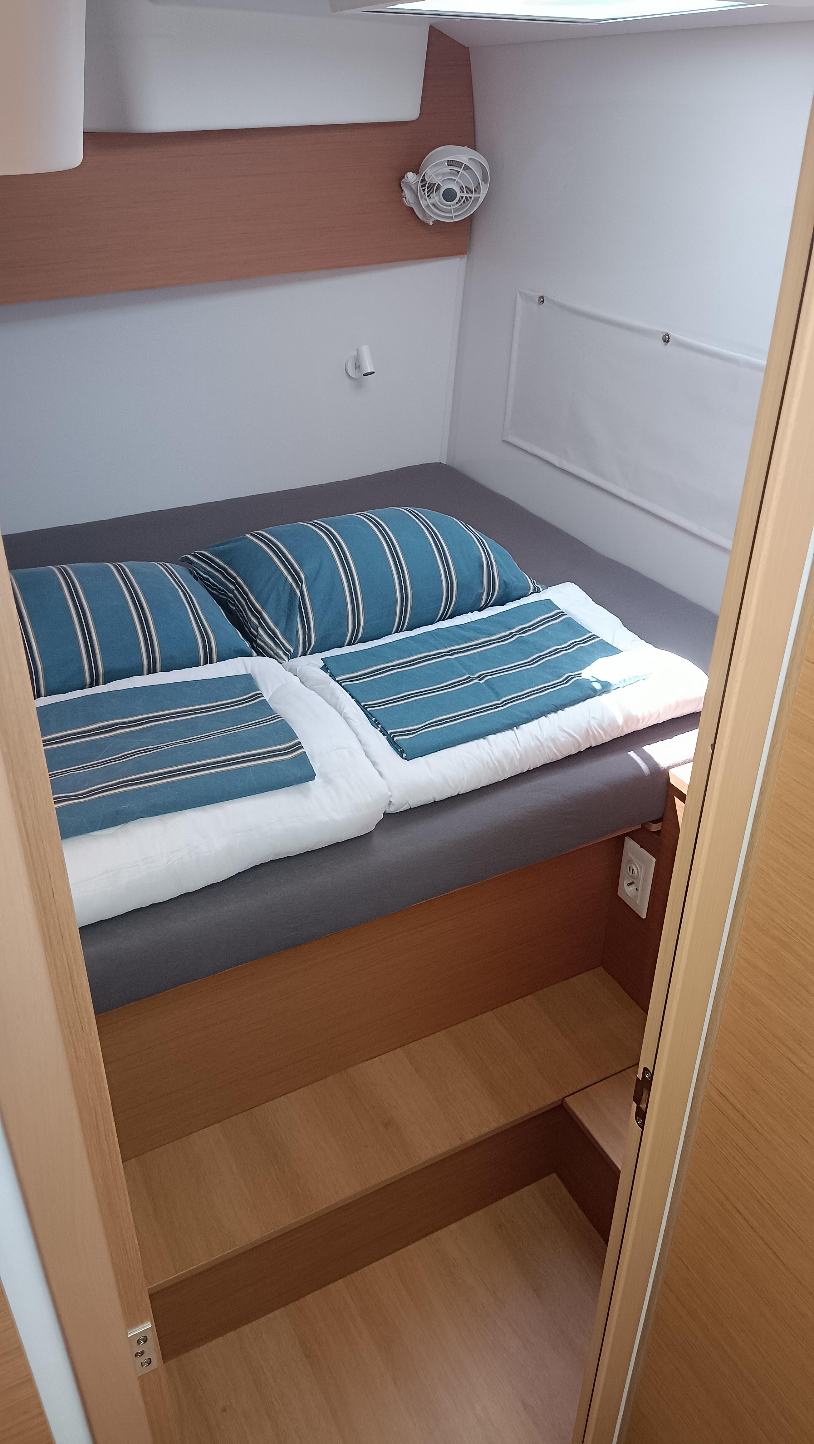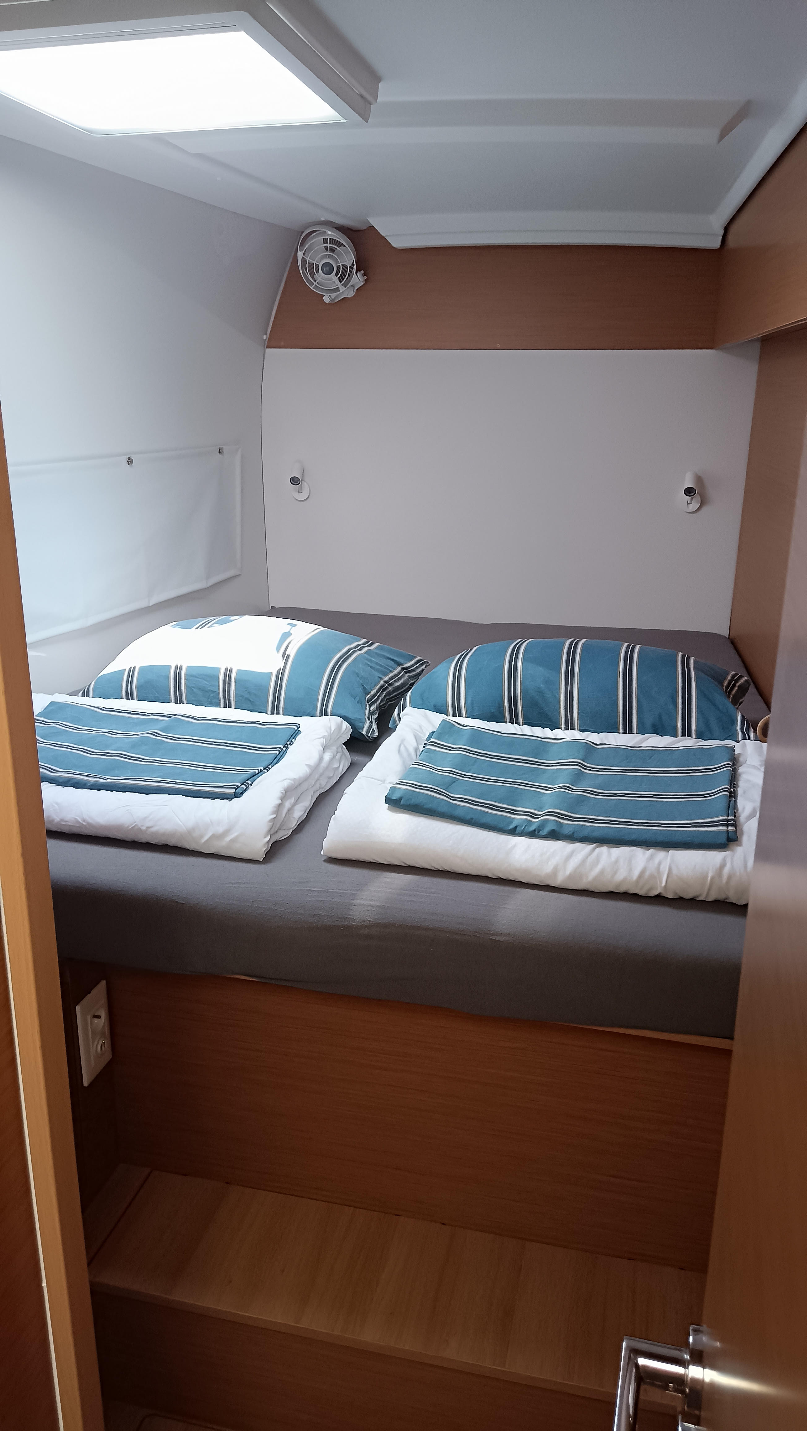 | Safety | AIS Empfänger, Bootsmannstuhl, Bordapotheke, Bordwerkzeug, elektr. Bilgepumpe, Feststoffschwimmwesten, Feuerlöscher, Navigationslichter, Nebelhorn, Notpinne, Notsignale, Radarreflektor, Taschenlampe, UKW-Funk, Zweitanker |