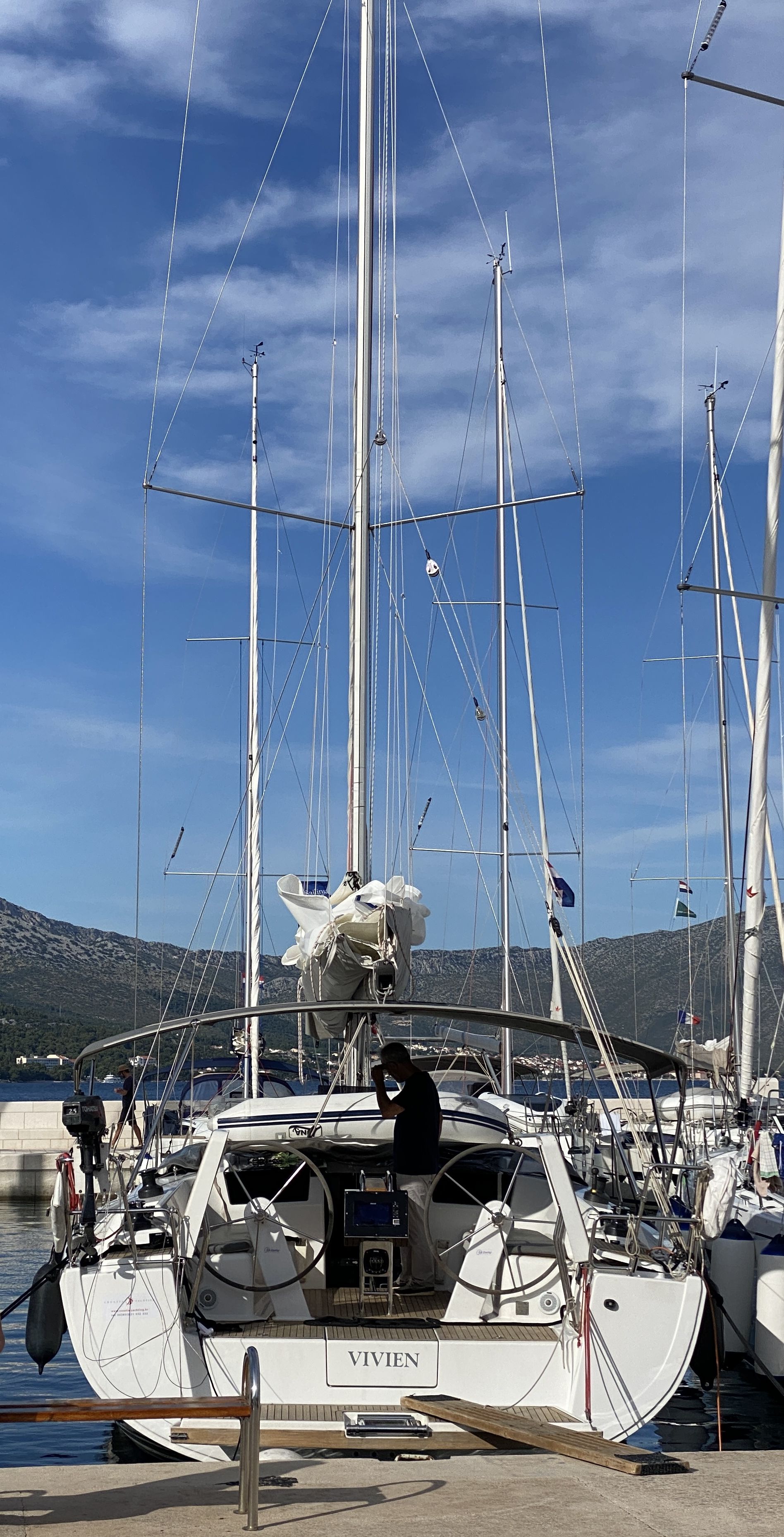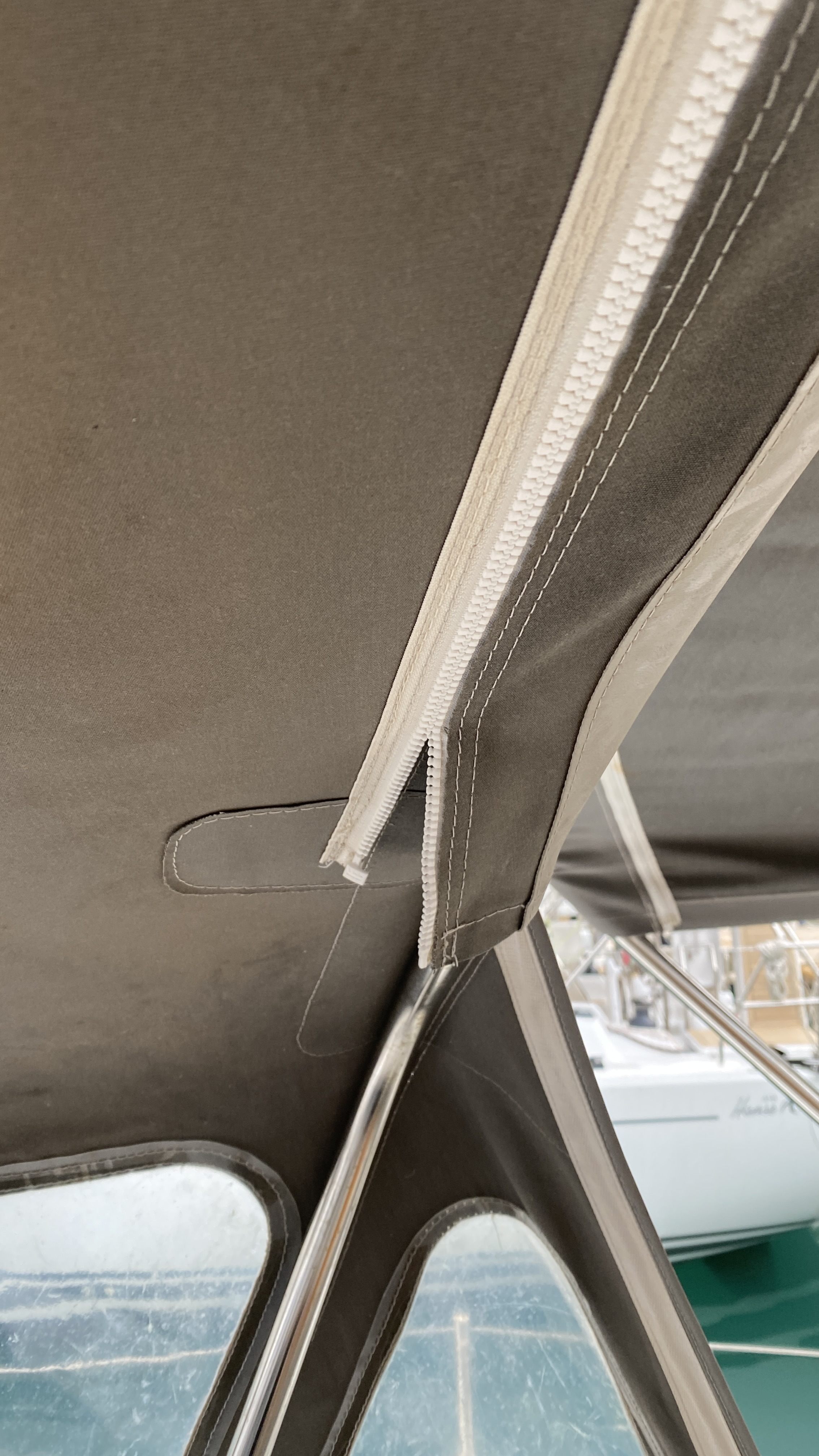 Fehler am Schiff: Reff 2 Leine zu kurz!! Sie zieht das Ende des Segels nach innen. Baum müsste tiefer gefahren werden, um ein schönes Segelprofil zu erreichen, Geht aber nicht, da es am Bimini ansteht.