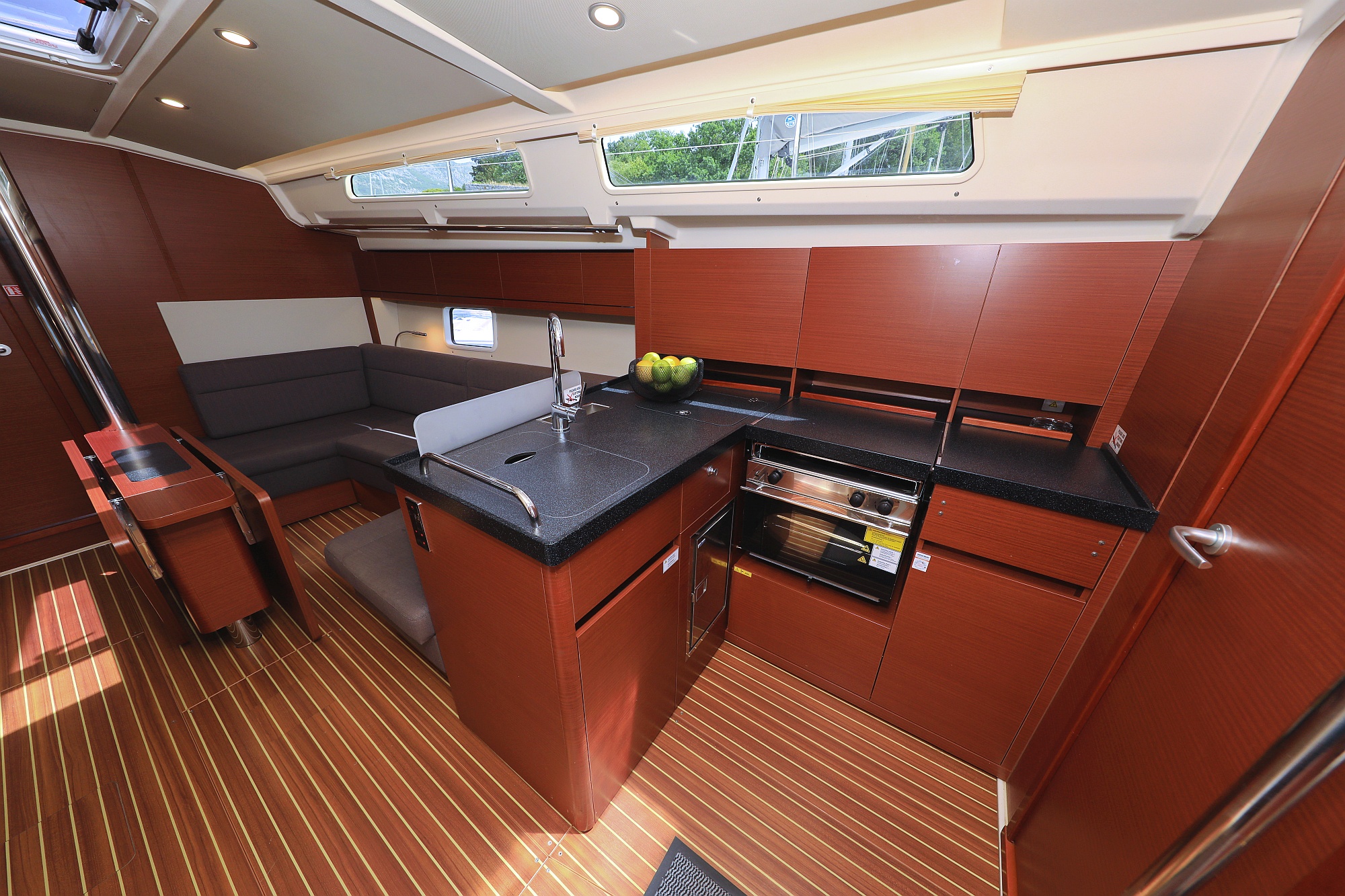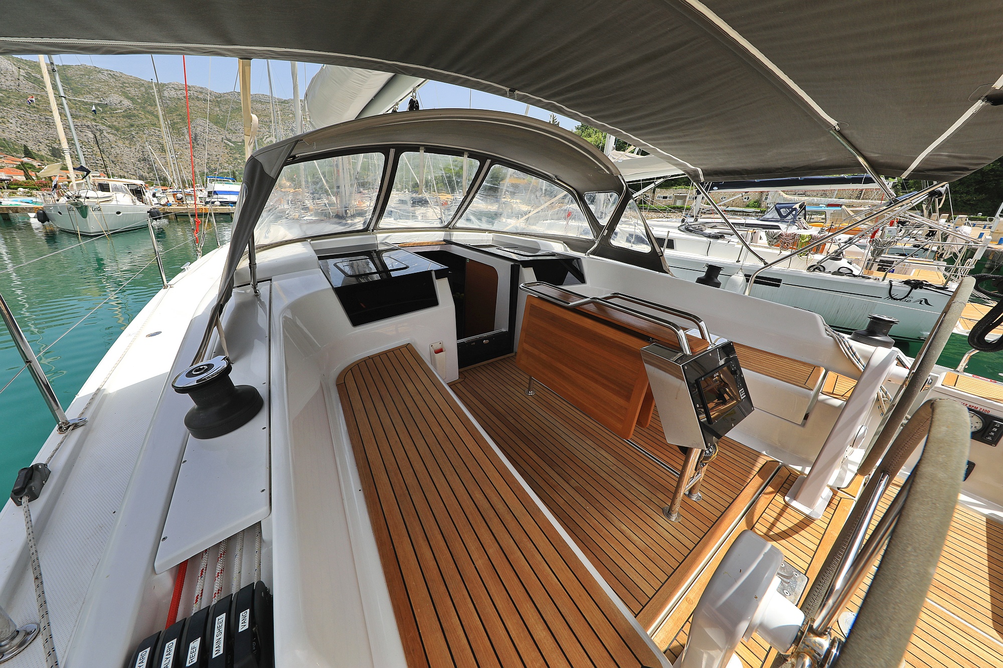 | Outside | Badeplattform, Biminitop, Cockpitdusche, Cockpitlautsprecher, Cockpittisch, elektr. Ankerwinsch, Sprayhood, Teak im Cockpit |