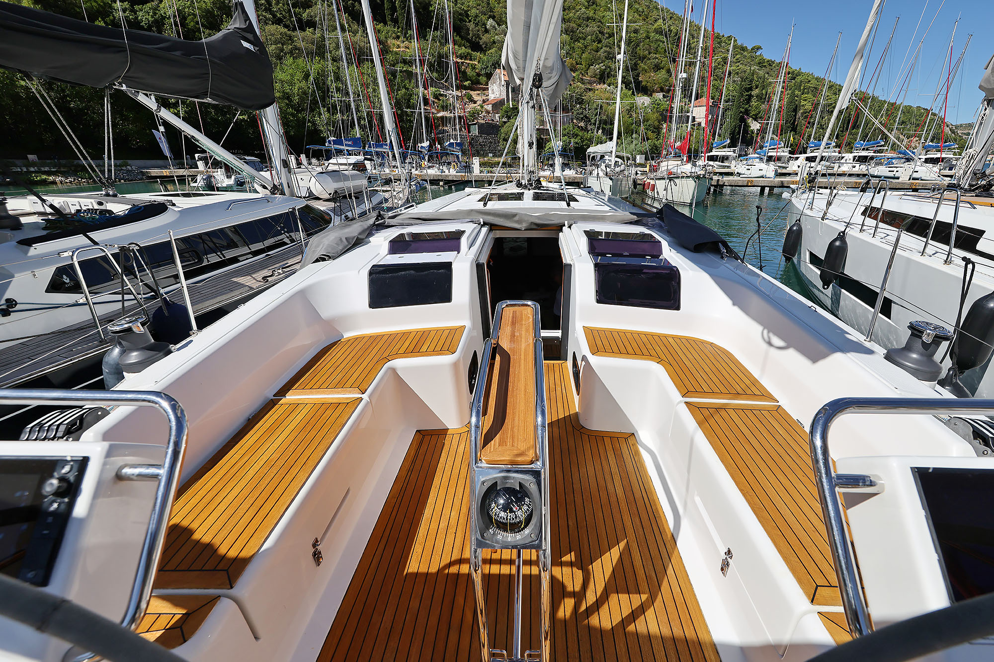 | Outside | Badeplattform, Biminitop, Cockpitdusche, Cockpitlautsprecher, Cockpittisch, elektr. Ankerwinsch, Sprayhood, Teak im Cockpit |