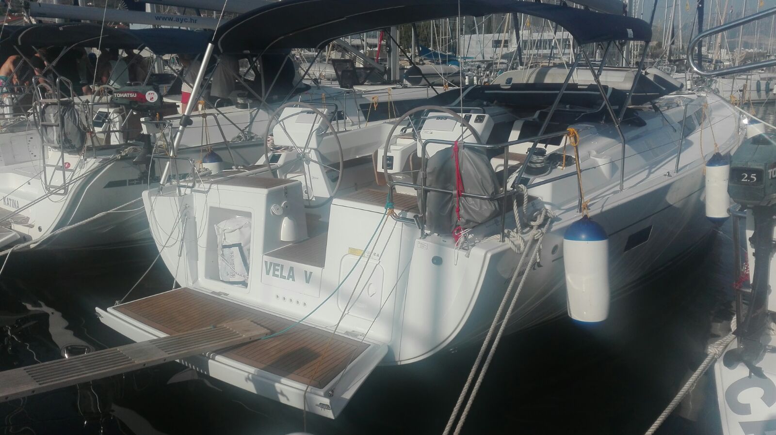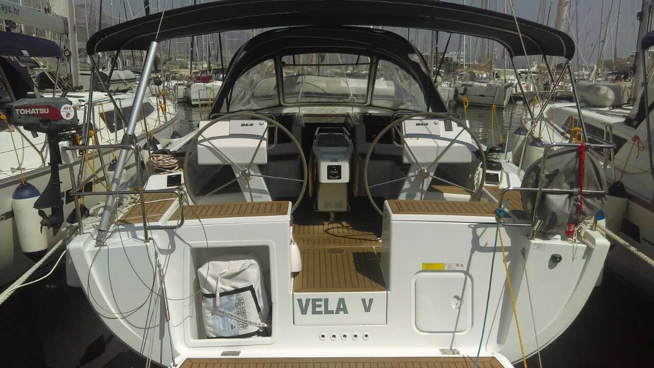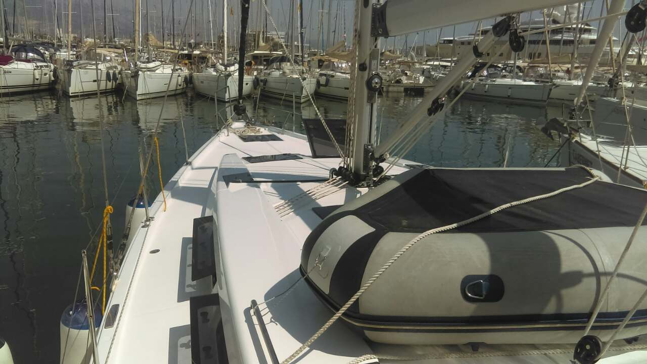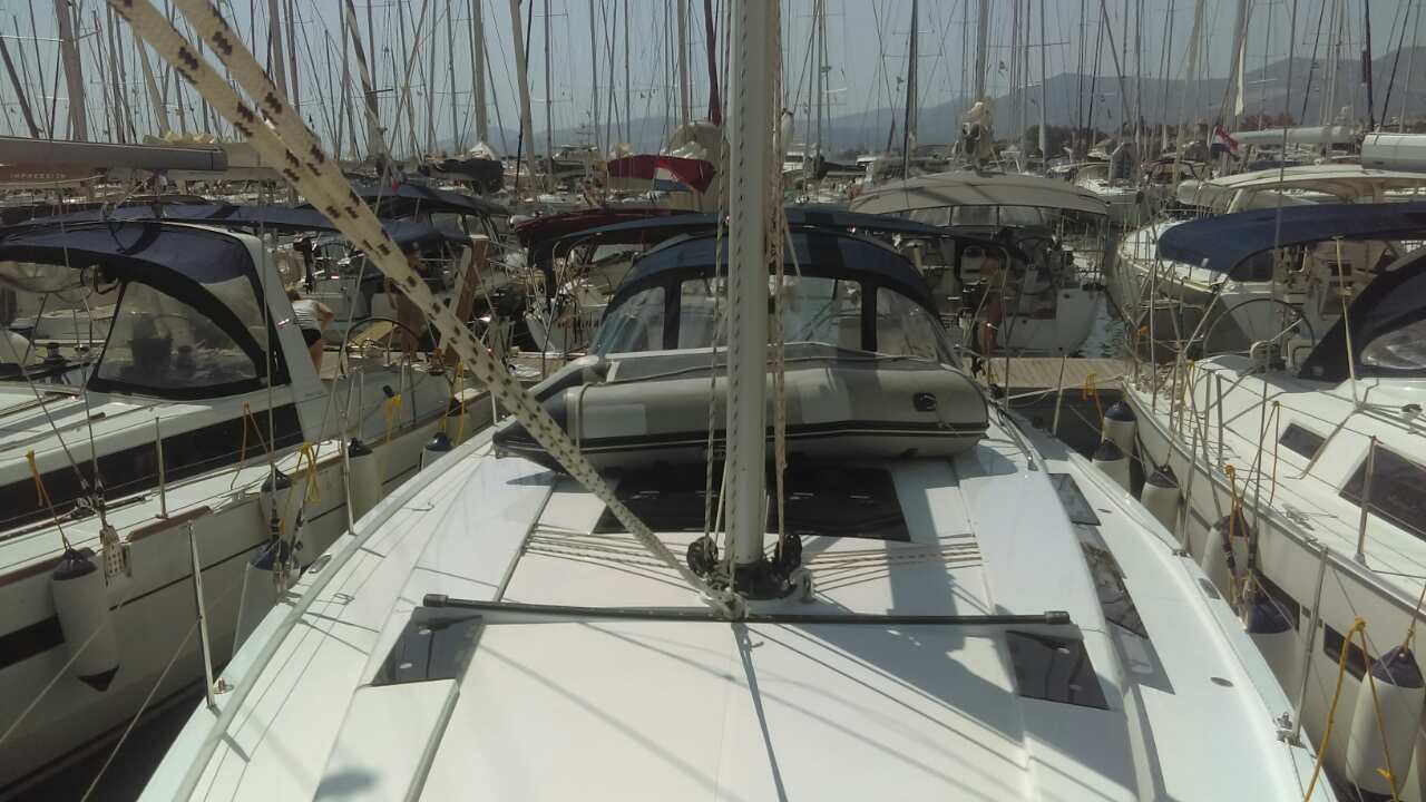 | Outside | Anker mit Kette, Ankerwinsch, Badeplattform, Biminitop, Bootshaken, Cockpitdusche, Cockpitlautsprecher, Deckbürste, Dieselkanister , elektr. Ankerwinsch, Fender, Fernsteuerung für elektr. Ankerwinsch, Gangway, Kunststoff-Eimer (Pütz), Sprayhood, Wasserkanister , Wasserschlauch, Windex |