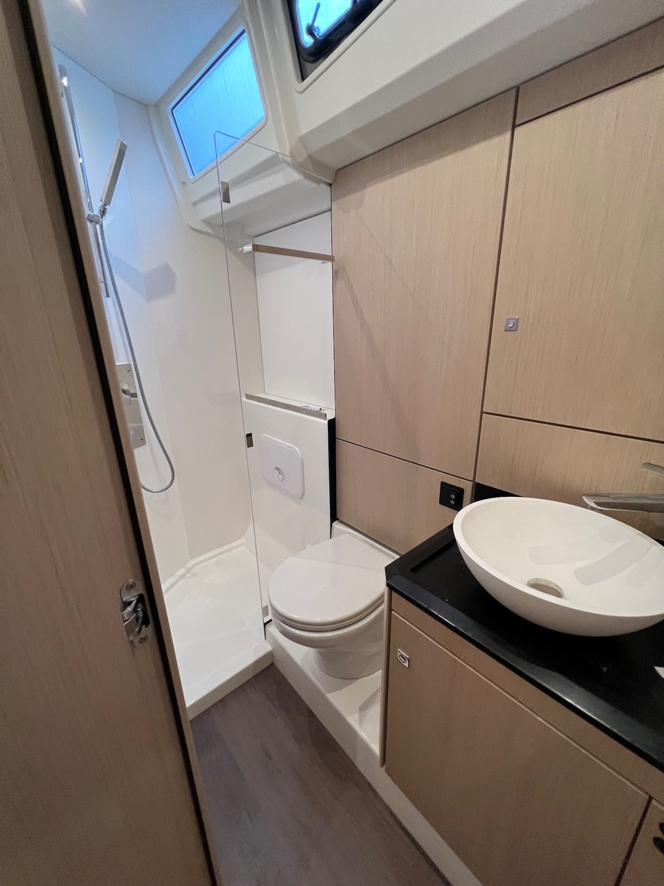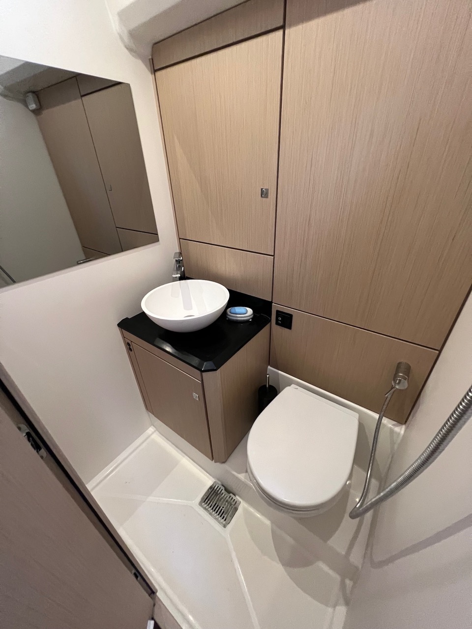| Outside | 220 V-Landanschluss, Anker mit Kette, Badeleiter, Biminitop, Bugspriet, Cockpitdusche, Cockpitlautsprecher, Cockpitpolster, Cockpittisch, elektr. Ankerwinsch, elektr. Winsch, Fender, Fernsteuerung für elektr. Ankerwinsch, Festmacherleinen, Lifeline System, Solaranlage, Sprayhood, Teak im Cockpit, Windex |