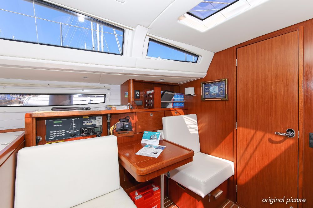 | Navigation | Barometer, Fernglas, Fernglas mit Peilkompass, GPS mit Kartenplotter im Cockpit, Hafenhandbücher, Handpeilkompass, Navigationsbesteck, Seekarten, Tridata (Log, Echolot, Windm.) |