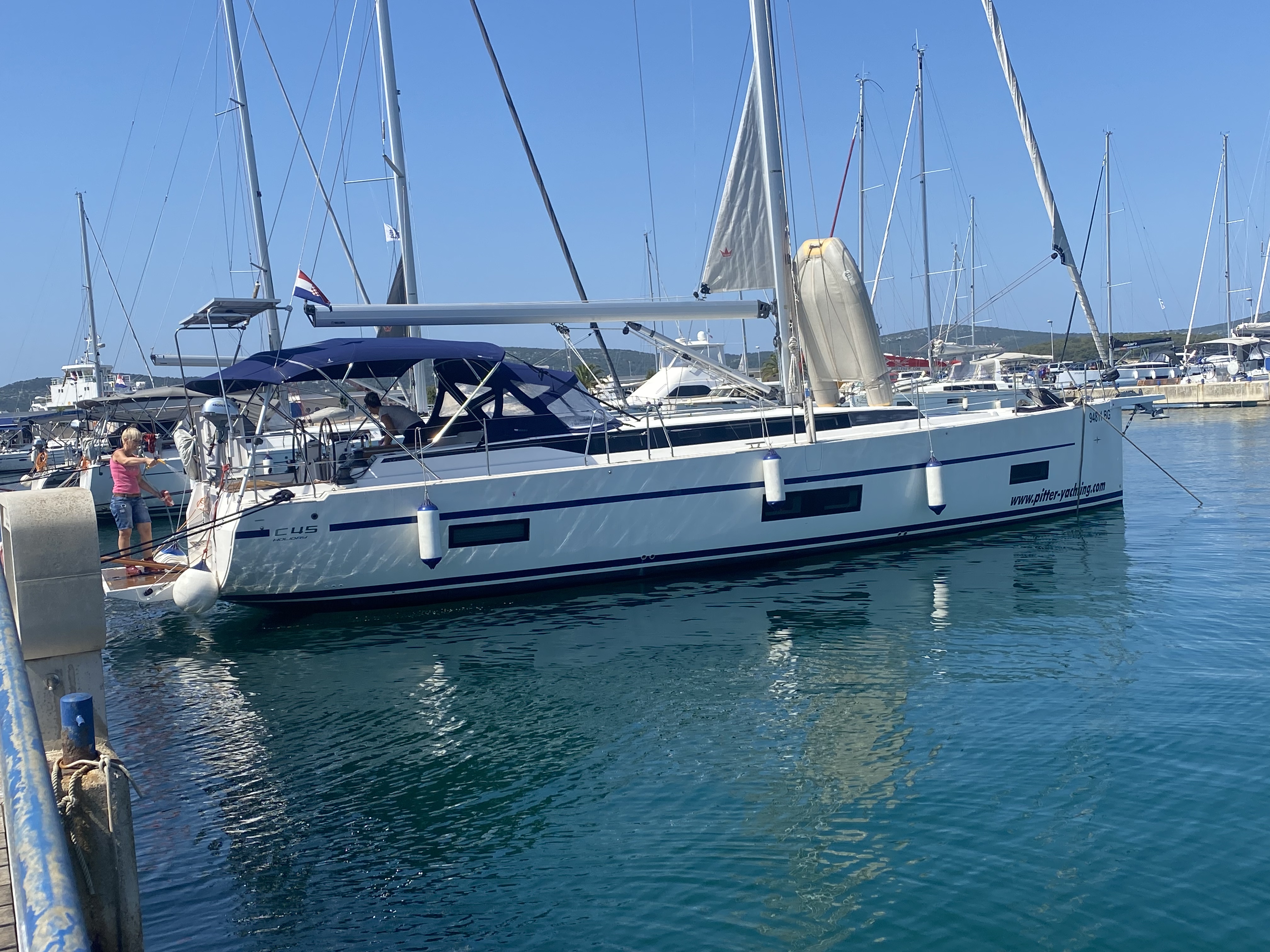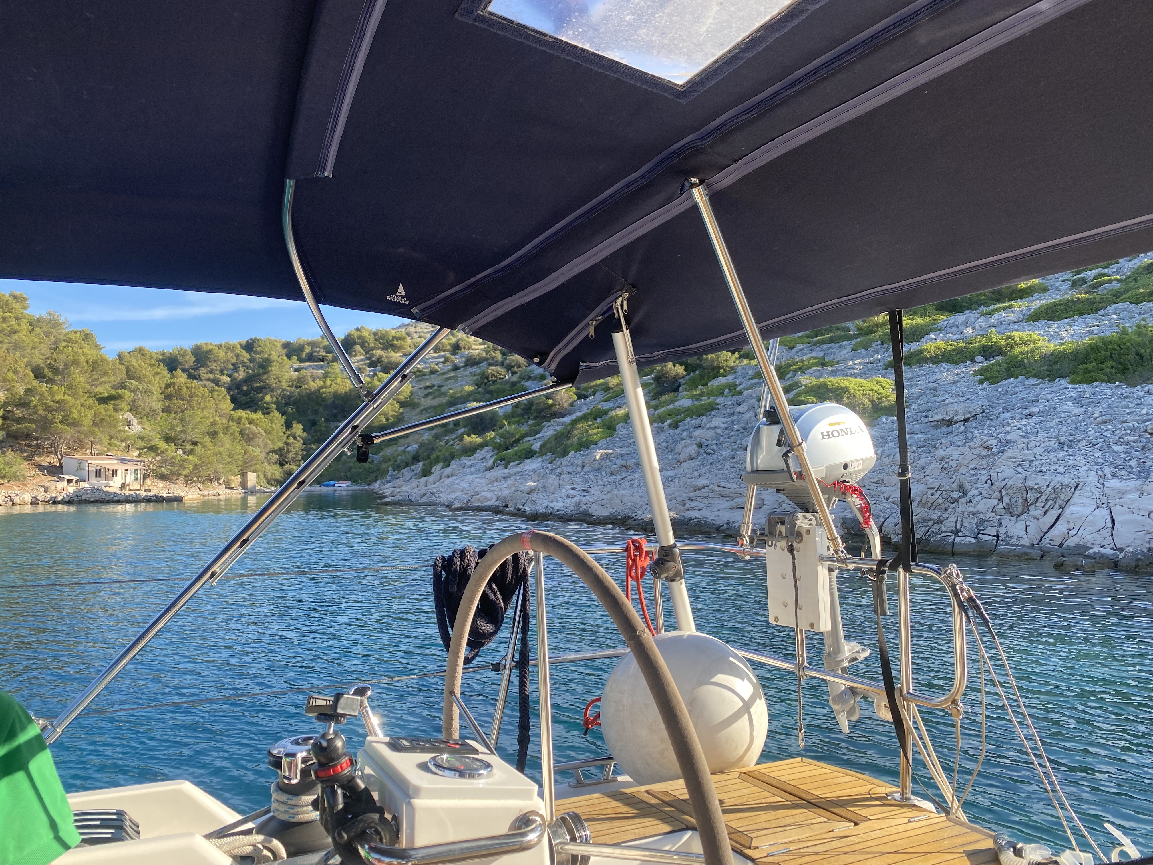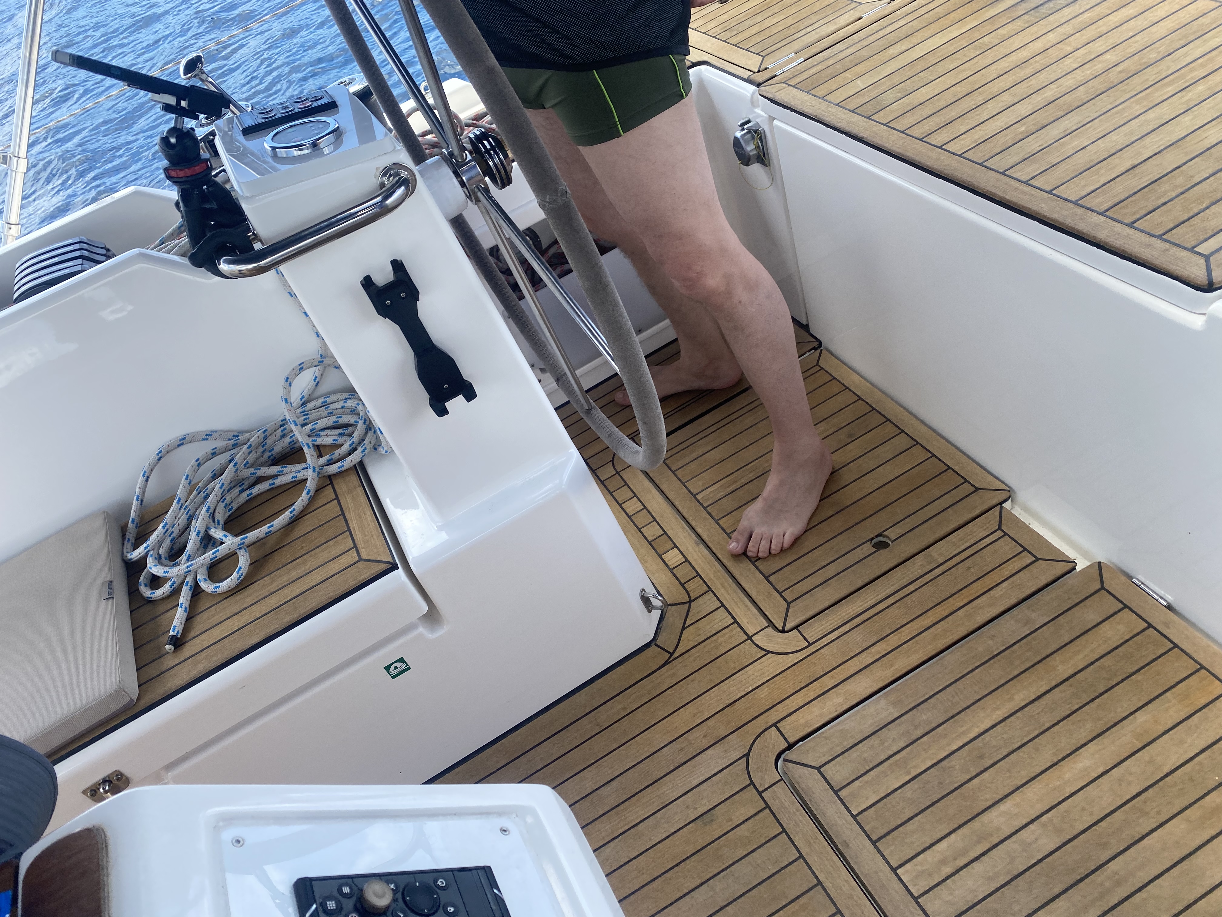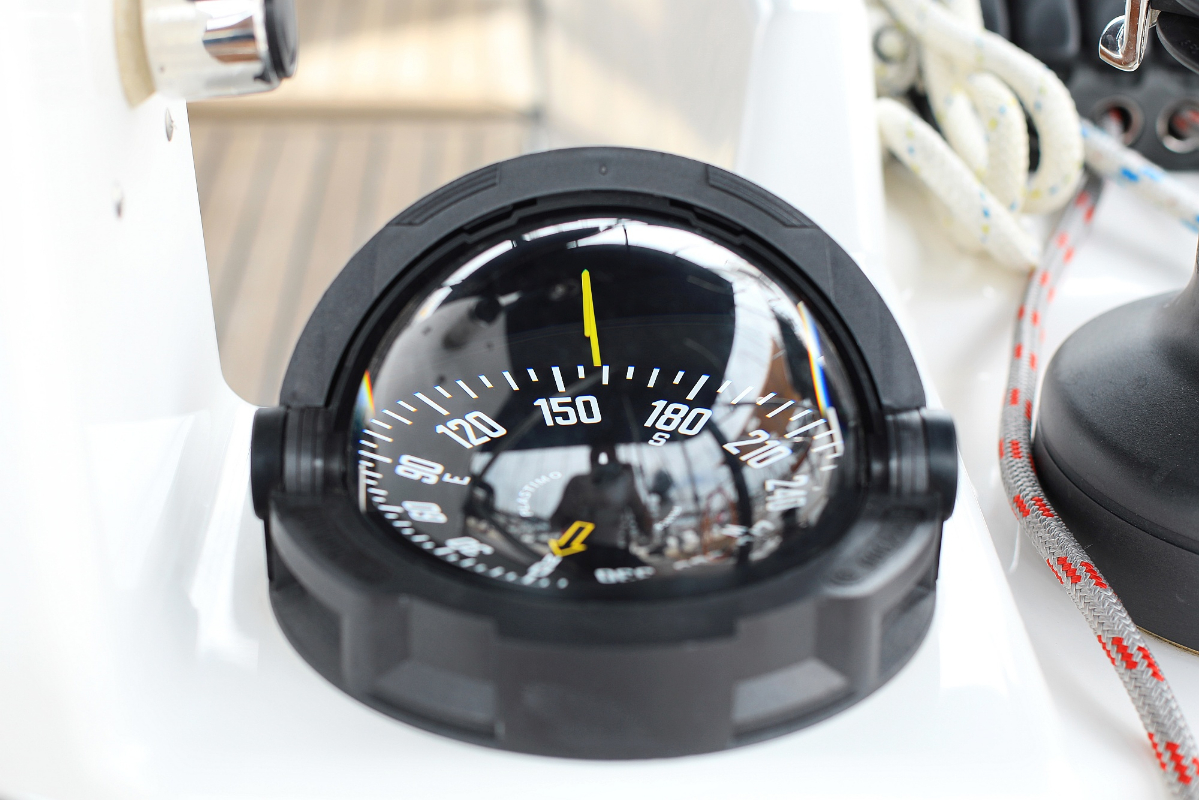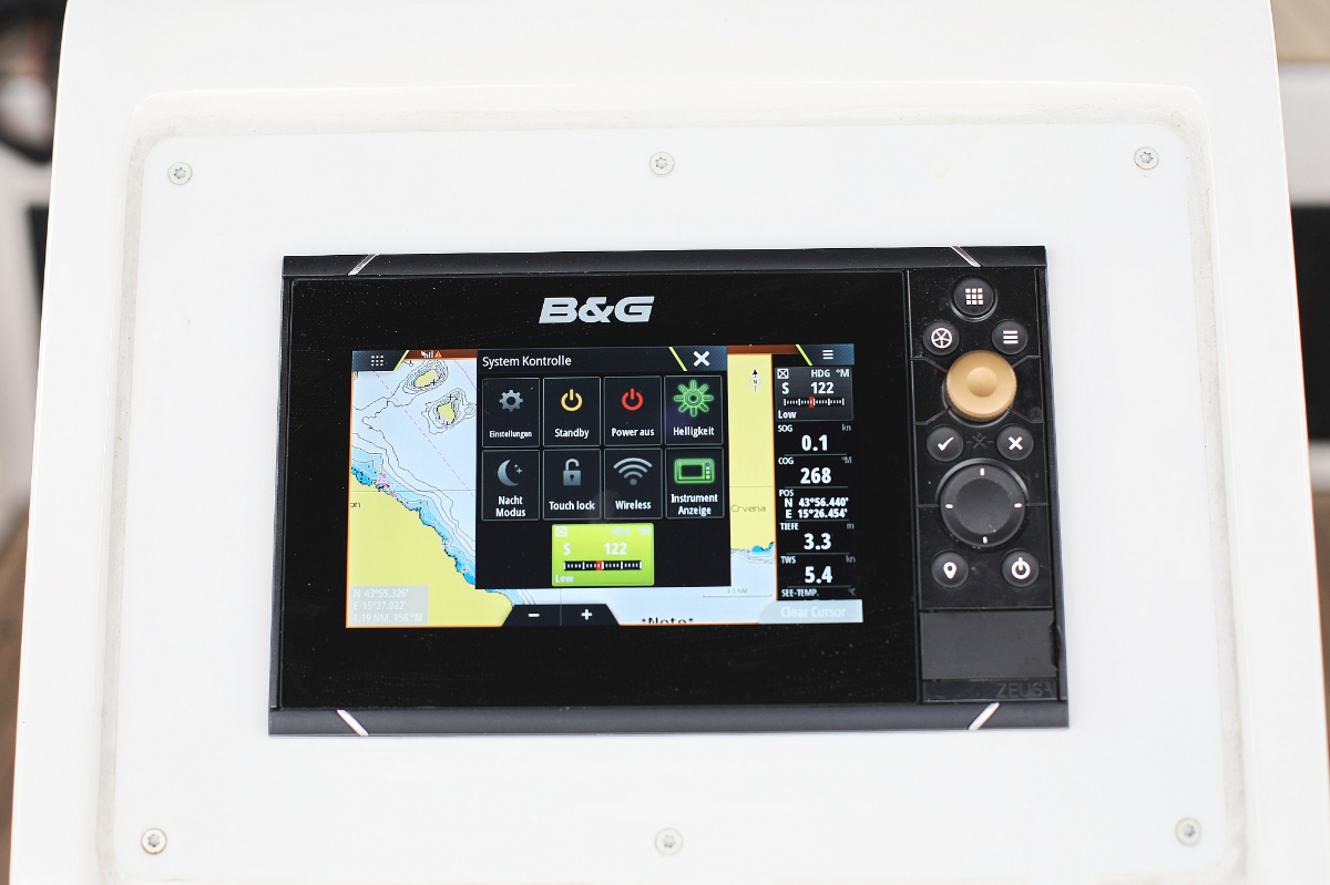 | Navigation | Barometer, Fernglas mit Peilkompass, GPS mit Kartenplotter im Cockpit, Hafenhandbücher, Navigationsbesteck, Seekarten, Tridata (Log, Echolot, Windm.) |