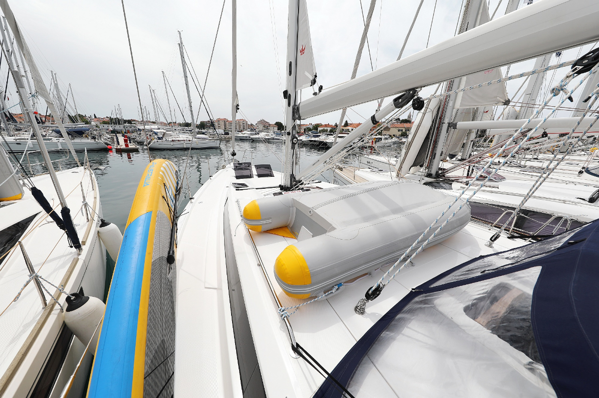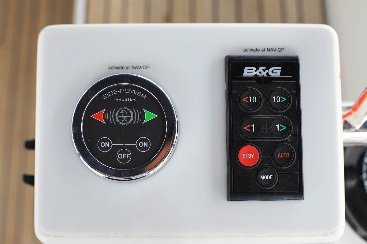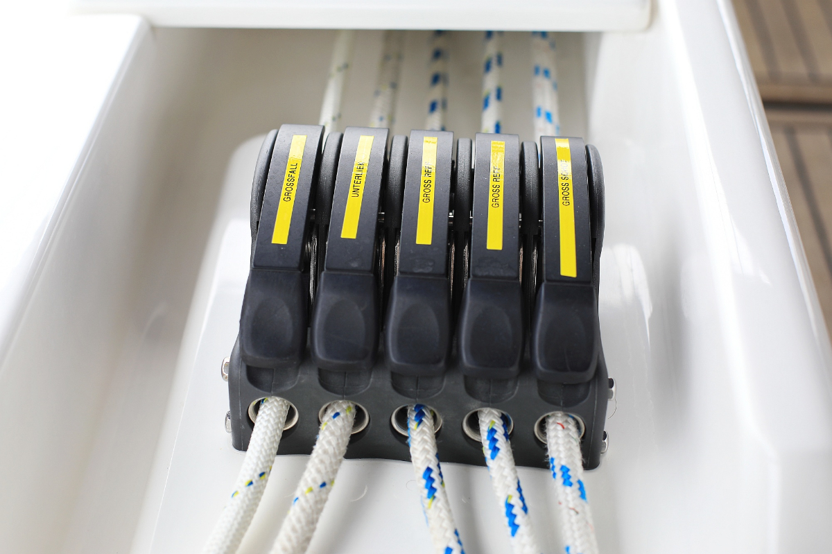 | Safety | Automatikwesten, Autopilot, Blitzboje, Bootsmannstuhl, Bordapotheke, Bordwerkzeug, Bugstrahlruder, Feuerlöscher, Lifebelts, Motor-Ersatzteile, Nebelhorn, Notsignale, Radarreflektor, Reparaturset für Beiboot, Rettungsinsel, Suchscheinwerfer, Taschenlampe, UKW-Funk mit AIS, Zweitanker |