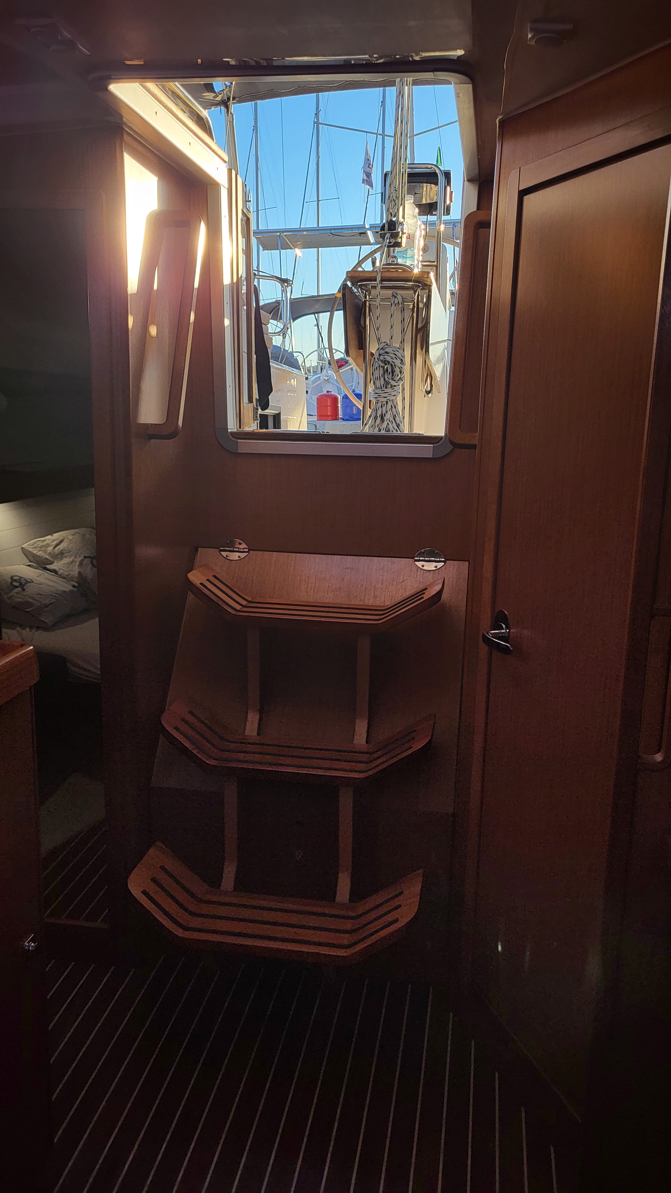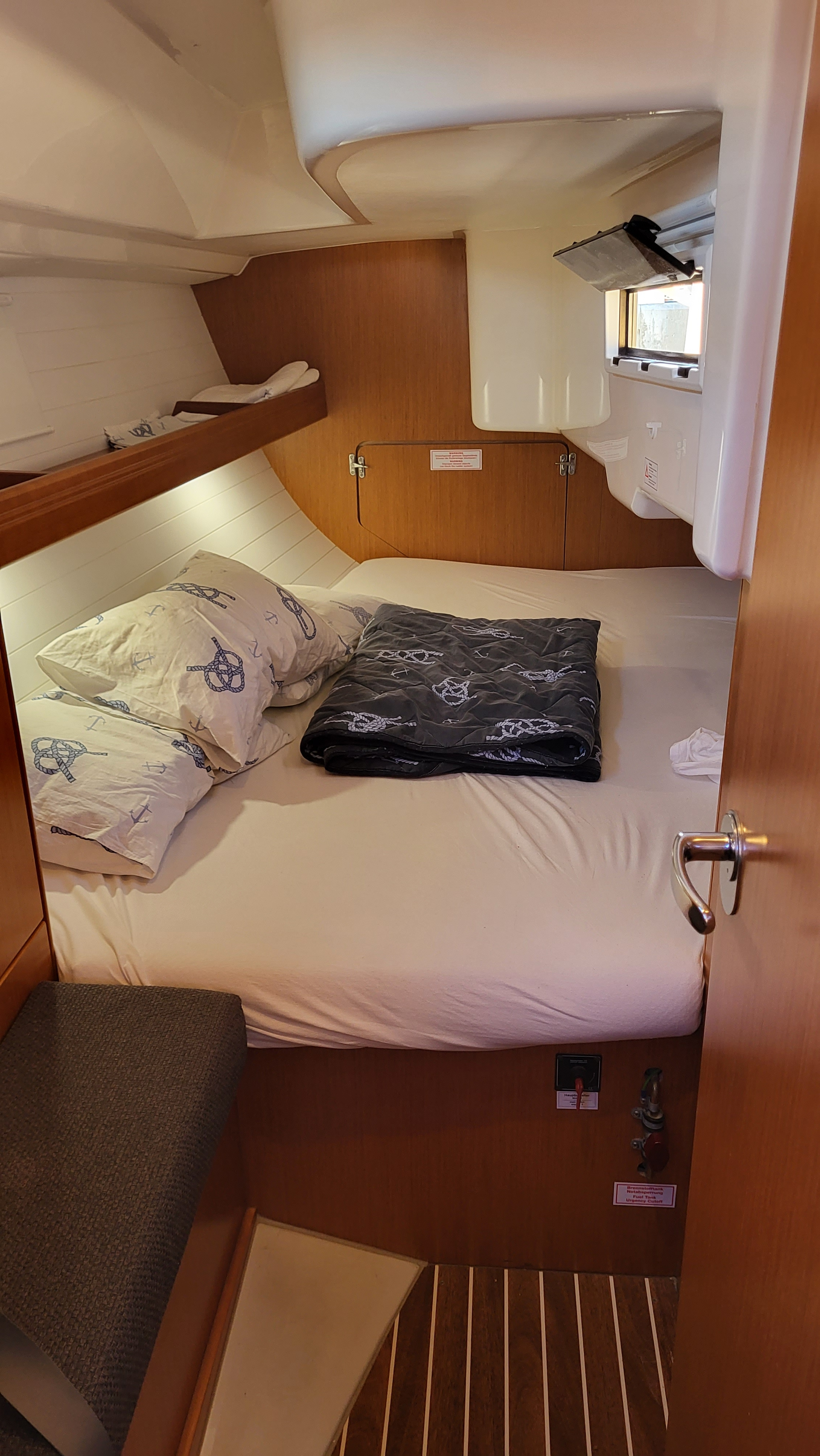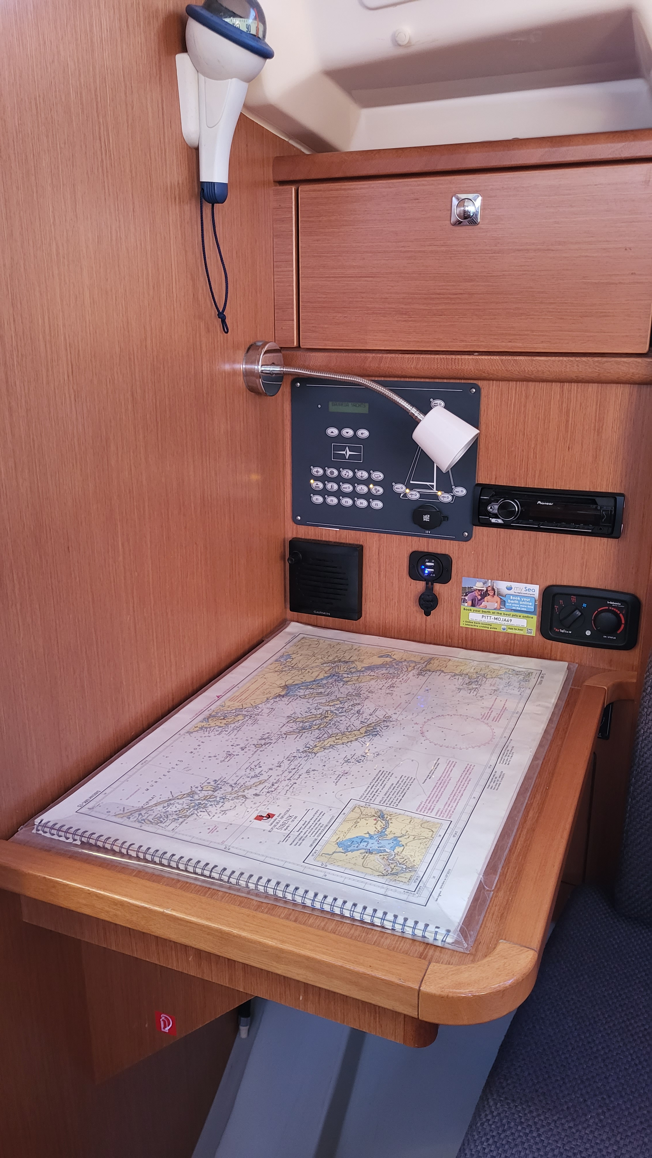 | Navigation | Barometer, Echolot, Fernglas mit Peilkompass, GPS mit Kartenplotter im Cockpit, Hafenhandbücher, Handpeilkompass, Navigationsbesteck, Seekarten, Tridata (Log, Echolot, Windm.) |