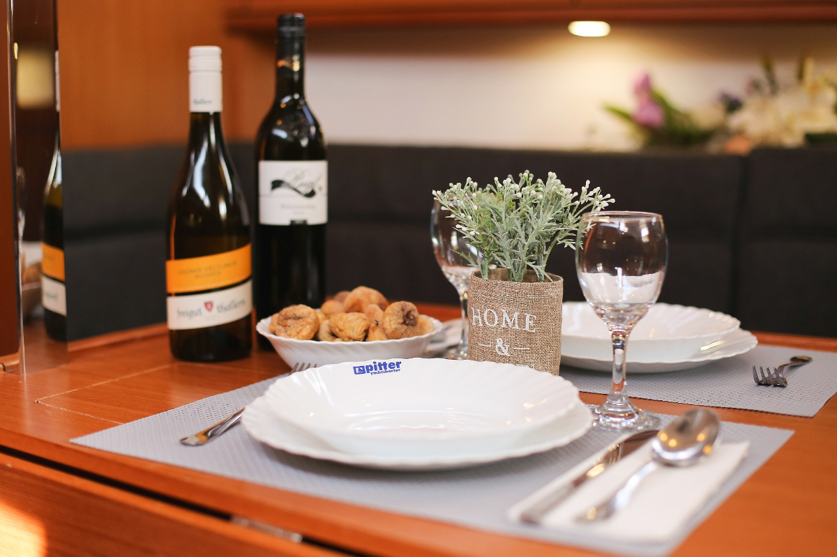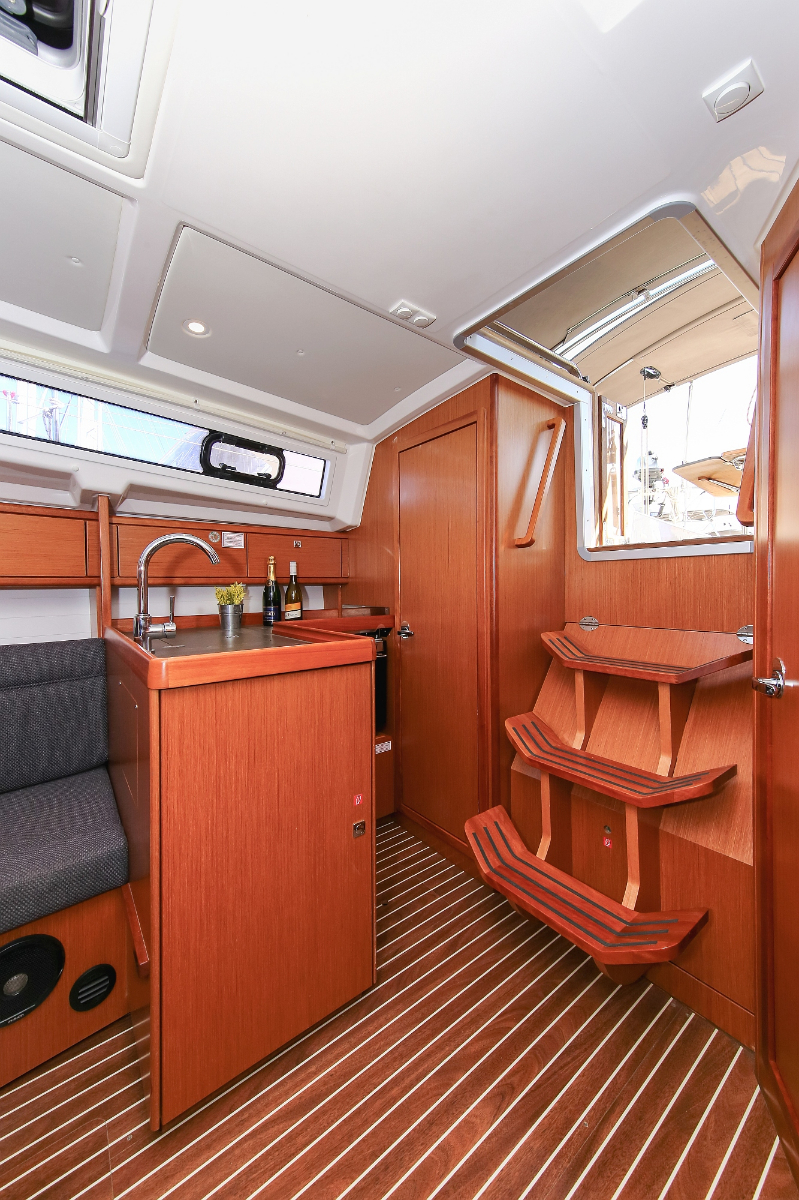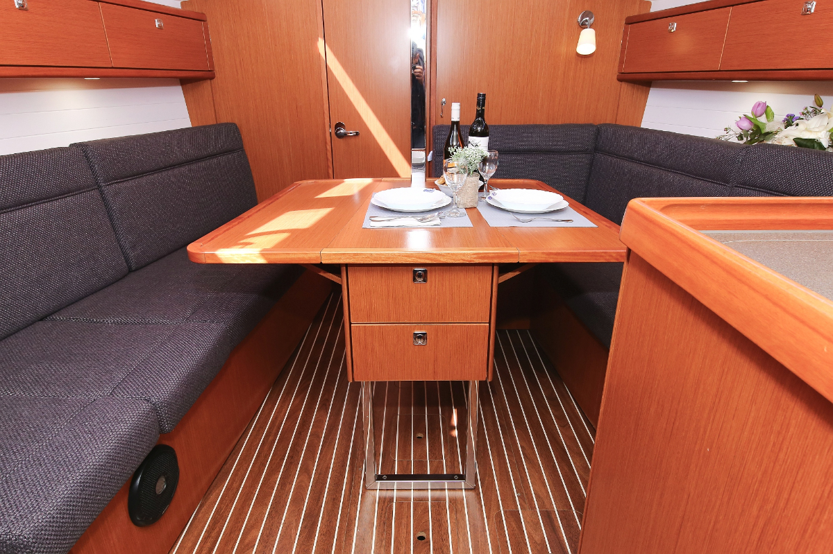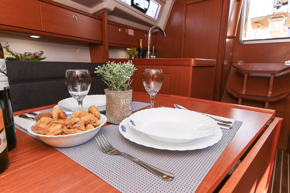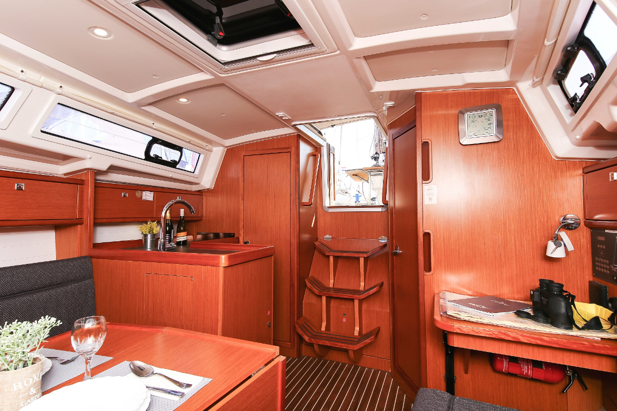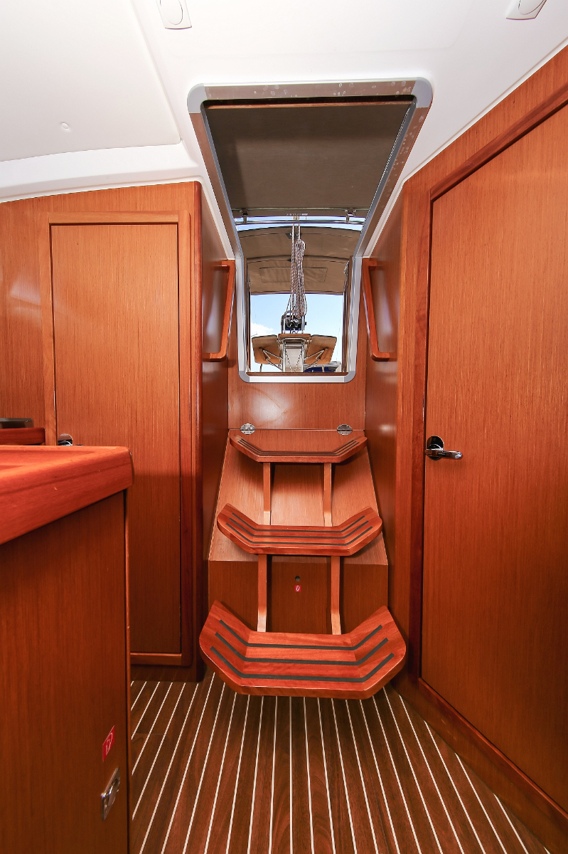 | Navigation | Barometer, Fernglas mit Peilkompass, GPS mit Kartenplotter im Cockpit, Hafenhandbücher, Navigationsbesteck, Seekarten, Tridata (Log, Echolot, Windm.) |