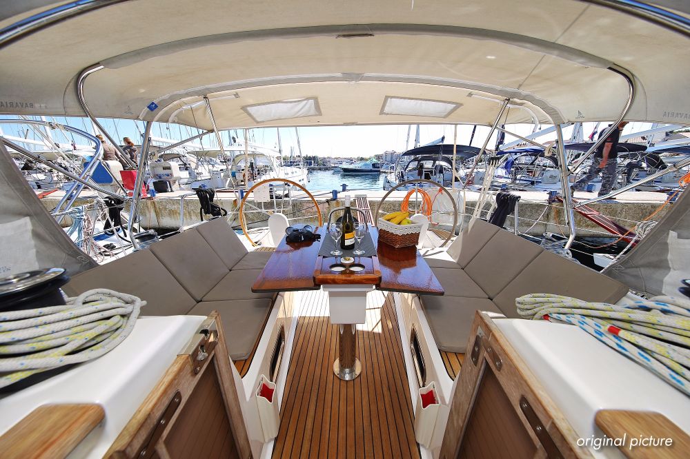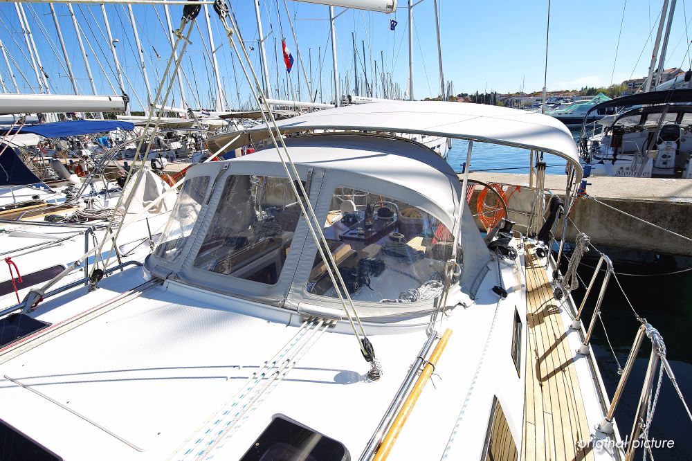 | Outside | 220 V-Landanschluss, Anker mit Kette, Ankerwinsch, Badeplattform, Biminitop, Bootshaken, Cockpitdusche, Cockpitpolster, Cockpittisch, Dieselkanister , elektr. Ankerwinsch, Faltsteuerrad, Fender, Festmacherleinen, Gangway, Kugelfender, Kunststoff-Eimer (Pütz), Solaranlage, Sprayhood, Teak im Cockpit, Teakdeck, Wantenschneider, Wasserkanister , Wasserschlauch, Windex |