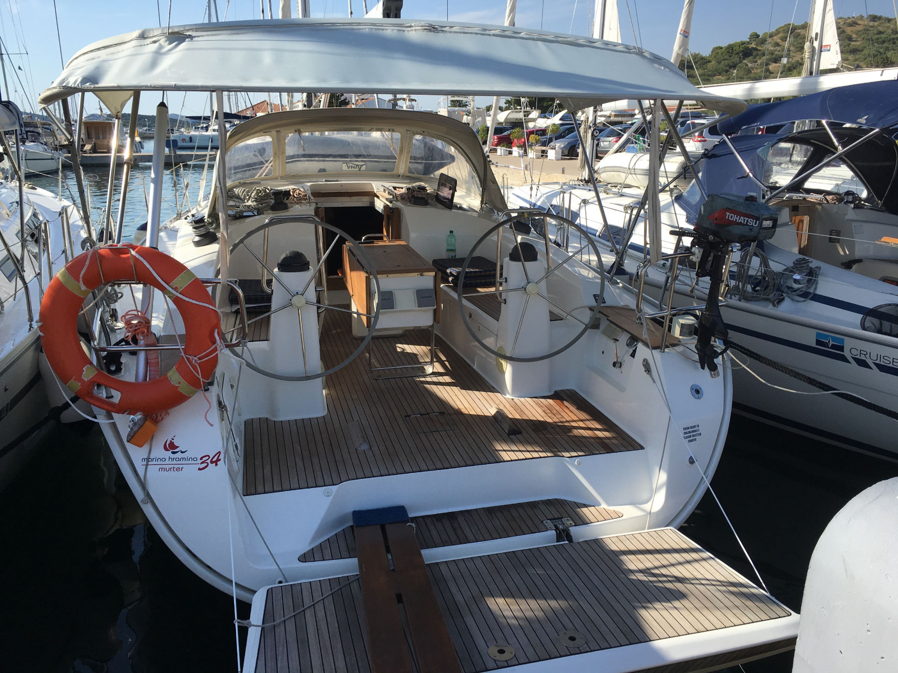 | Outside | 220 V-Landanschluss, Anker mit Kette, Badeleiter, Badeplattform, Biminitop, Bootshaken, Cockpitdusche, Cockpitpolster, Cockpittisch, Deckbürste, Dieselkanister , elektr. Ankerwinsch, Fender, Festmacherleinen, Gangway, Kunststoff-Eimer (Pütz), Sprayhood, Teak im Cockpit, Wasserschlauch, Winschen |