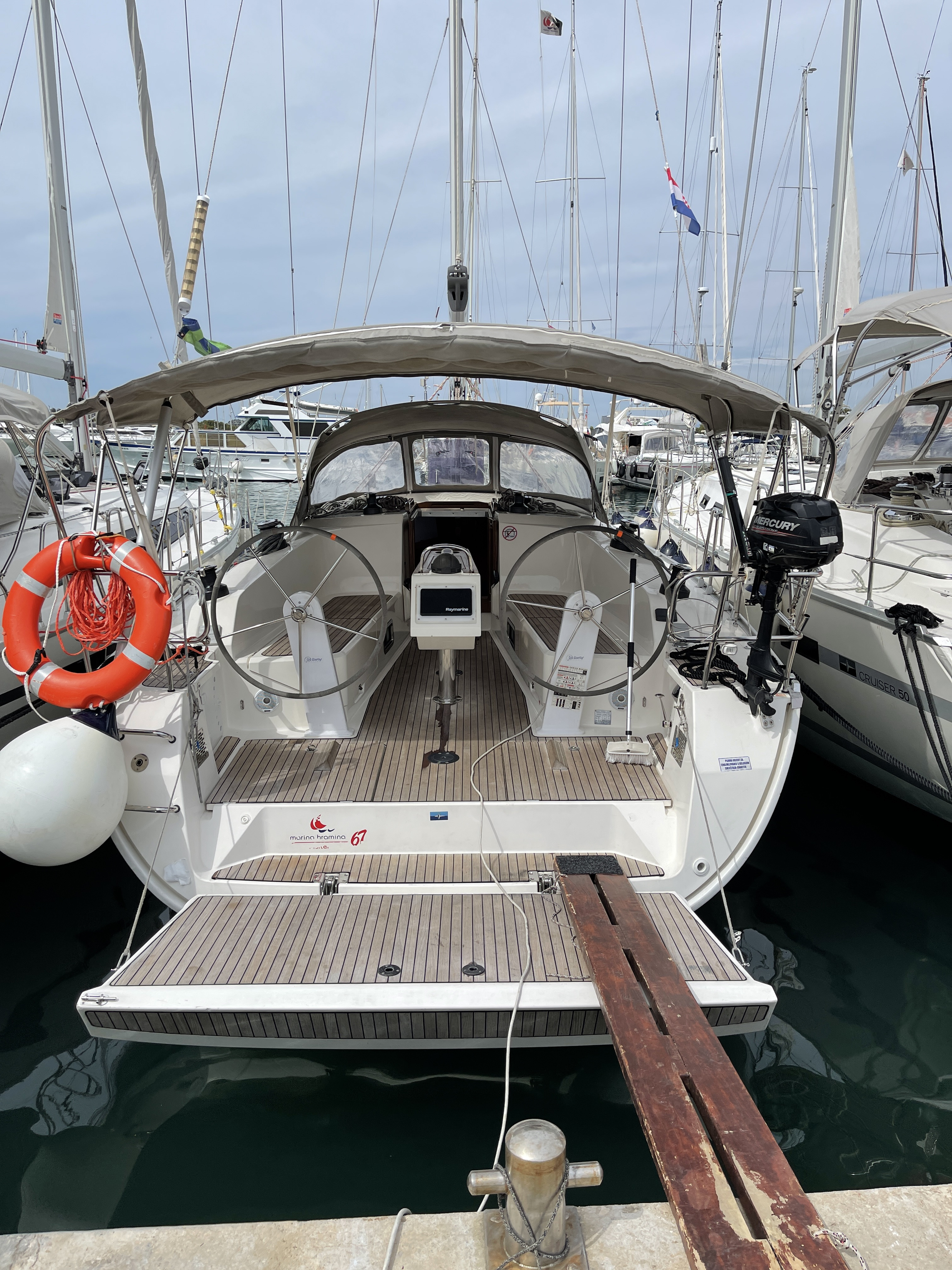 | Outside | 220 V-Landanschluss, Anker mit Kette, Badeleiter, Badeplattform, Biminitop, Bootshaken, Cockpitdusche, Cockpitpolster, Cockpittisch, Deckbürste, Dieselkanister , elektr. Ankerwinsch, Fender, Festmacherleinen, Gangway, Kunststoff-Eimer (Pütz), Sprayhood, Teak im Cockpit, Wasserschlauch, Winschen |