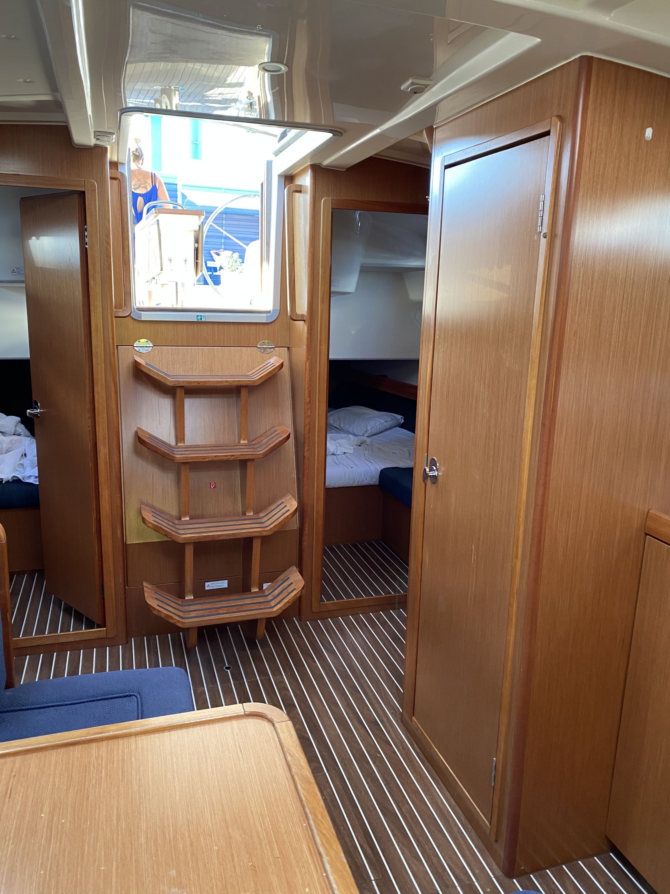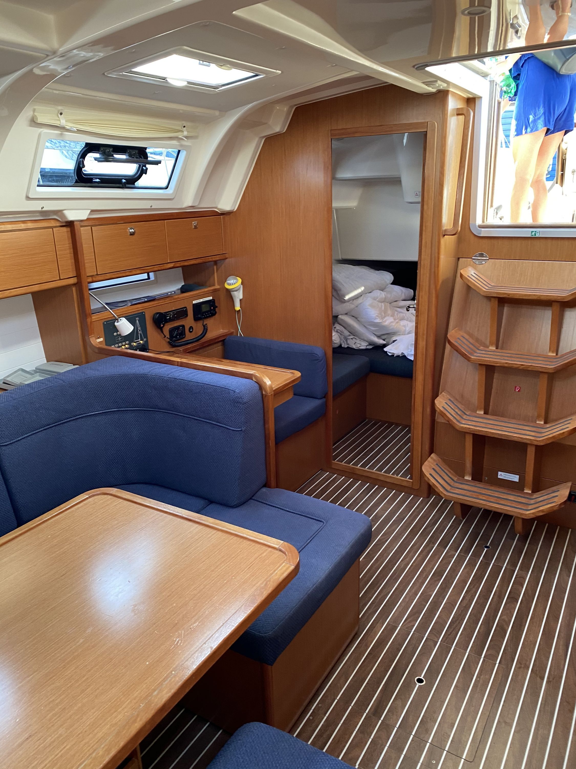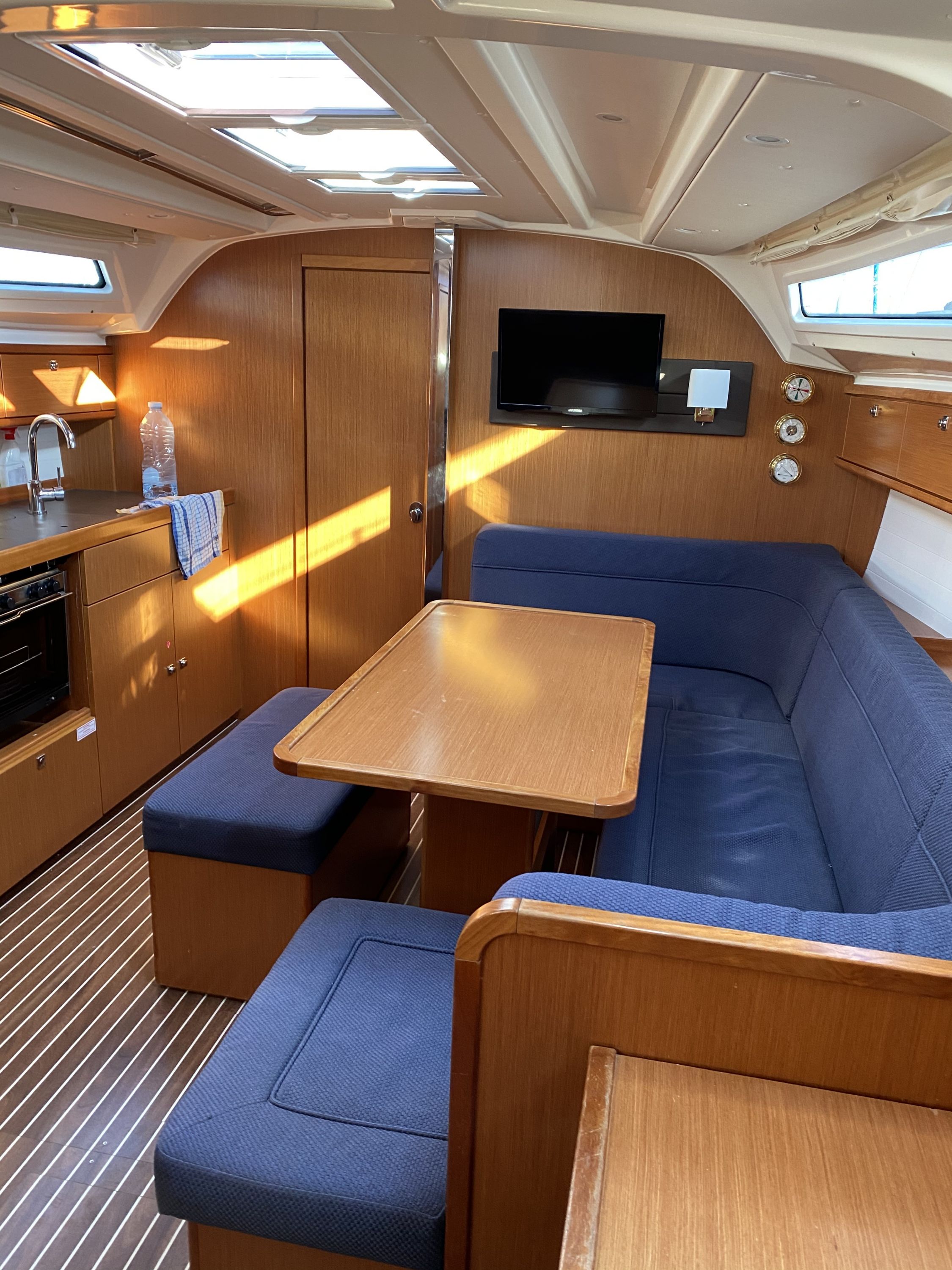 Outside 220 V-Landanschluss, Anker mit Kette, Badeleiter, Badeplattform, Biminitop, Bootshaken, Cockpitdusche, Cockpitpolster, Cockpittisch, Deckbürste, Dieselkanister , elektr. Ankerwinsch, Fender, Festmacherleinen, Gangway, Kunststoff-Eimer (Pütz), Sprayhood, Teak im Cockpit, Wasserschlauch, Winschen