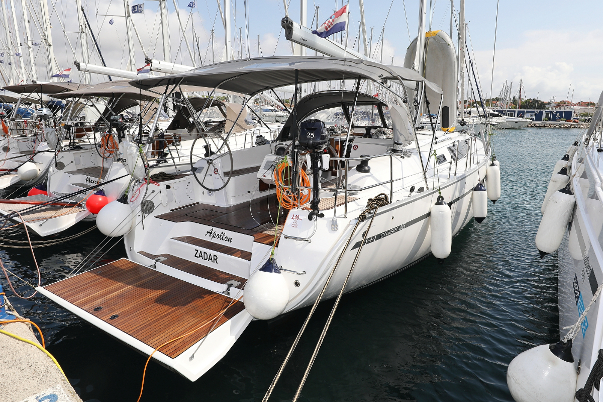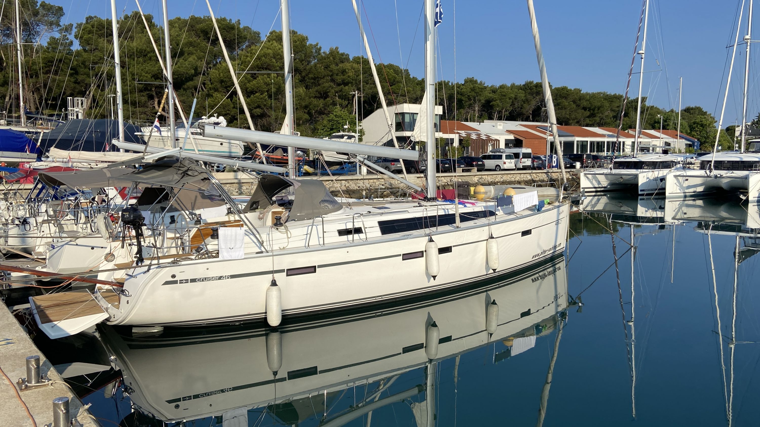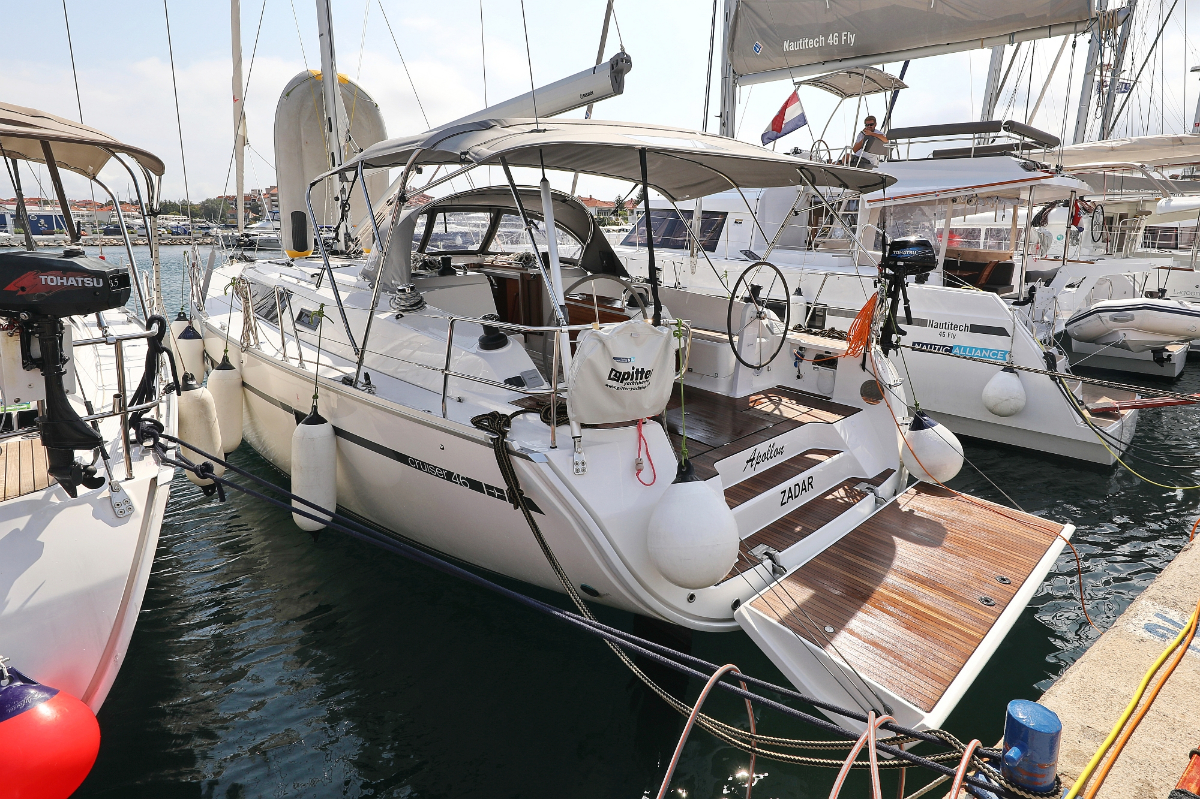 | Outside | 220 V-Landanschluss, Anker mit Kette, Ankerwinsch, Badeplattform, Benzinkanister, Biminitop, Bootshaken, Cockpitdusche, Cockpitlautsprecher, Cockpitpolster, elektr. Ankerwinsch, Fender, Festmacherleinen, Gangway, Kugelfender, Kunststoff-Eimer (Pütz), Solaranlage, Sprayhood, Teak im Cockpit, Wantenschneider, Wasserkanister , Wasserschlauch, Windex |