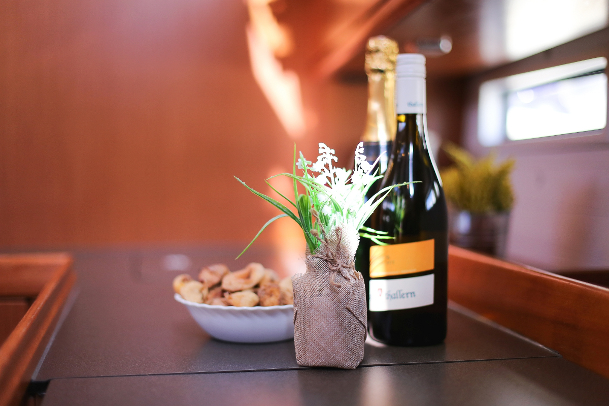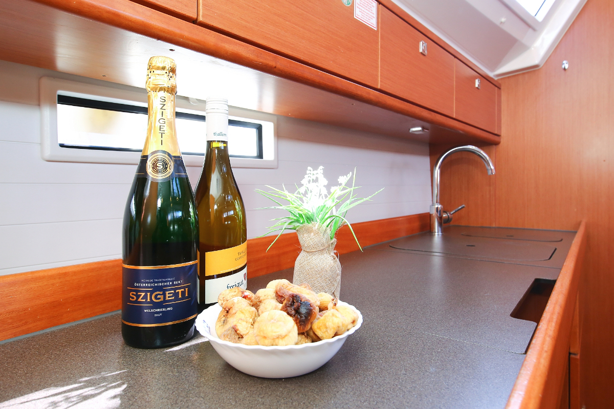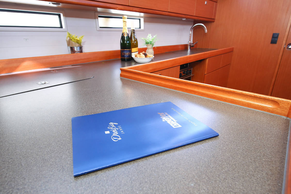 | Safety | Automatikwesten, Autopilot, Blitzboje, Bootsmannstuhl, Bordapotheke, Bordwerkzeug, Bugstrahlruder, Feuerlöscher, Lifebelts, Motor-Ersatzteile, Nebelhorn, Notsignale, Radarreflektor, Reparaturset für Beiboot, Rettungsinsel, Suchscheinwerfer, Taschenlampe, UKW-Funk, Zweitanker |