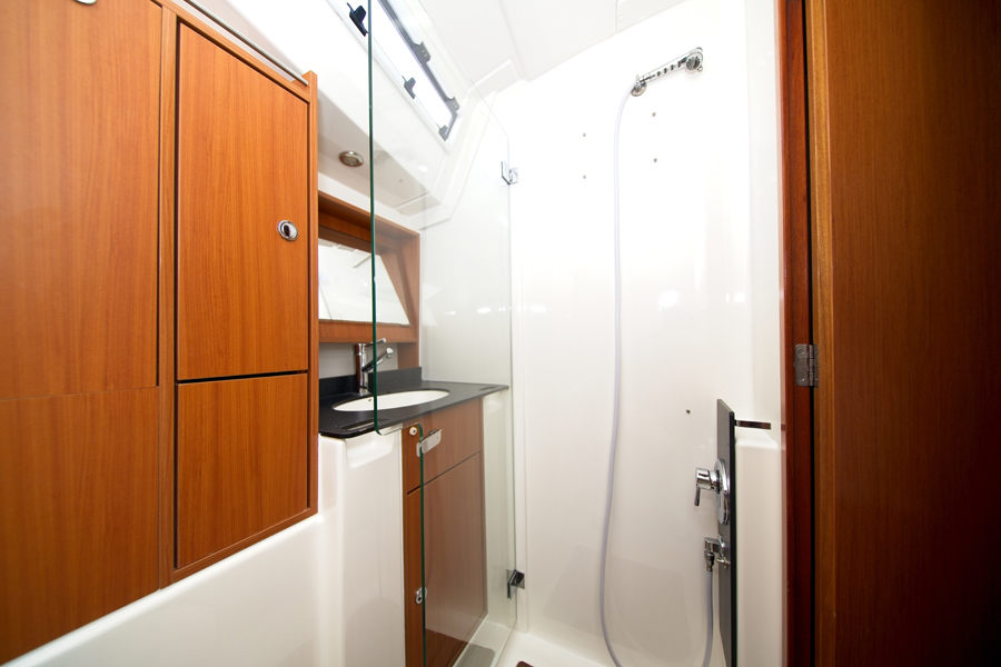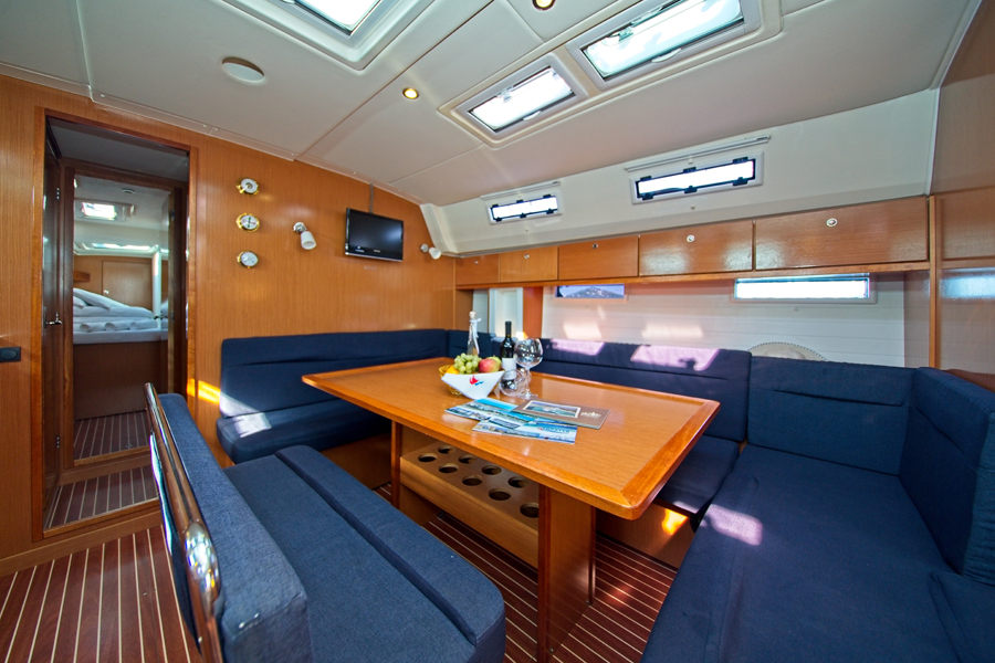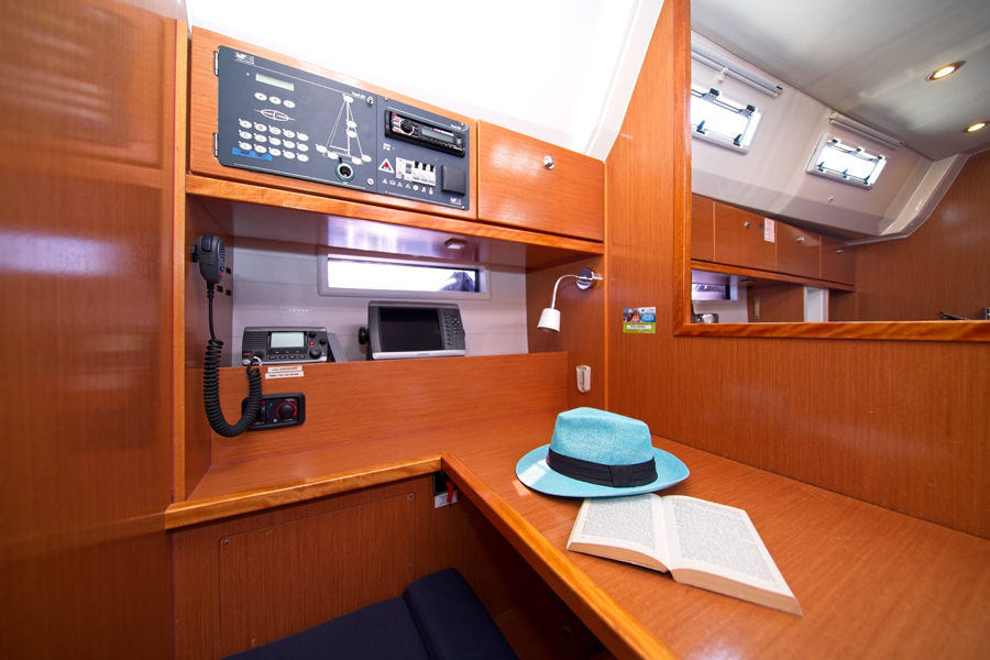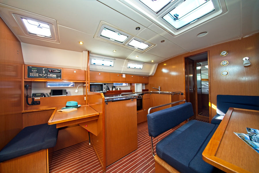 | Navigation | Barometer, Fernglas, GPS mit Kartenplotter im Salon, Hafenhandbücher, Handpeilkompass, Kompass, Navigationsbesteck, Seekarten, Thermometer, Tridata (Log, Echolot, Windm.), Windmesser |
