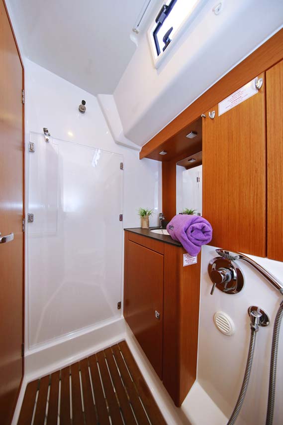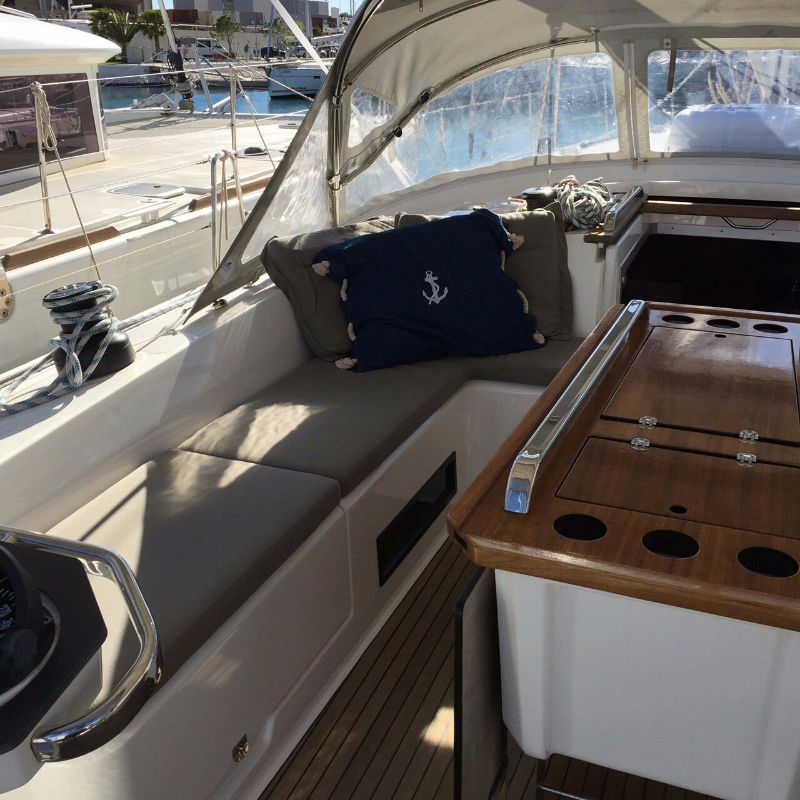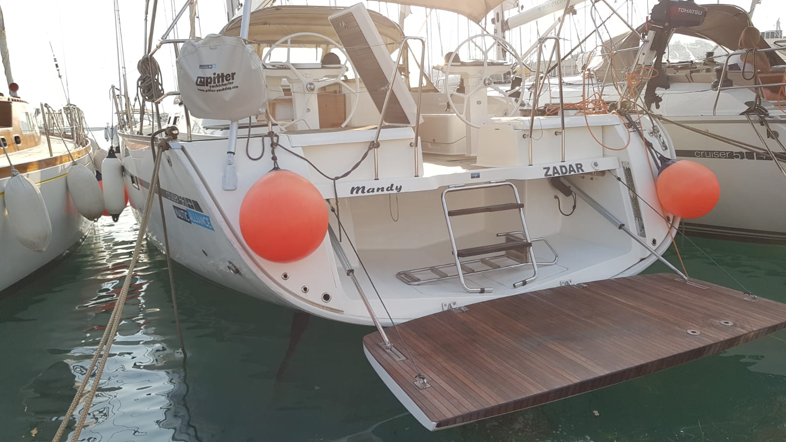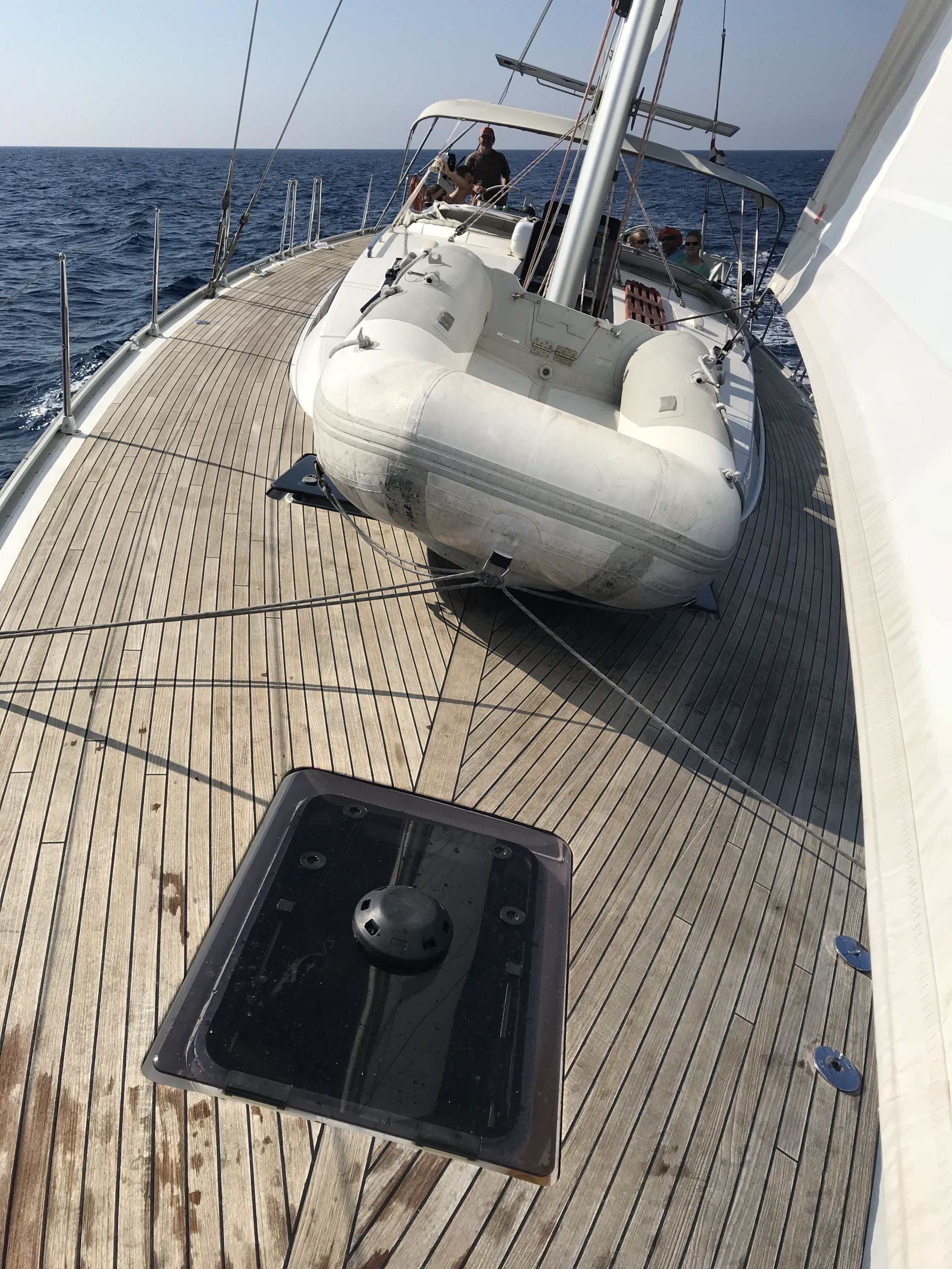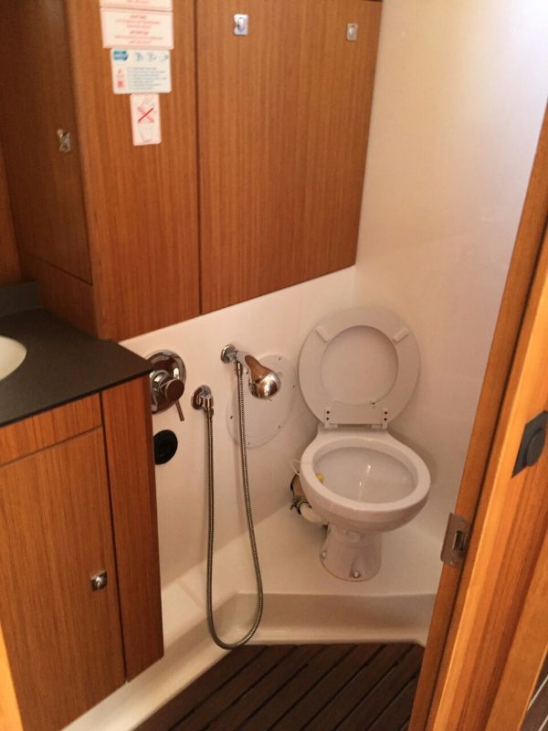 | Outside | 220 V-Landanschluss, Anker mit Kette, Ankerwinsch, Badeplattform, Biminitop, Bootshaken, Cockpitdusche, Cockpitlautsprecher, Cockpitpolster, Cockpittisch, Dieselkanister , elektr. Ankerwinsch, Fender, Fernsteuerung für elektr. Ankerwinsch, Festmacherleinen, Gangway, Kugelfender, Kunststoff-Eimer (Pütz), Solaranlage, Sprayhood, Teak im Cockpit, Teakdeck, Wantenschneider, Wasserkanister , Wasserschlauch, Windex |