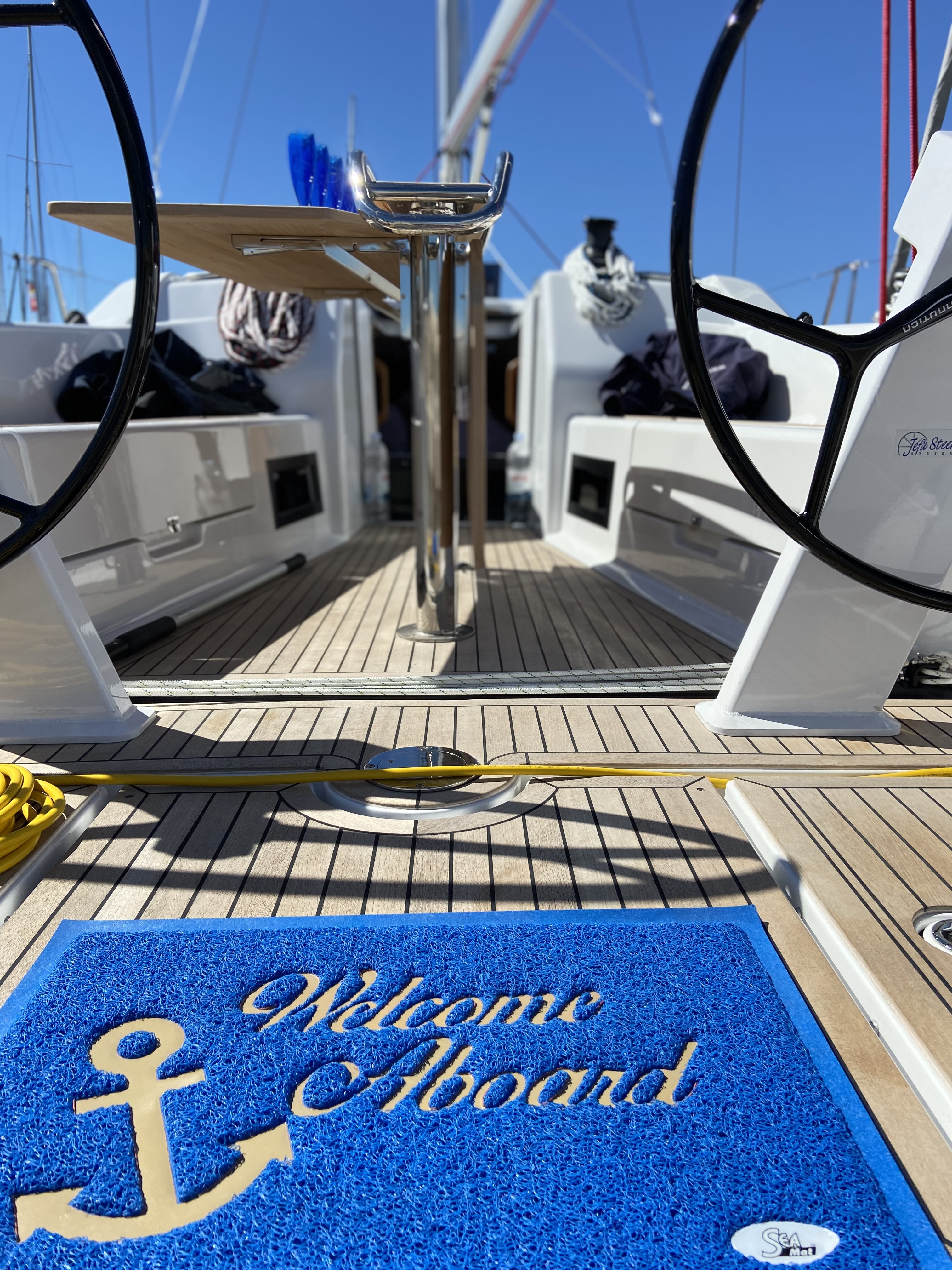 | Outside | Anker mit Kette, Badeplattform, Biminitop, Bootshaken, Bugspriet, Cockpitdusche warm/kalt, Cockpitlautsprecher, Cockpitpolster, Cockpittisch, Deckbeleuchtung, elektr. Ankerwinsch, Festmacherleinen, Gangway, Lifeline System, Schnorchelausrüstung, Sprayhood, Teak im Cockpit |