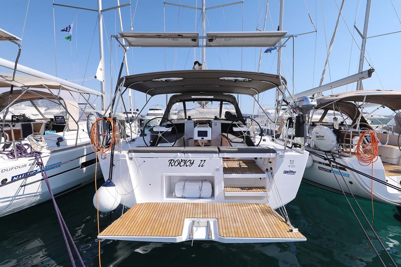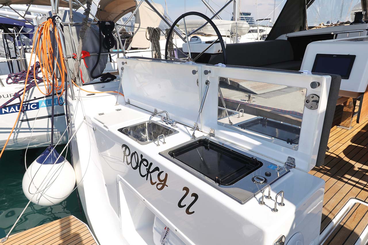 | Outside | 220 V-Landanschluss, Anker mit Kette, Ankerwinsch, Benzinkanister, Biminitop, Bootshaken, Cockpitdusche, Cockpitlautsprecher, Cockpitpolster, Cockpittisch, elektr. Ankerwinsch, Fender, Festmacherleinen, Gangway, Grill, Kugelfender, Kunststoff-Eimer (Pütz), Solaranlage, Sprayhood, Spülbecken im Cockpit, Teak im Cockpit, Wantenschneider, Wasserkanister , Wasserschlauch |
