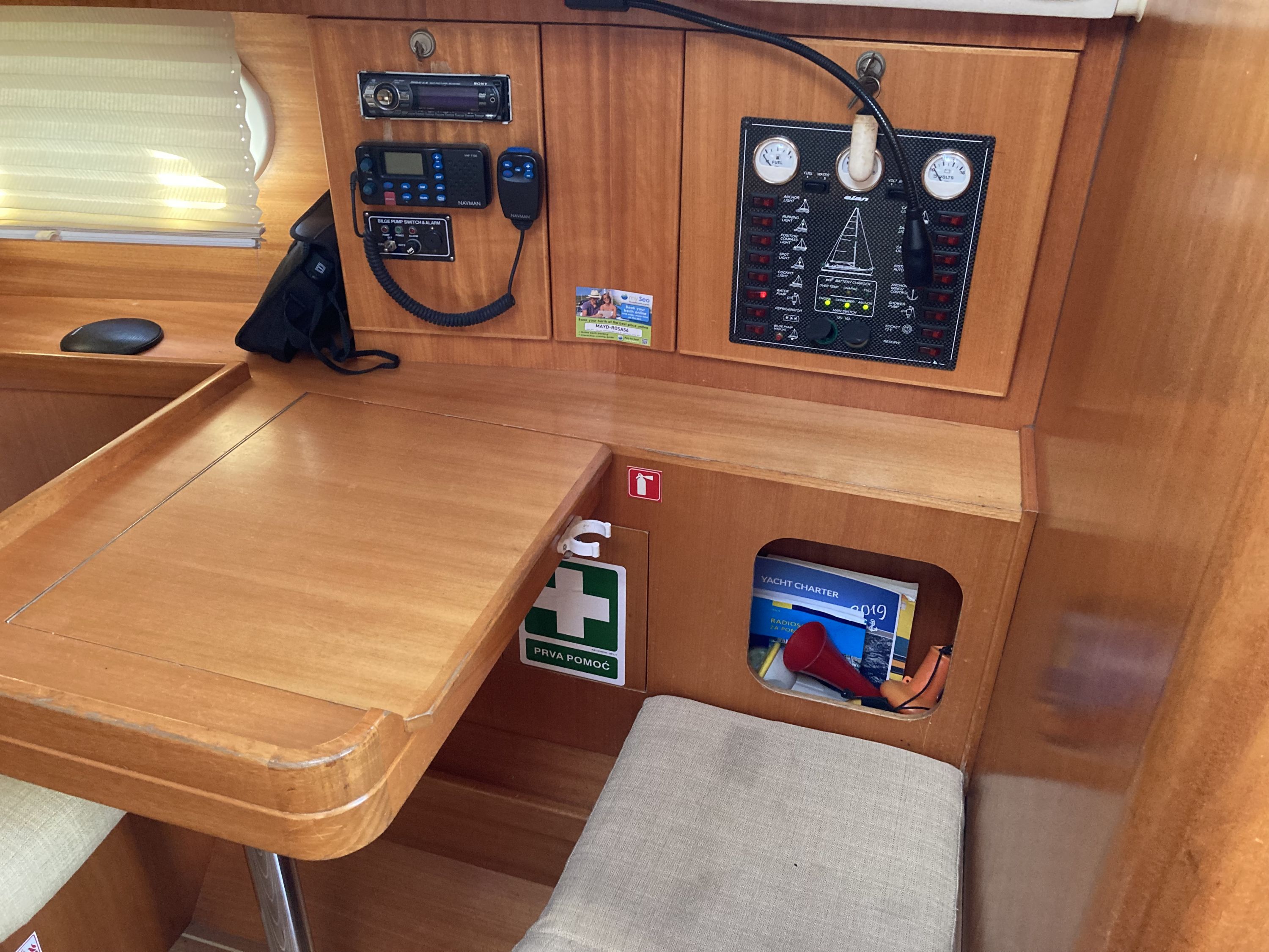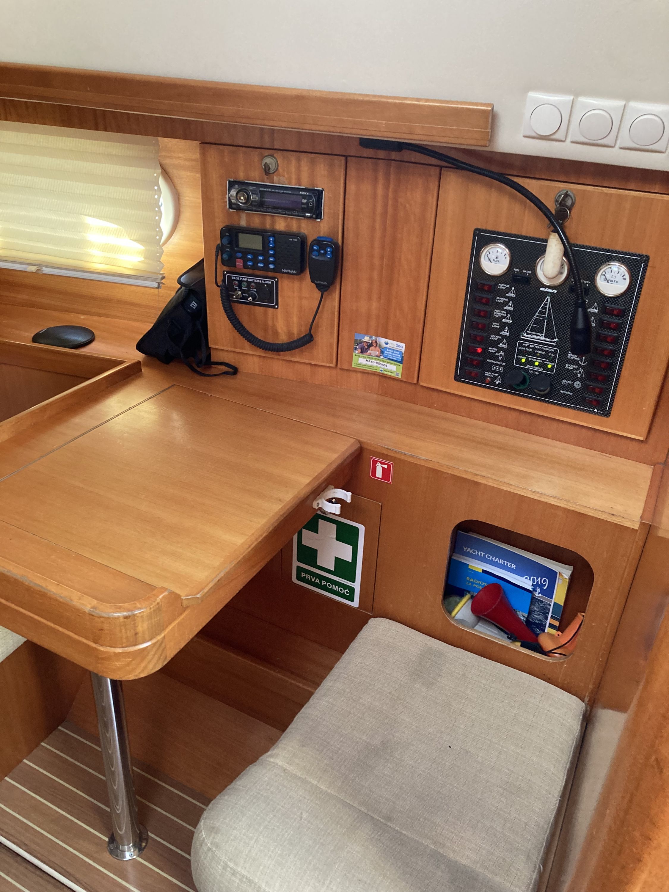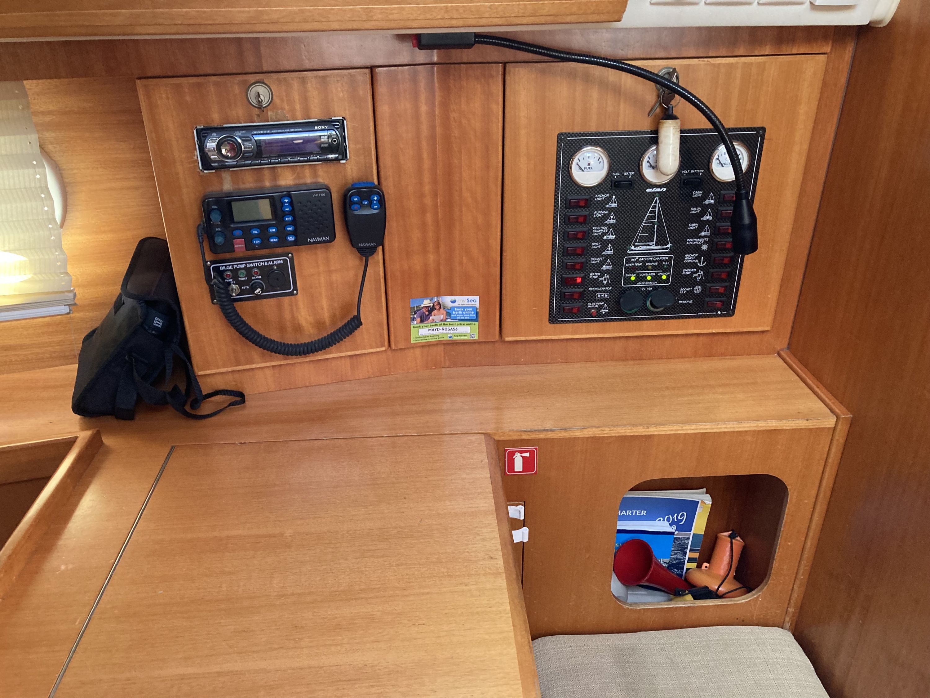 | Navigation | Echolot, GPS mit Kartenplotter im Salon, Kompass, Sumlog, Windmesser |