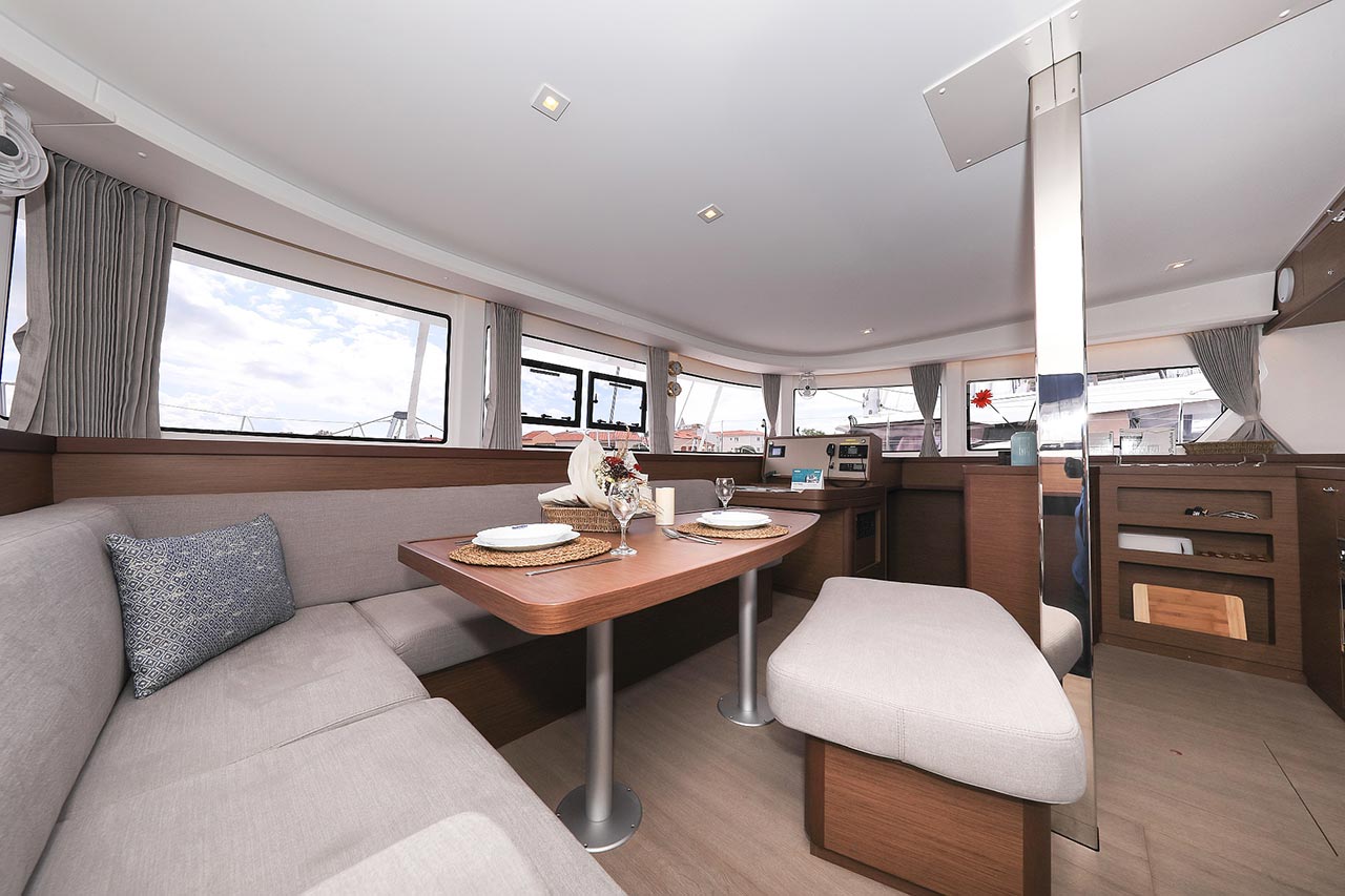 | Inside | Borduhr, FUSION Sound System, Heizung, Inverter 12V/220V, Kühlschrank, Ladegerät, Luftpumpe für Beiboot, Pantryausstattung, Radio, USB Steckdosen in den Kabinen, Ventilatoren in Kabinen, Warmwasser |