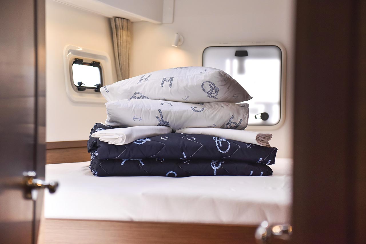 | Safety | AIS Empfänger, Automatikwesten, Autopilot, Blitzboje, Bootsmannstuhl, Bordapotheke, Bordwerkzeug, Feuerlöscher, Lifebelts, Motor-Ersatzteile, Nebelhorn, Notsignale, Radarreflektor, Reparaturset für Beiboot, Rettungsinsel, Suchscheinwerfer, Taschenlampe, UKW-Funk, Zweitanker |