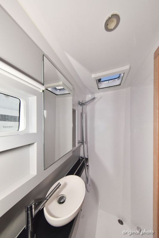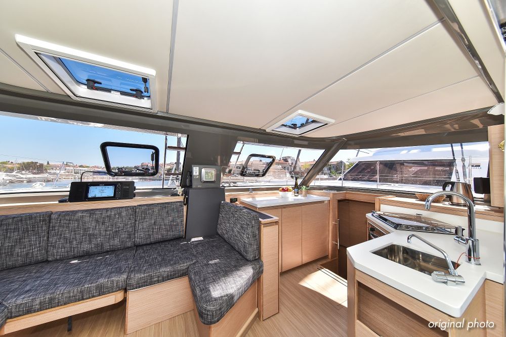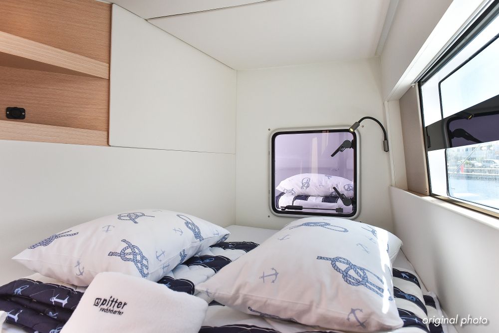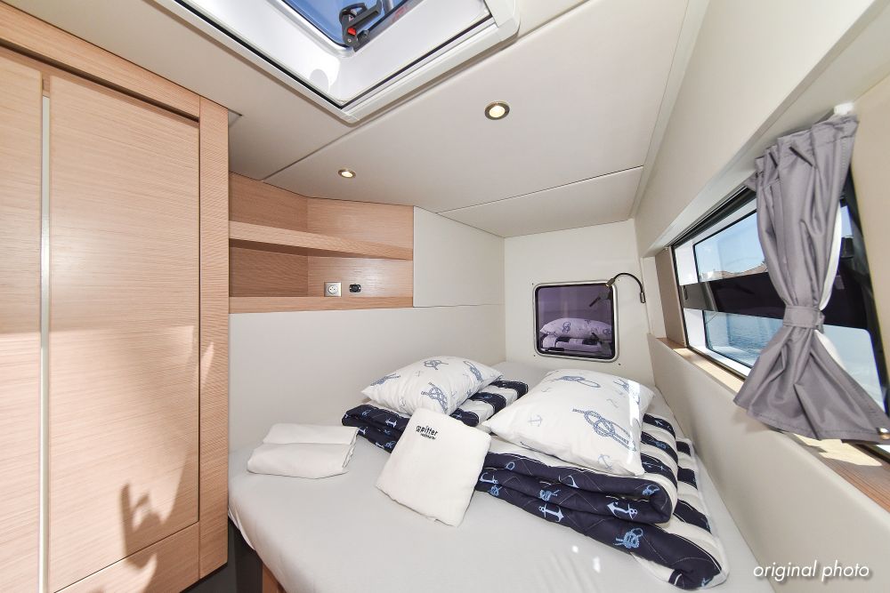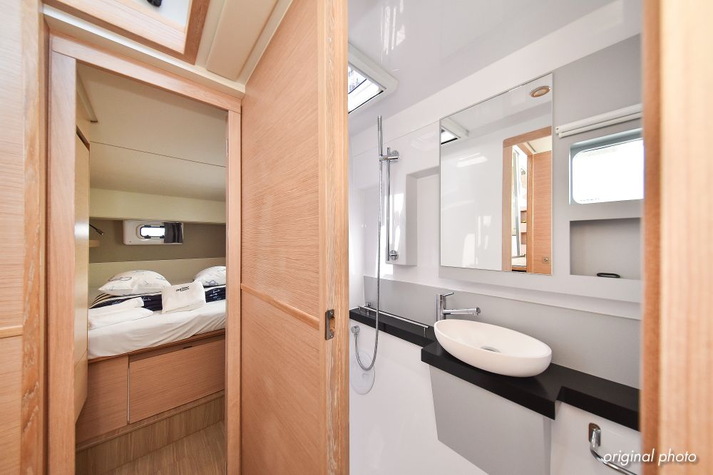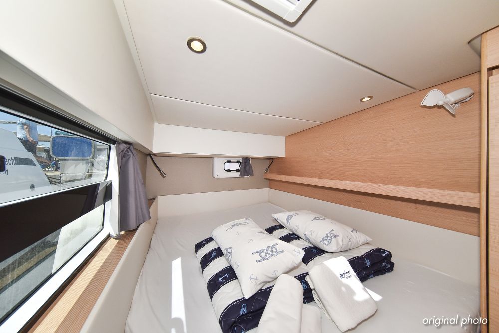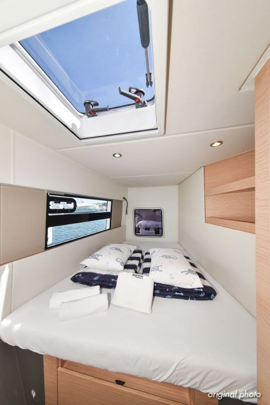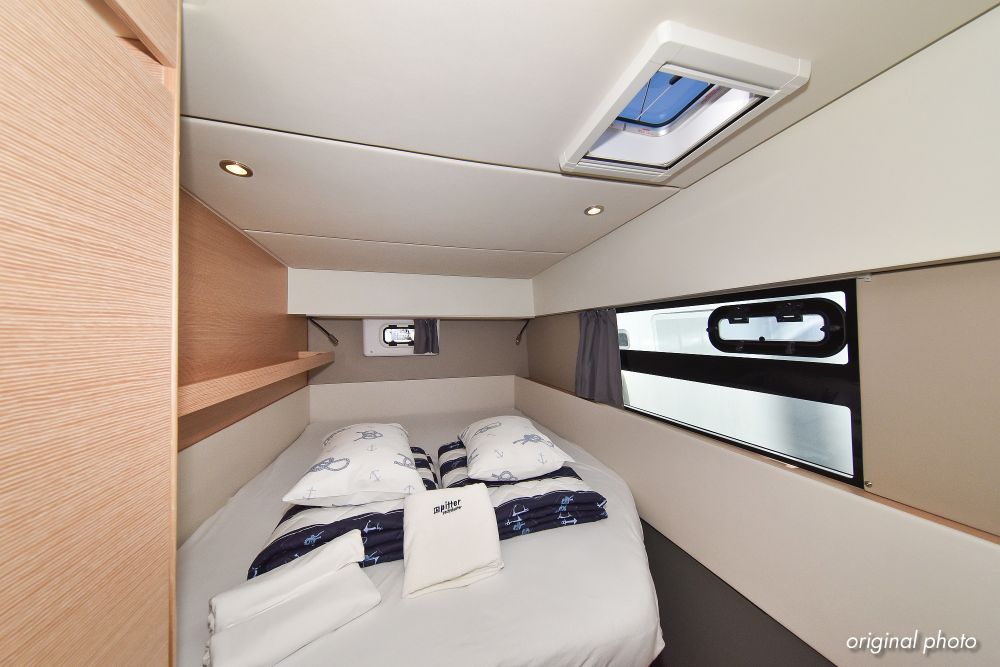 | Inside | Borduhr, Dusche, Eisbox, FUSION Sound System, Heizung, Inverter 12V/220V, Kühlschrank, Ladegerät, Luftpumpe für Beiboot, Pantryausstattung, Radio mit USB, Bluetooth und AUX-In, Ventilatoren in Kabinen, Warmwasser, WC (elektr.) |