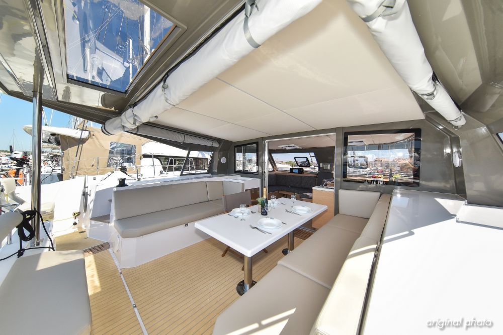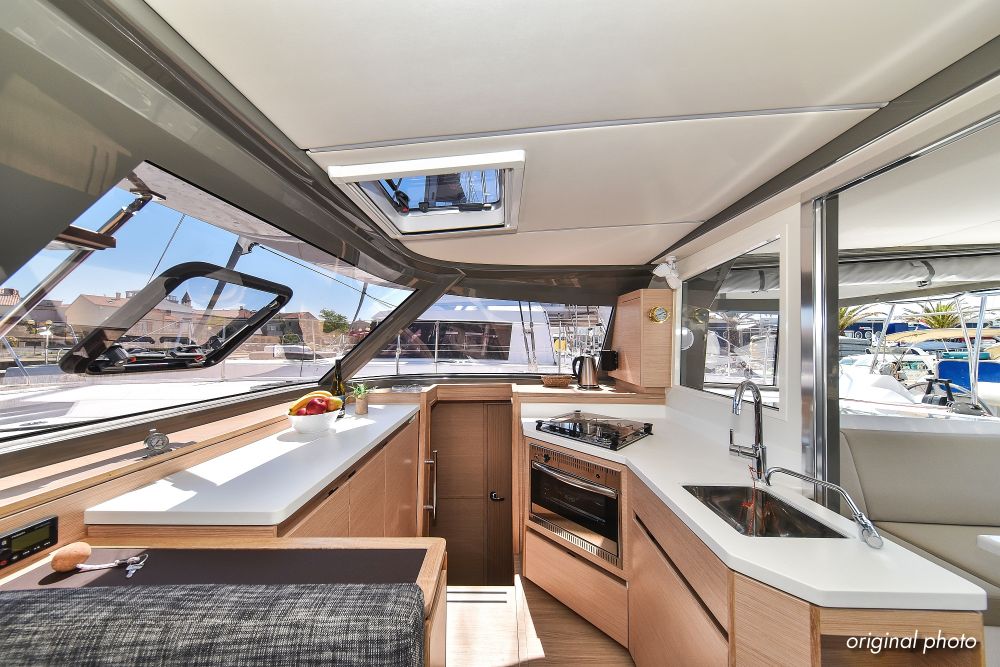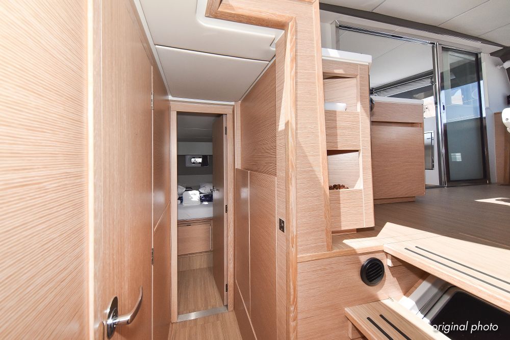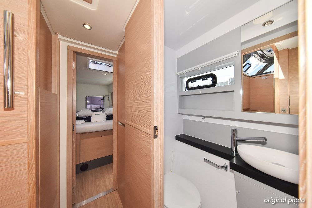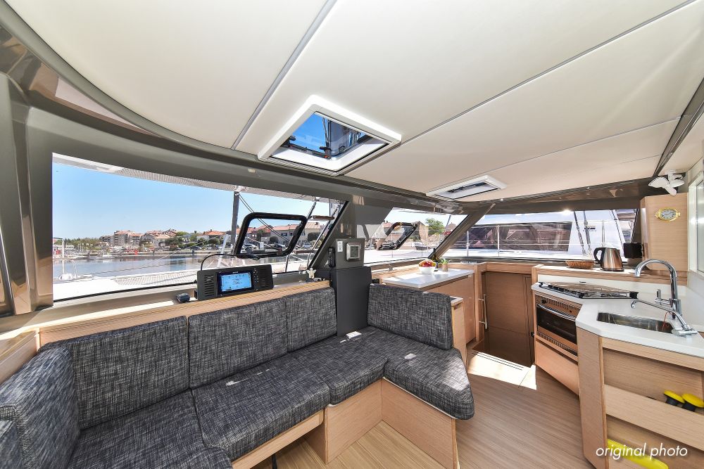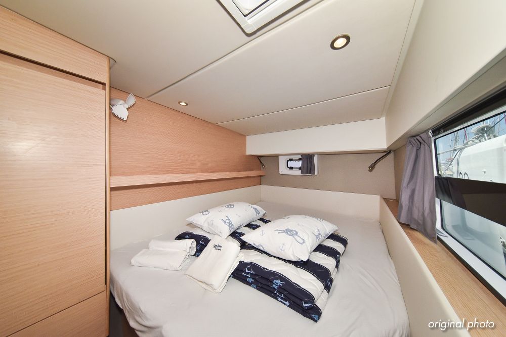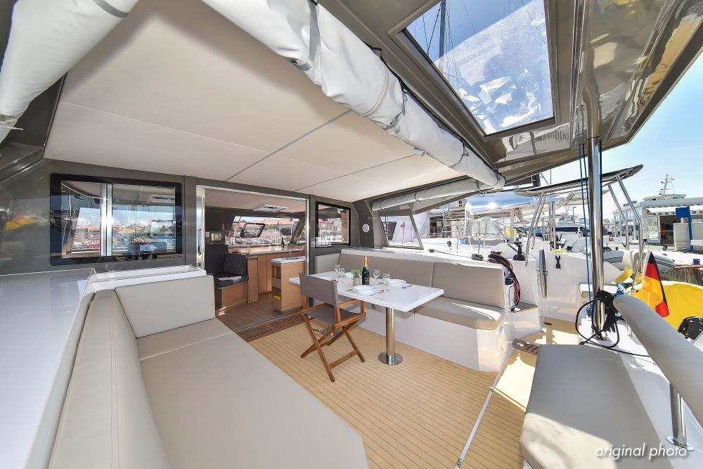 | Inside | Borduhr, Dusche, Eisbox, FUSION Sound System, Heizung, Inverter 12V/220V, Kühlschrank, Ladegerät, Luftpumpe für Beiboot, Pantryausstattung, Radio mit USB, Bluetooth und AUX-In, Ventilatoren in Kabinen, Warmwasser, WC (elektr.) |