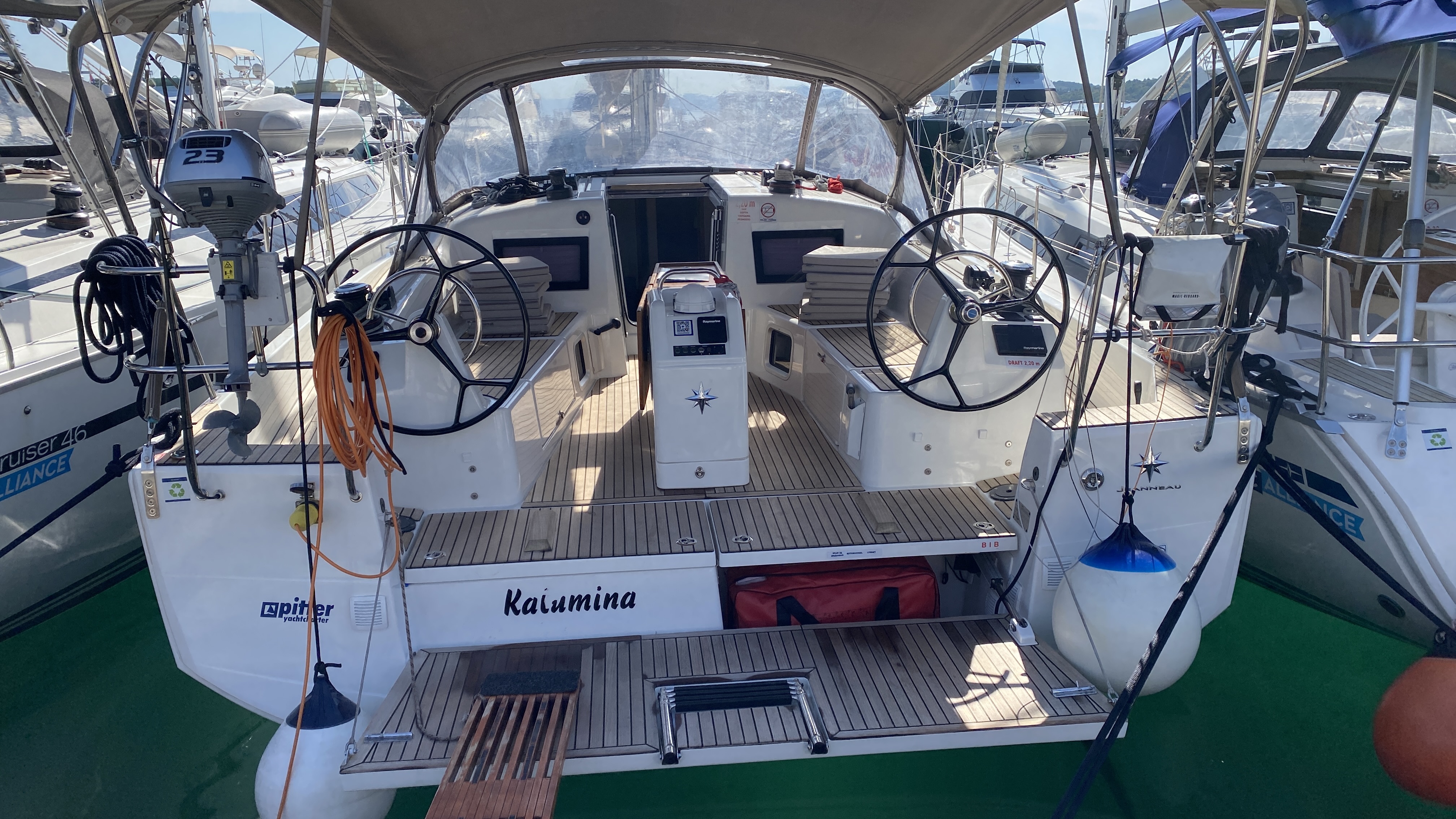 | Outside | 220 V-Landanschluss, Anker mit Kette, Ankerwinsch, Biminitop, Bootshaken, Cockpitdusche, Cockpitlautsprecher, Cockpitpolster, Cockpittisch, Dieselkanister , elektr. Ankerwinsch, elektr. Winsch, Fender, Festmacherleinen, Gangway, Kugelfender, Kunststoff-Eimer (Pütz), Solaranlage, Sprayhood, Teak im Cockpit, Teakdeck, Wantenschneider, Wasserkanister , Wasserschlauch |