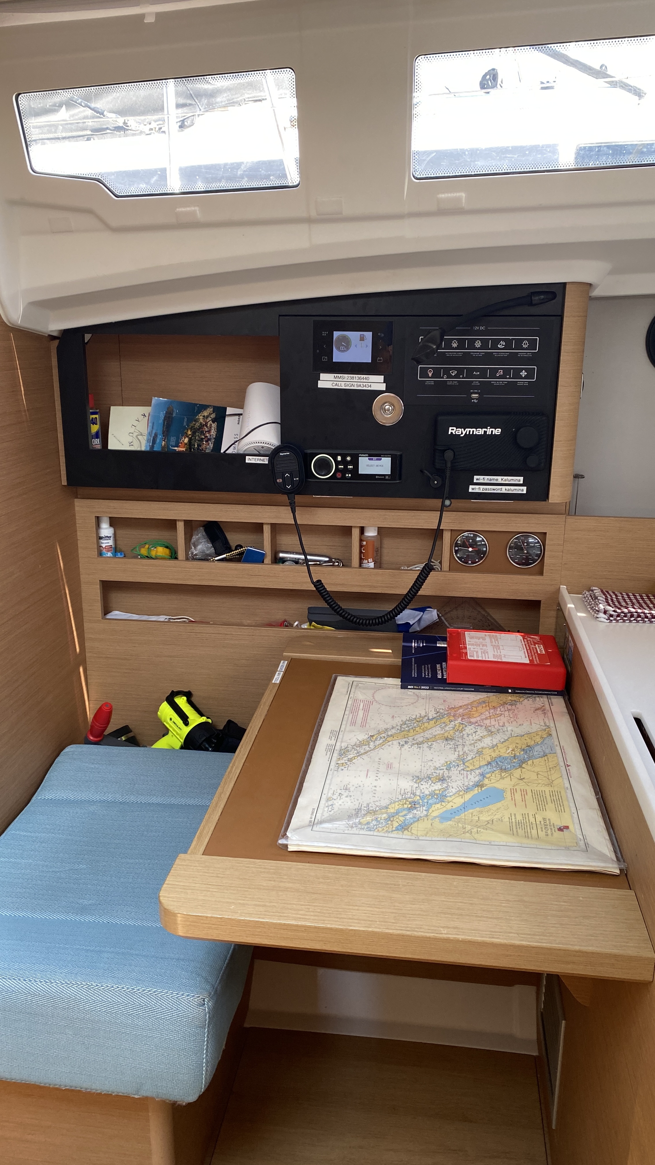 | Navigation | Barometer, Fernglas mit Peilkompass, GPS mit Kartenplotter im Cockpit, Hafenhandbücher, Navigationsbesteck, Seekarten, Tridata (Log, Echolot, Windm.) |