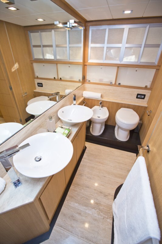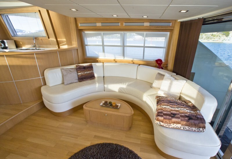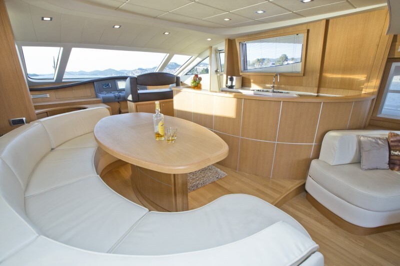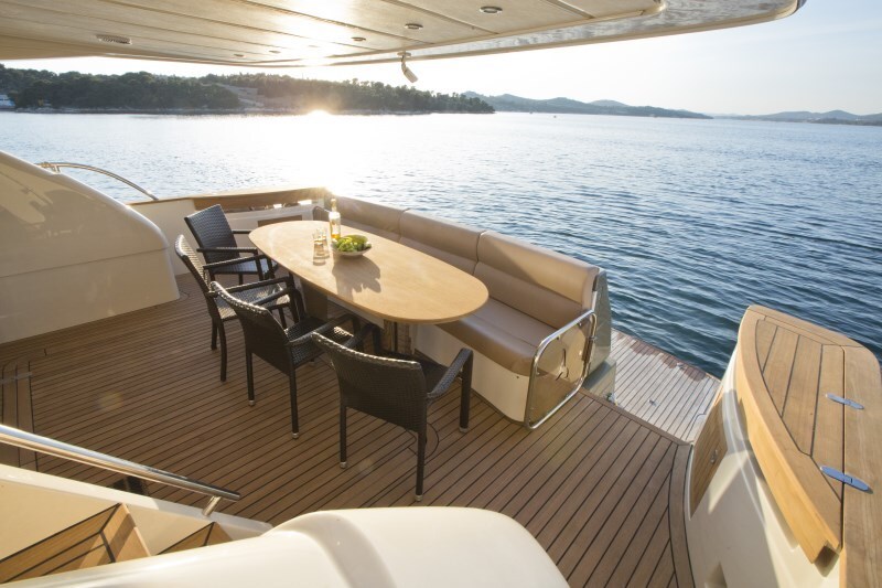 | Outside | Badeleiter, elektr. Ankerwinsch, Grill, hydraul. Gangway, Kühlschrank auf Flybridge, Liegestühle, Teak auf Flybridge, Teak im Cockpit |