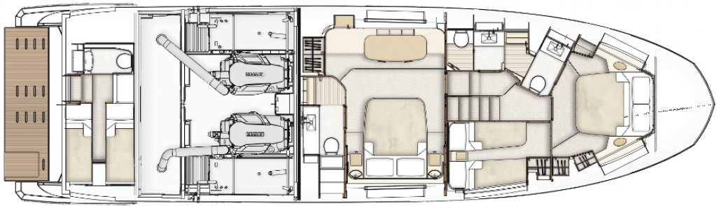 | Outside | Anker mit Kette, Ankerkettenzähler, Badeleiter, Badeplattform, Biminitop, Cockpitdusche, Cockpitpolster, Deckpolster, elektr. Winsch, Gangway, Grill, hydraul. Gangway, Kuchenbude, Polster auf Flybridge, Teak im Cockpit, Teakdeck |