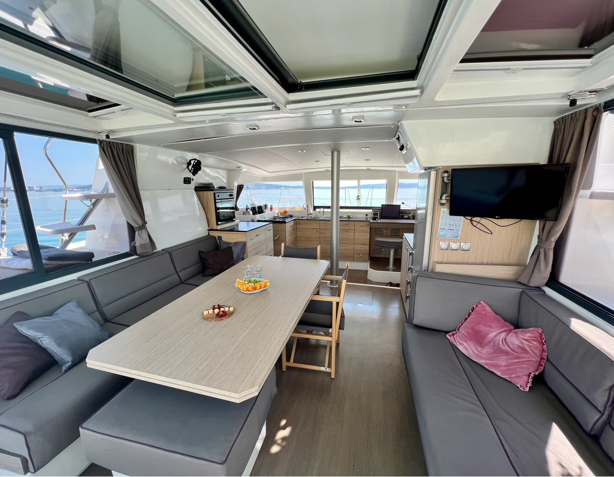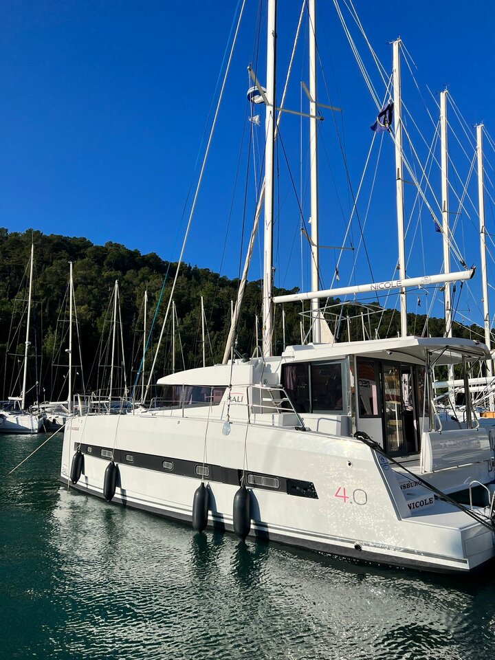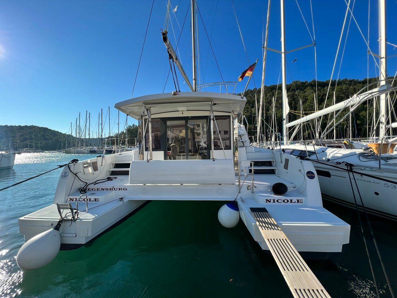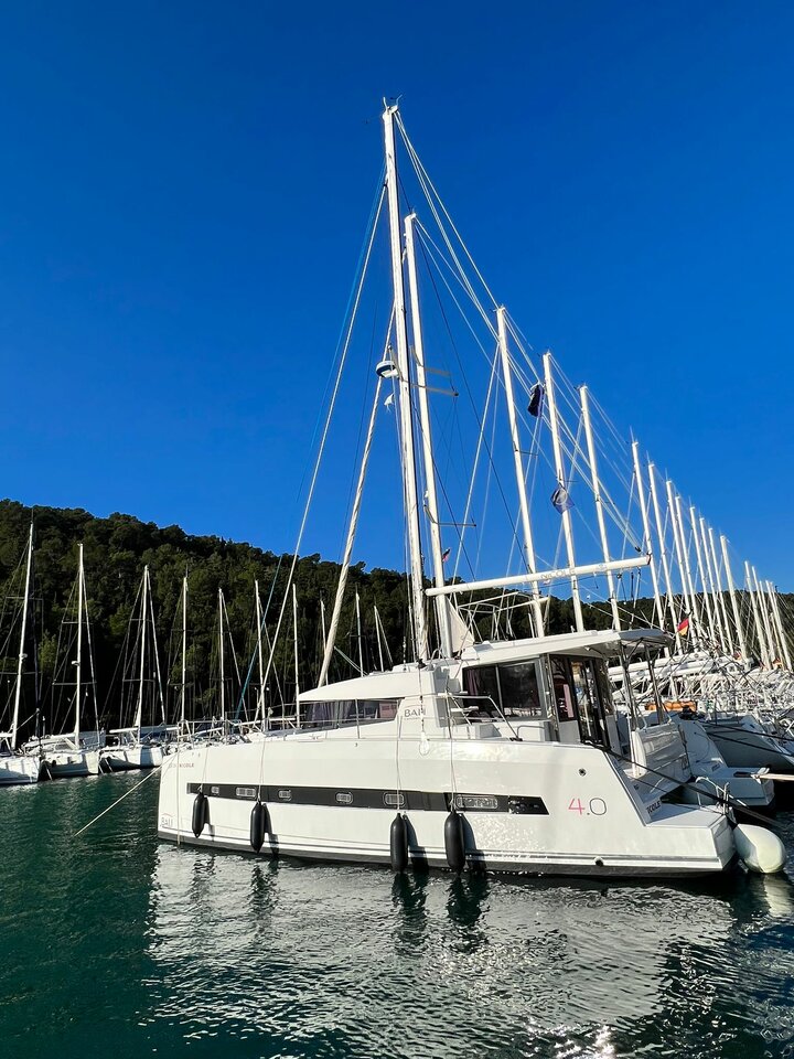 | Outside | 220 V-Landanschluss, Anker mit Kette, Badeleiter, Biminitop, Cockpitdusche, Cockpitlautsprecher, Cockpitpolster, Cockpittisch, elektr. Ankerwinsch, Fender, Festmacherleinen, Gangway, Solaranlage, Windex |