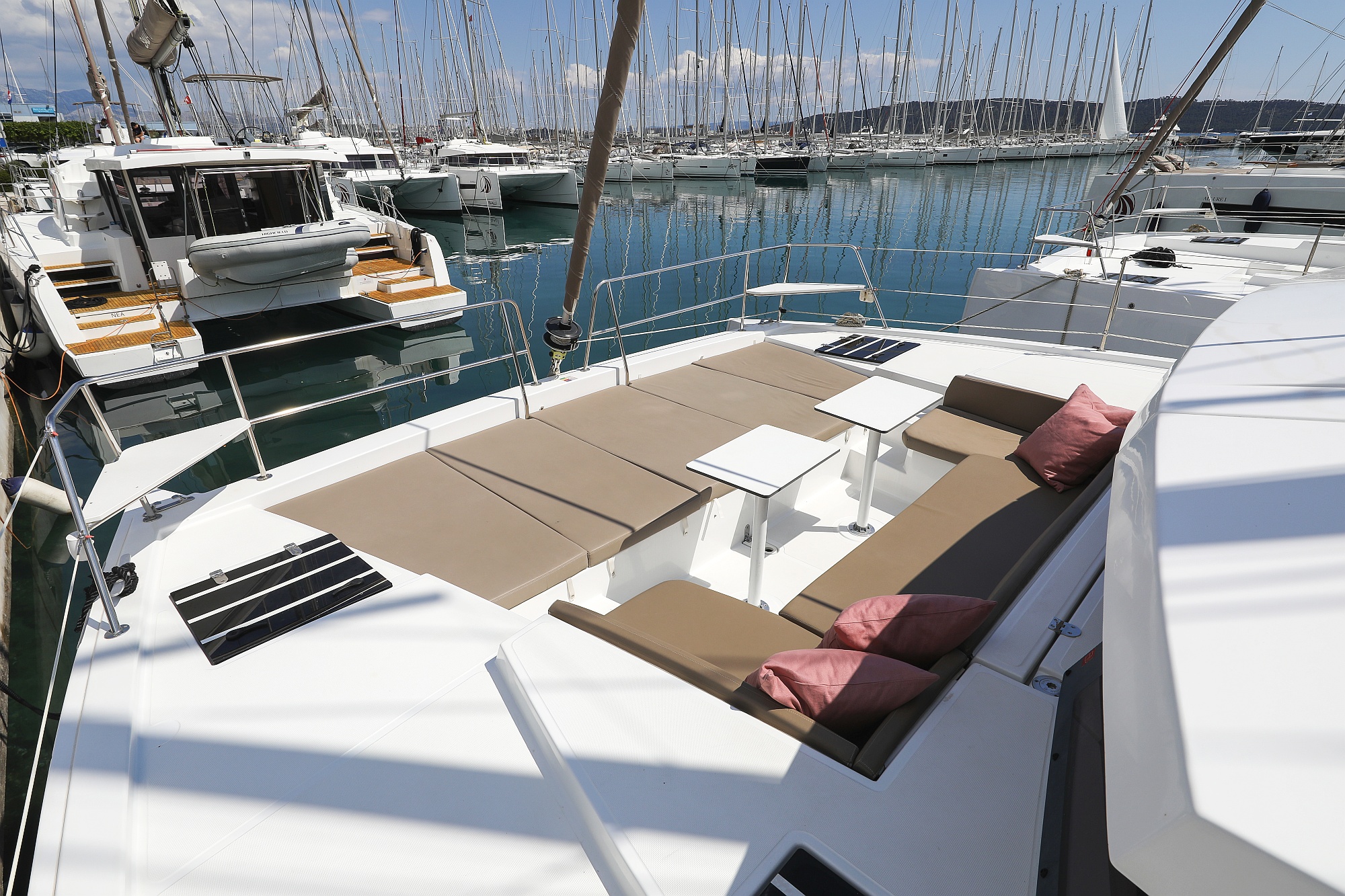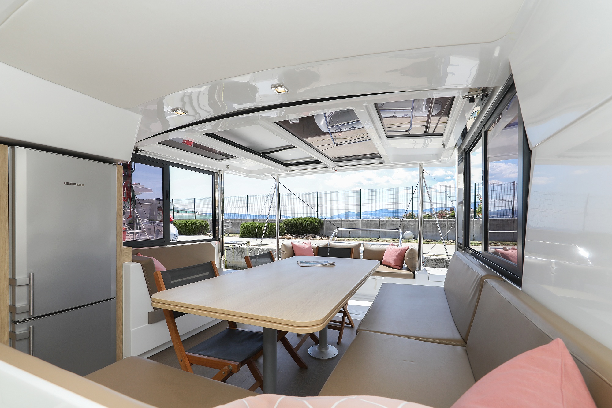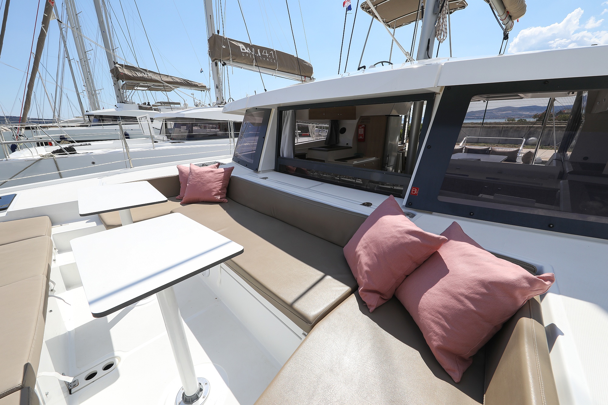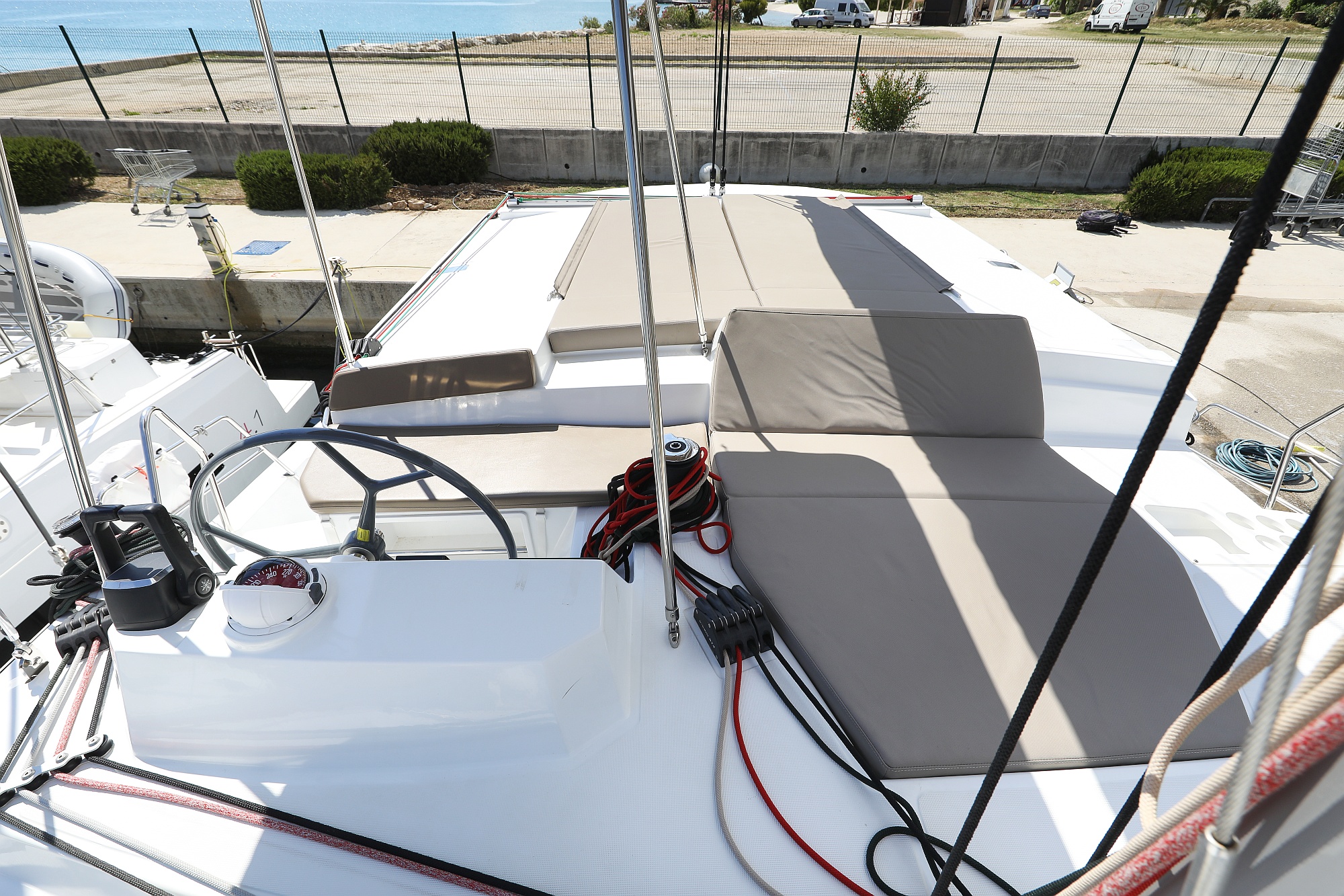 | Outside | Badeplattform, Biminitop, Cockpitdusche, Cockpitlautsprecher, Cockpitpolster, Cockpittisch, Deckpolster, elektr. Ankerwinsch, Flybridge |