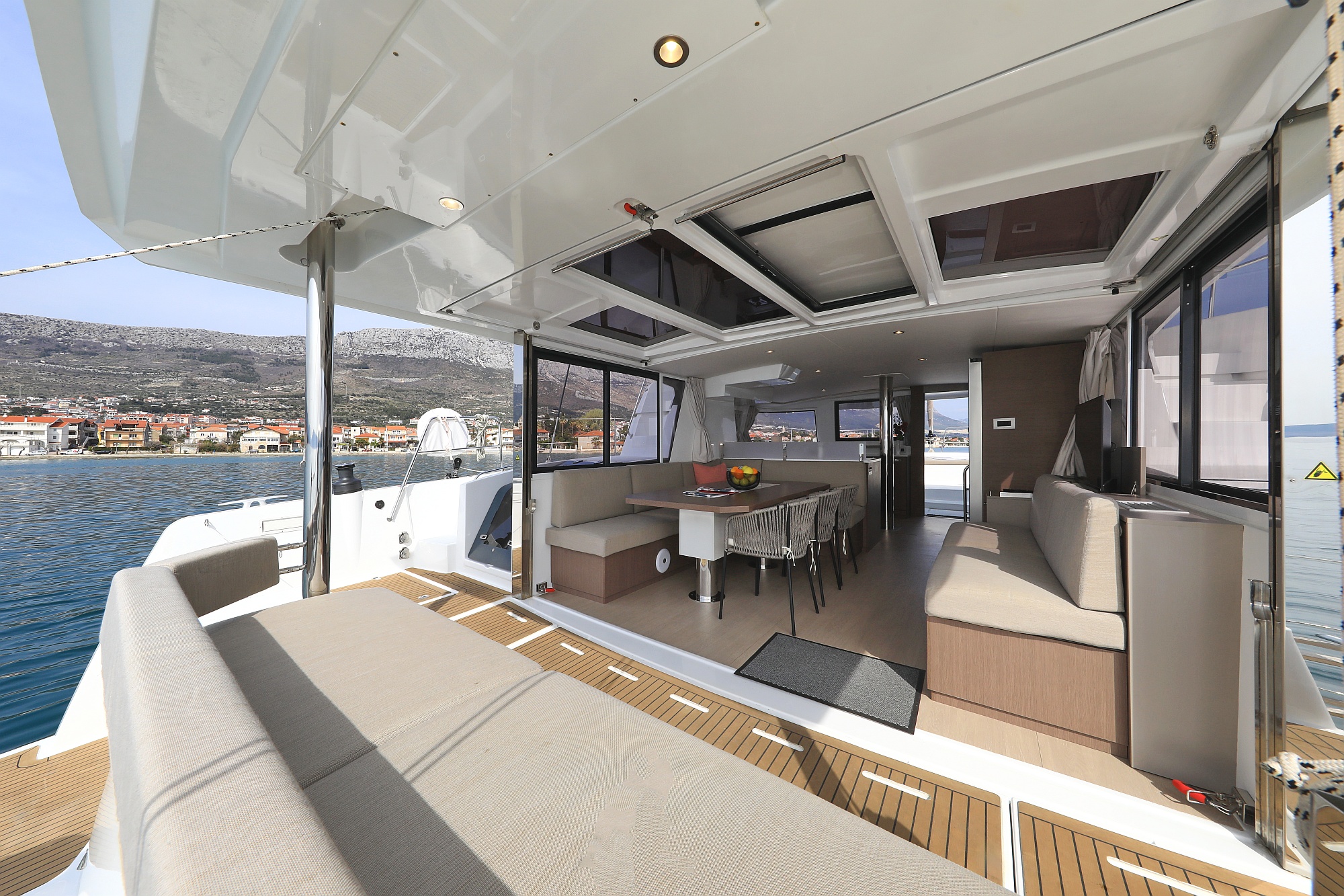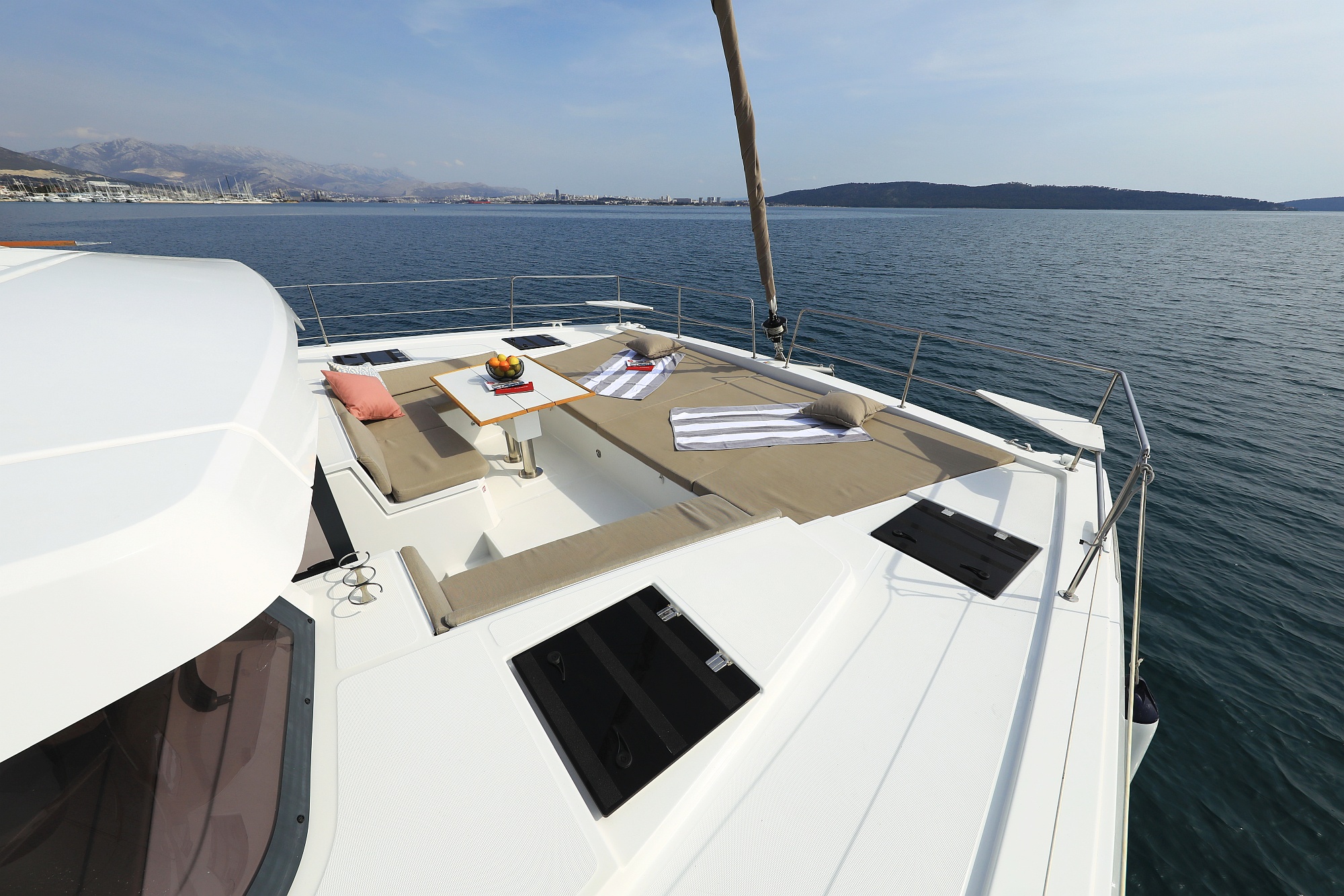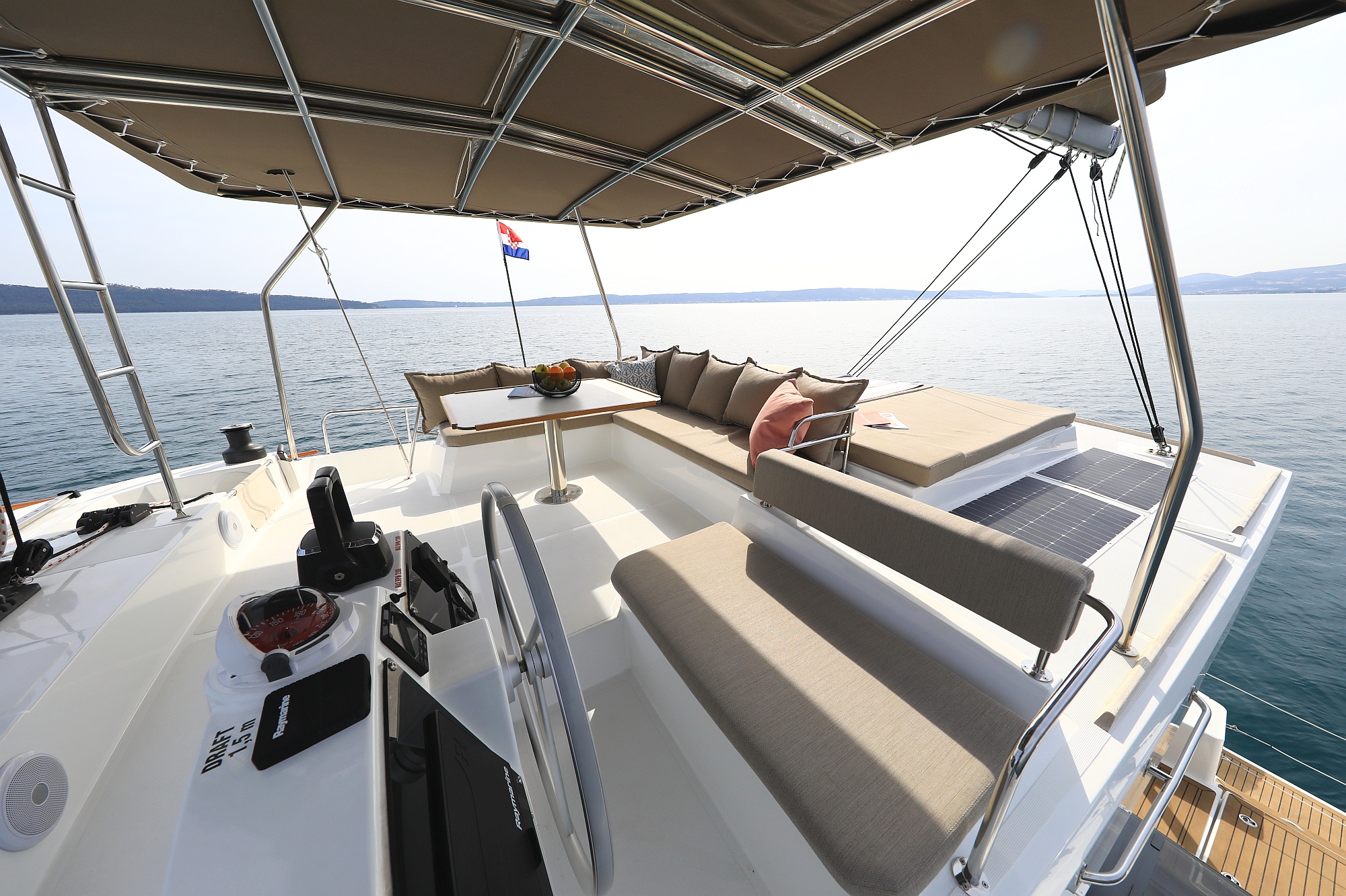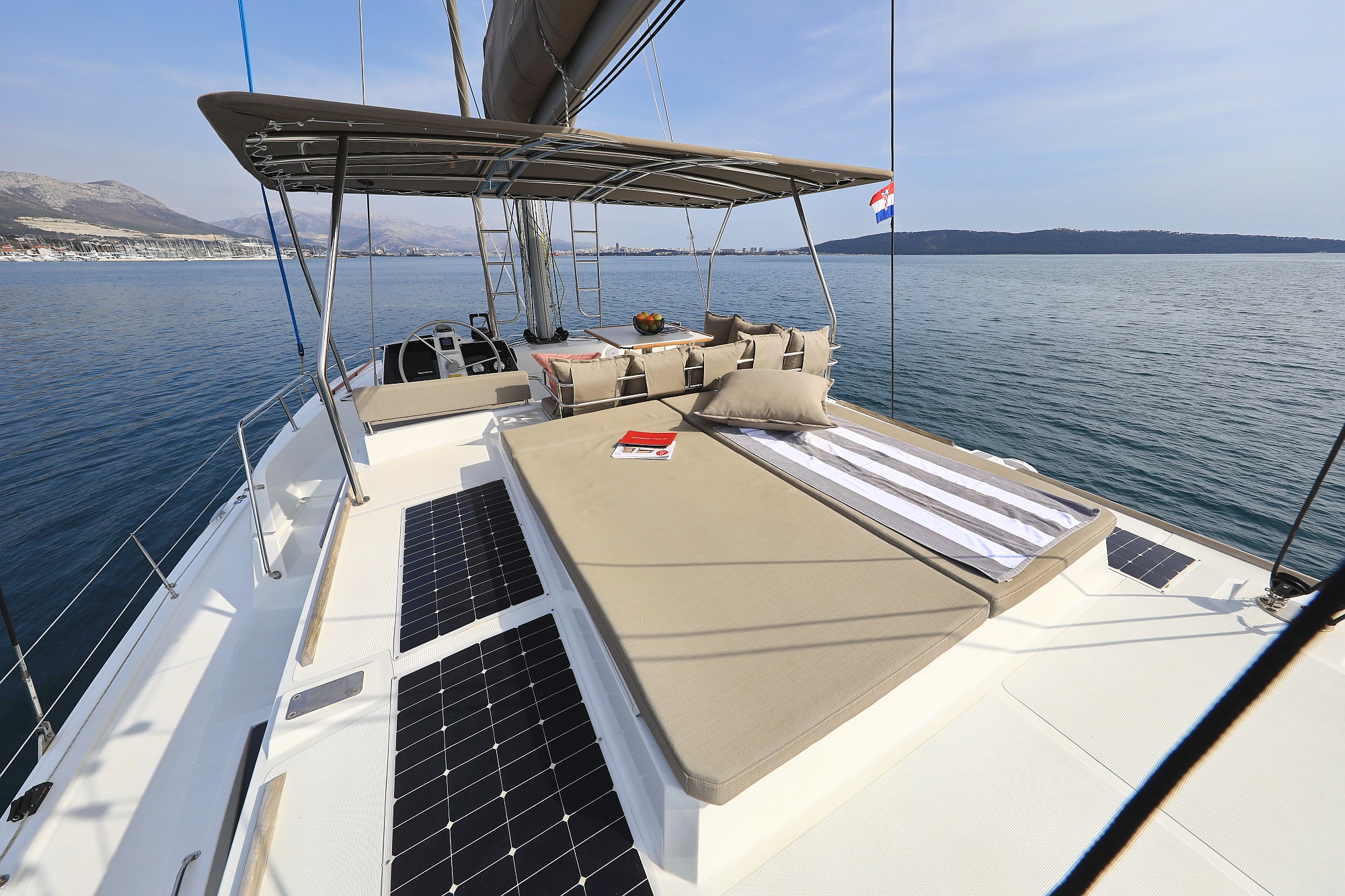 | Outside | Badeplattform, Biminitop, Cockpitdusche, Cockpitlautsprecher, Cockpitpolster, Cockpittisch, Deckpolster, Flybridge, Polster auf Flybridge, Solaranlage, Sonnensegel, Teak im Cockpit |