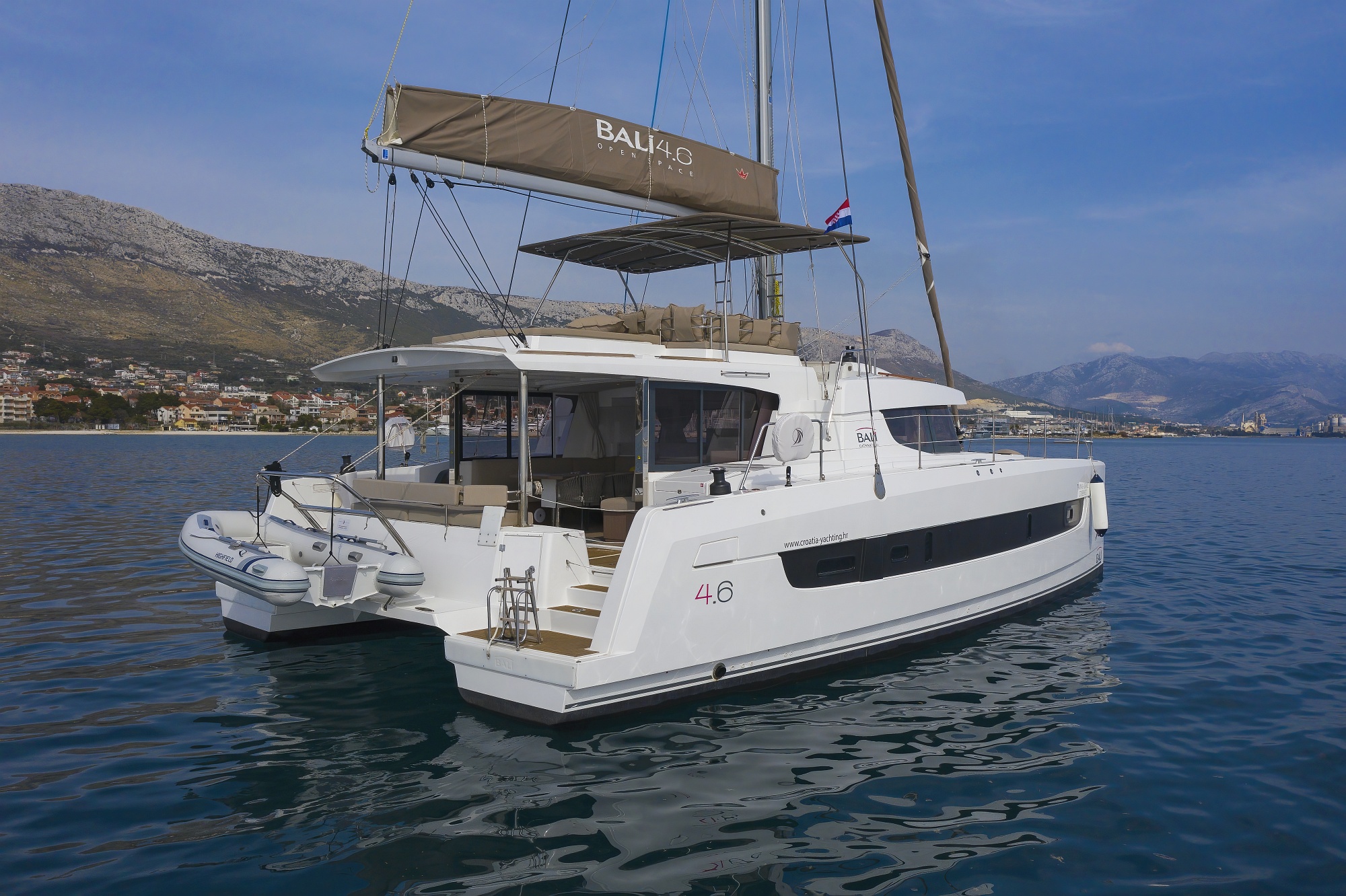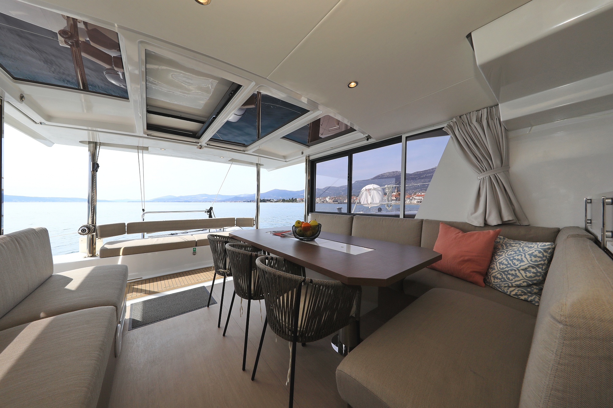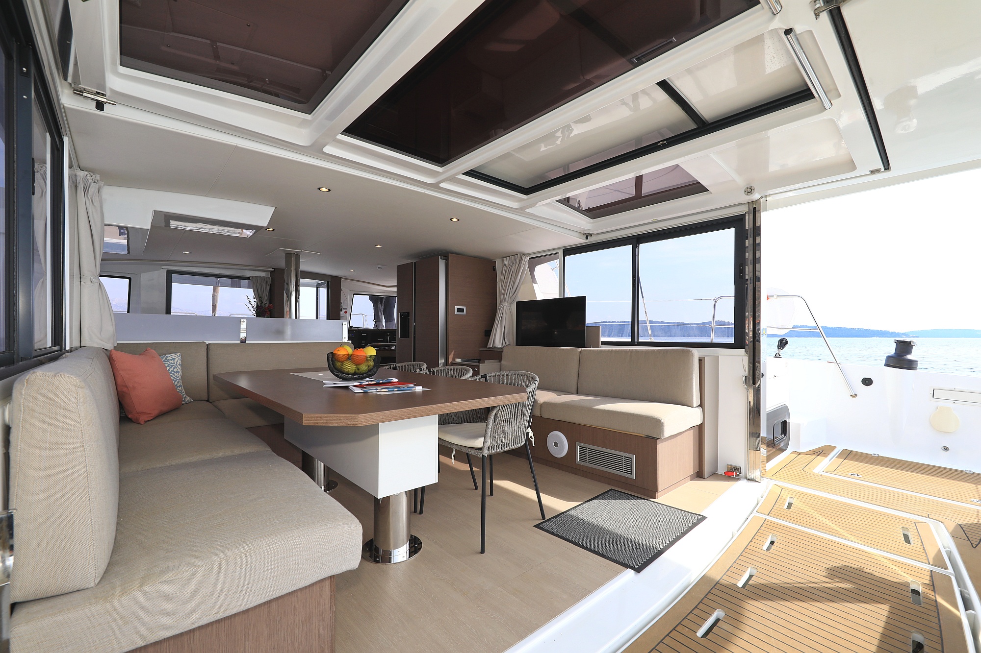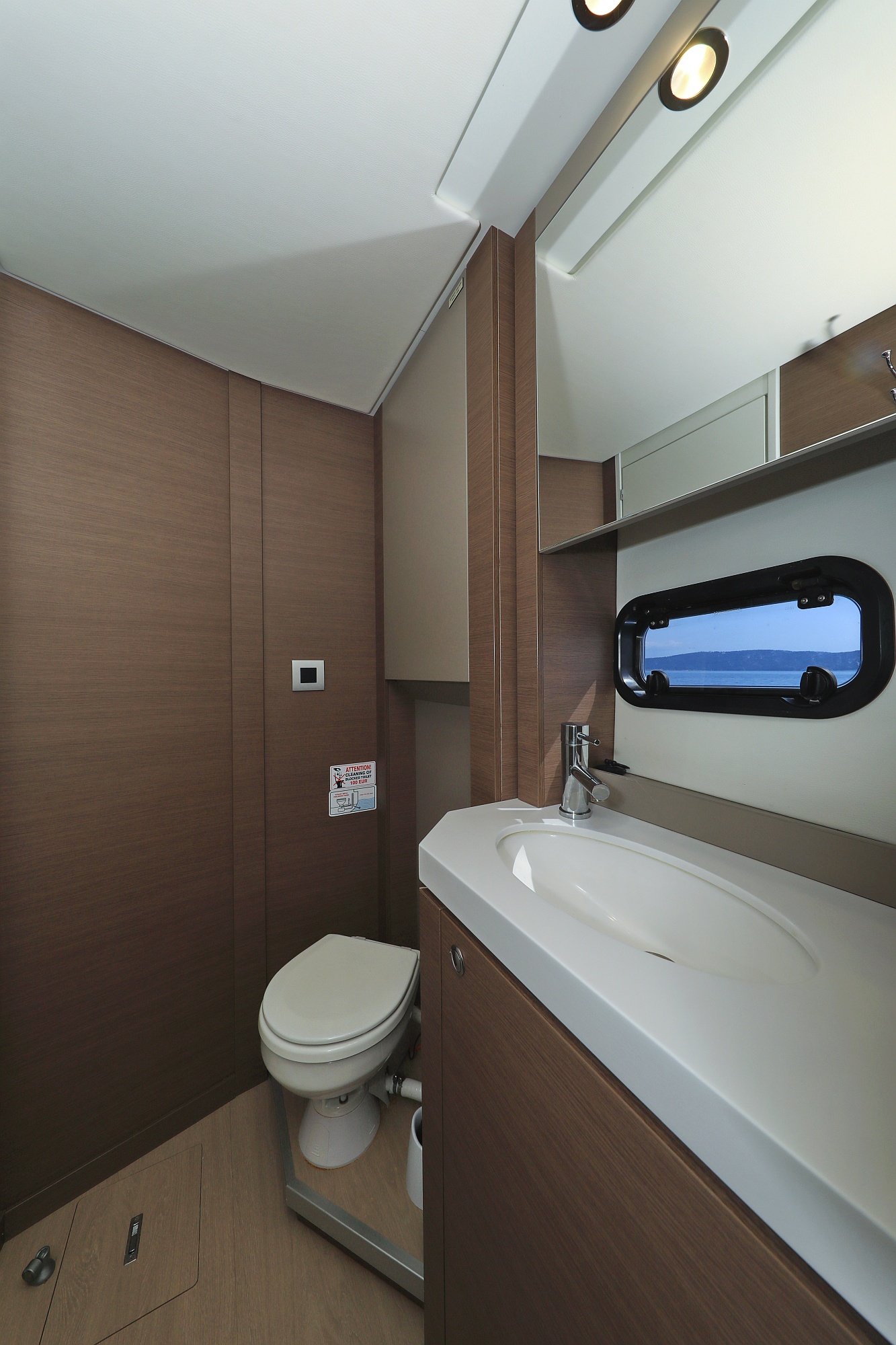| Outside | Badeplattform, Biminitop, Cockpitdusche, Cockpitlautsprecher, Cockpitpolster, Cockpittisch, Deckpolster, Flybridge, Polster auf Flybridge, Solaranlage, Sonnensegel, Teak im Cockpit |