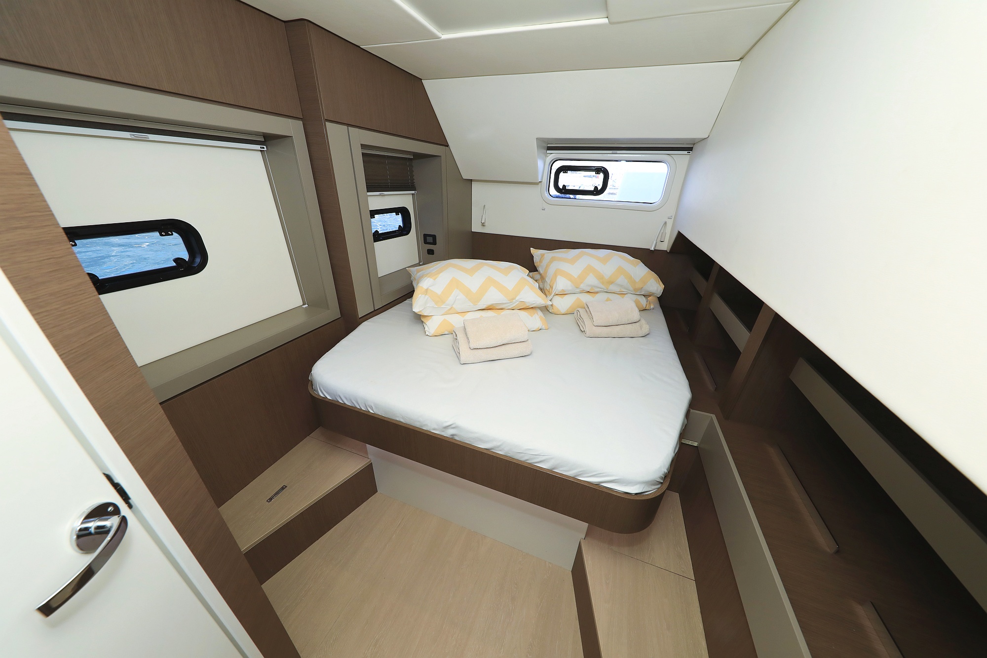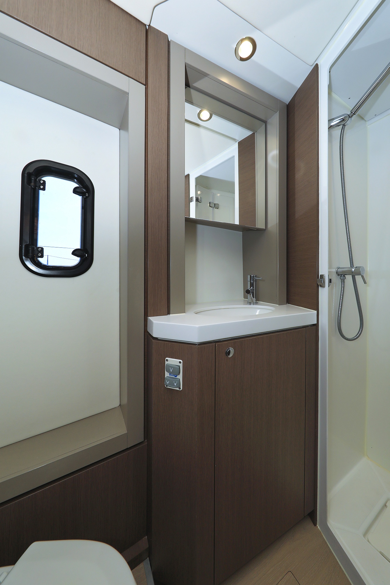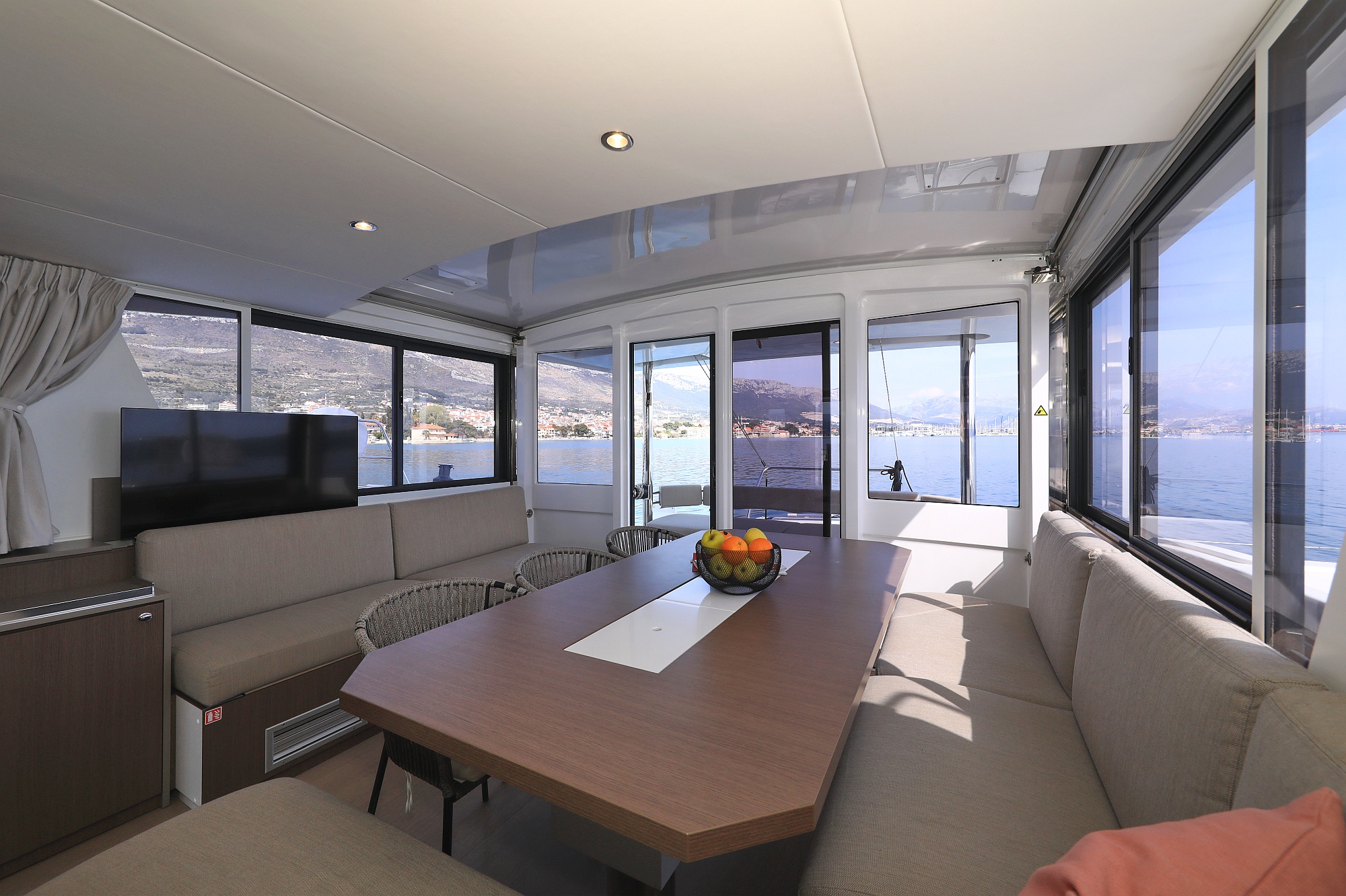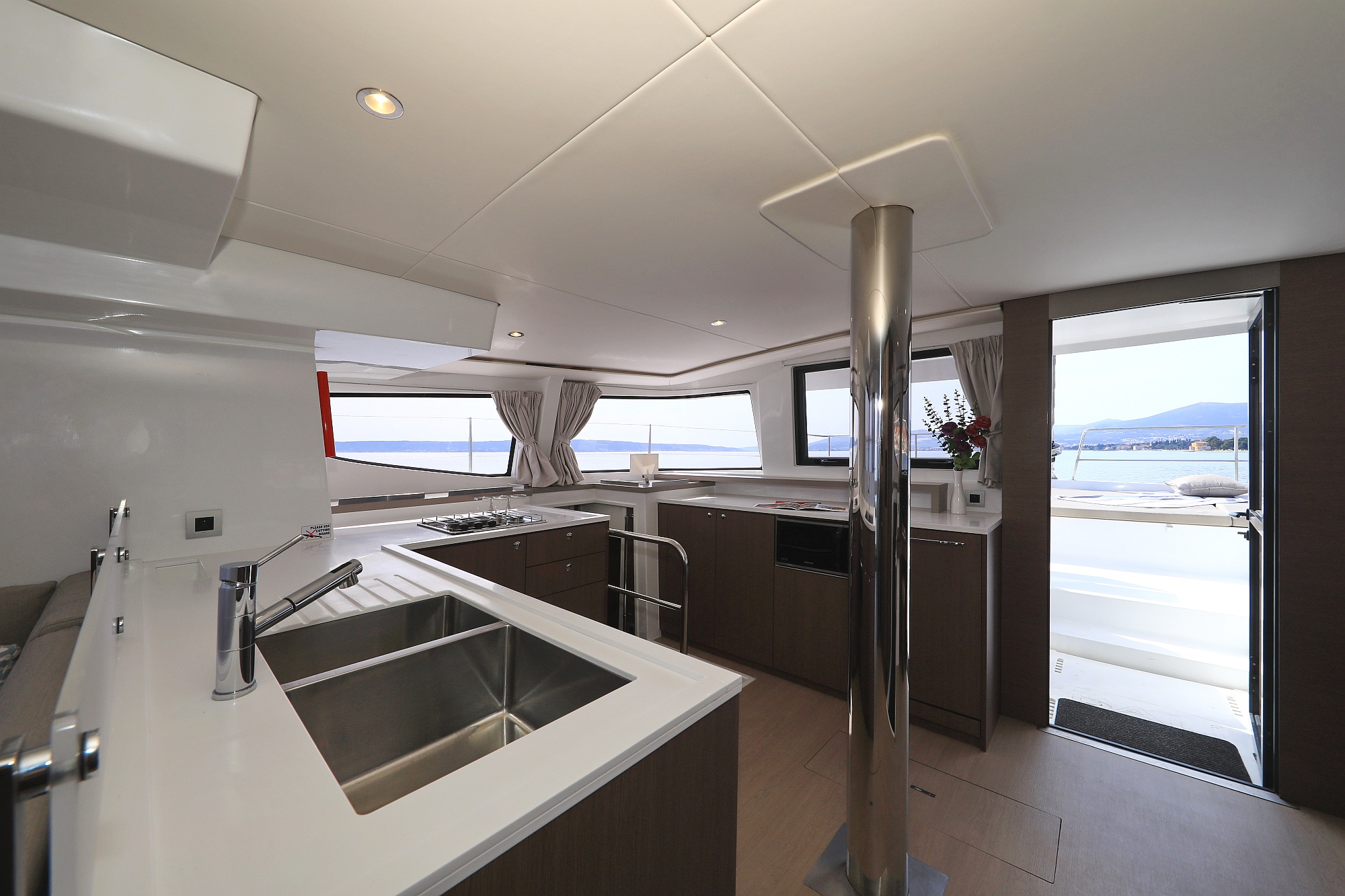 | Inside | Gasherd mit Backofen, Gefrierschrank, Generator, Geschirrspüler, Heizung, Inverter 12V/220V, Kaffeemaschine, Klimaanlage (ohne Landstrombedarf), Kühlschrank, Ladegerät, LCD Fernseher, Mikrowelle, Pantryausstattung, Radio mit CD, TV, Warmwasser, Watermaker, WC (elektr.) |