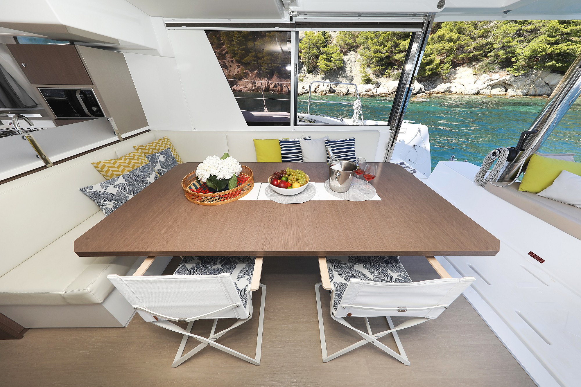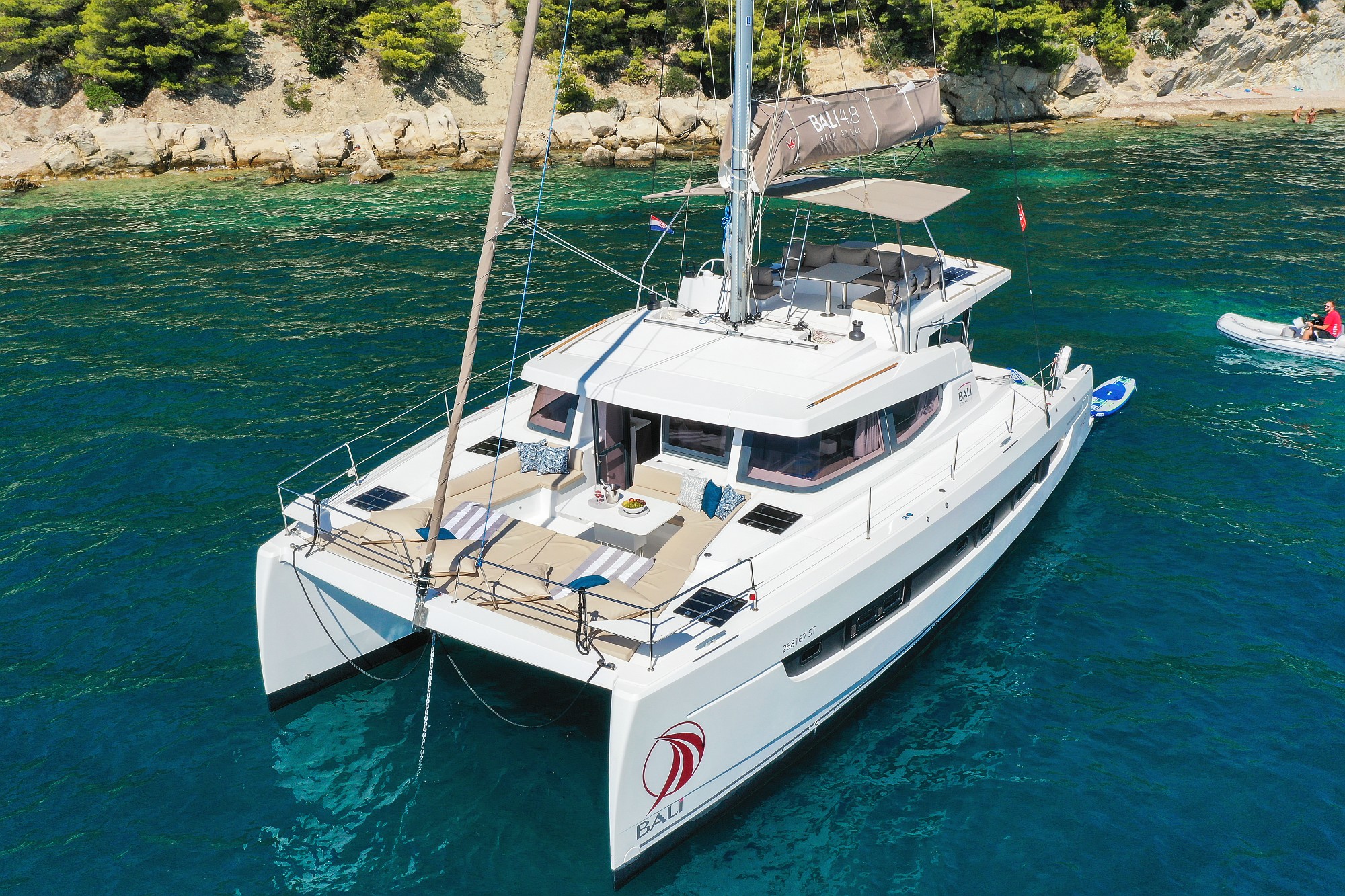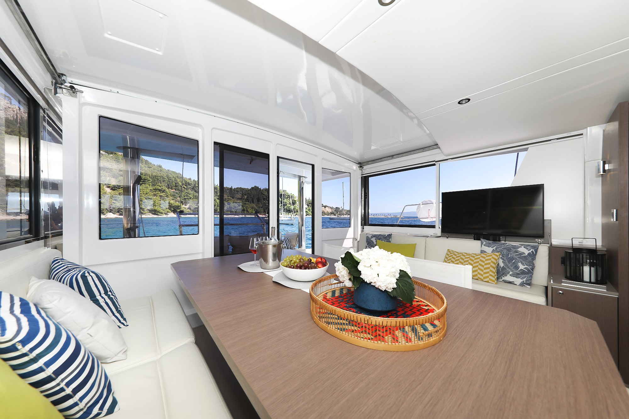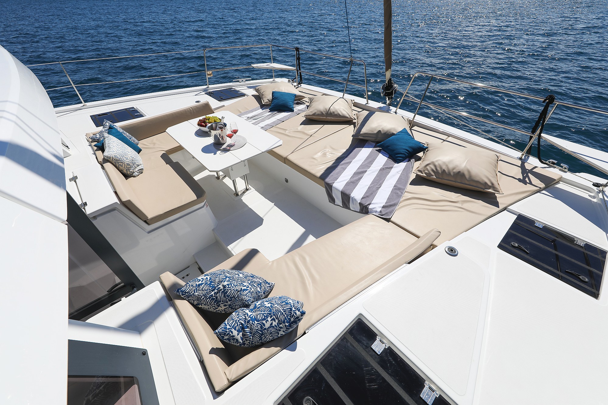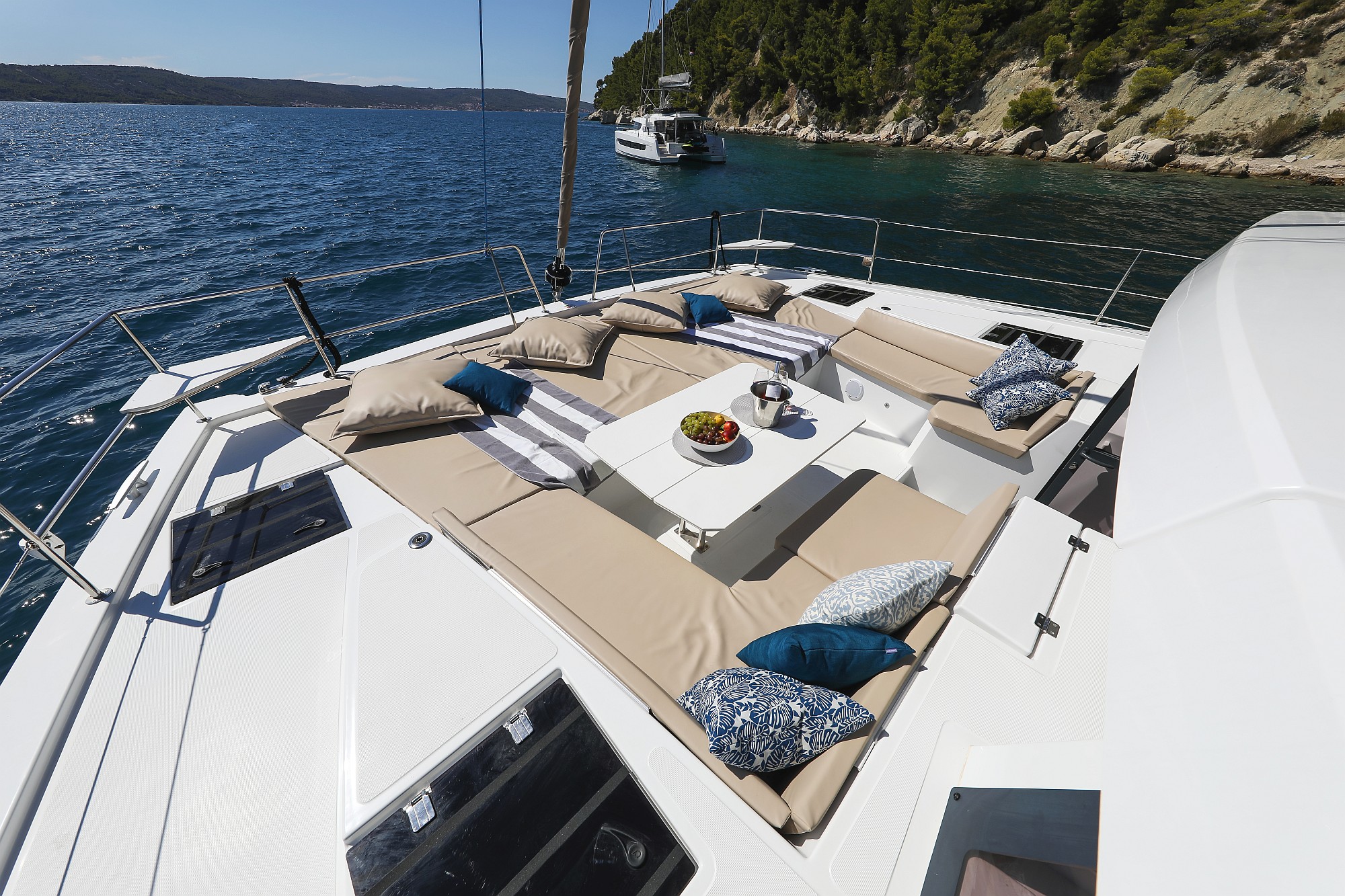 | Outside | Badeplattform, Biminitop, Cockpitdusche, Cockpitlautsprecher, Cockpitpolster, Cockpittisch, Deckpolster, Flybridge, Solaranlage |