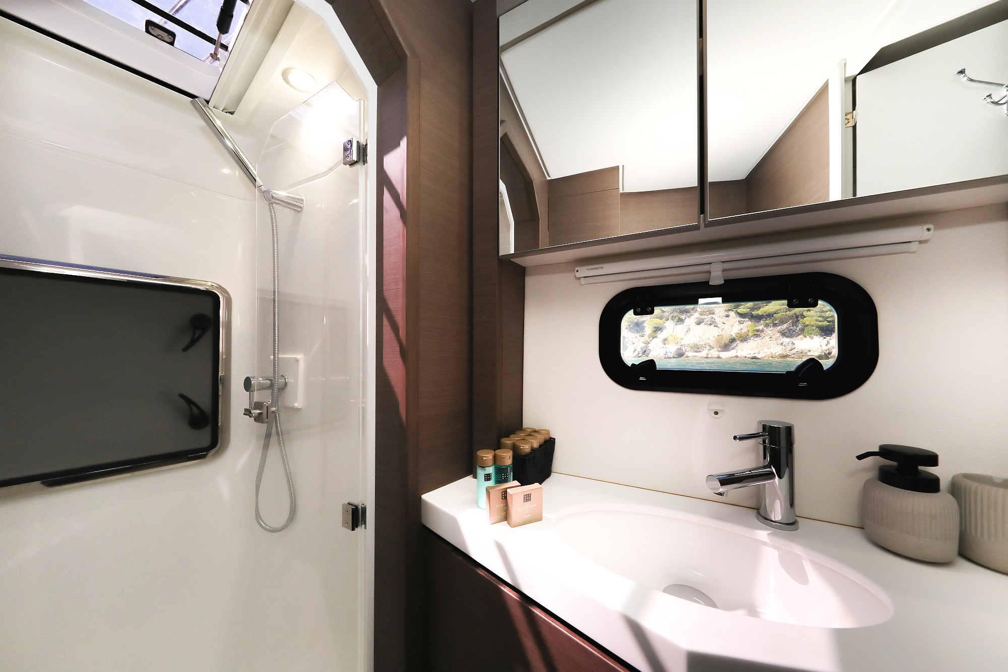 | Inside | Eiswürfelmaschine, Gasherd mit Backofen, Gefrierschrank, Generator, Heizung, Inverter 12V/220V, Kaffeemaschine, Klimaanlage (ohne Landstrombedarf), Kühlschrank mit Gefrierfach, Ladegerät, LCD Fernseher, Pantryausstattung, Radio mit CD, Warmwasser, Watermaker |