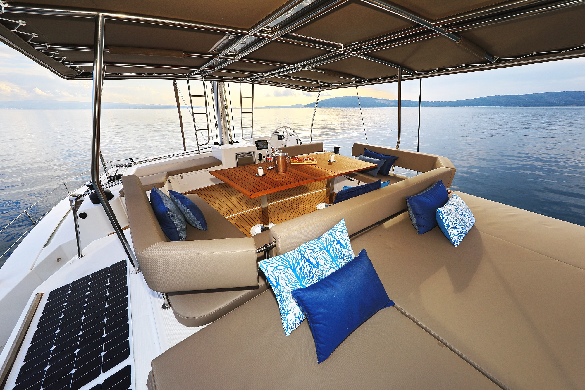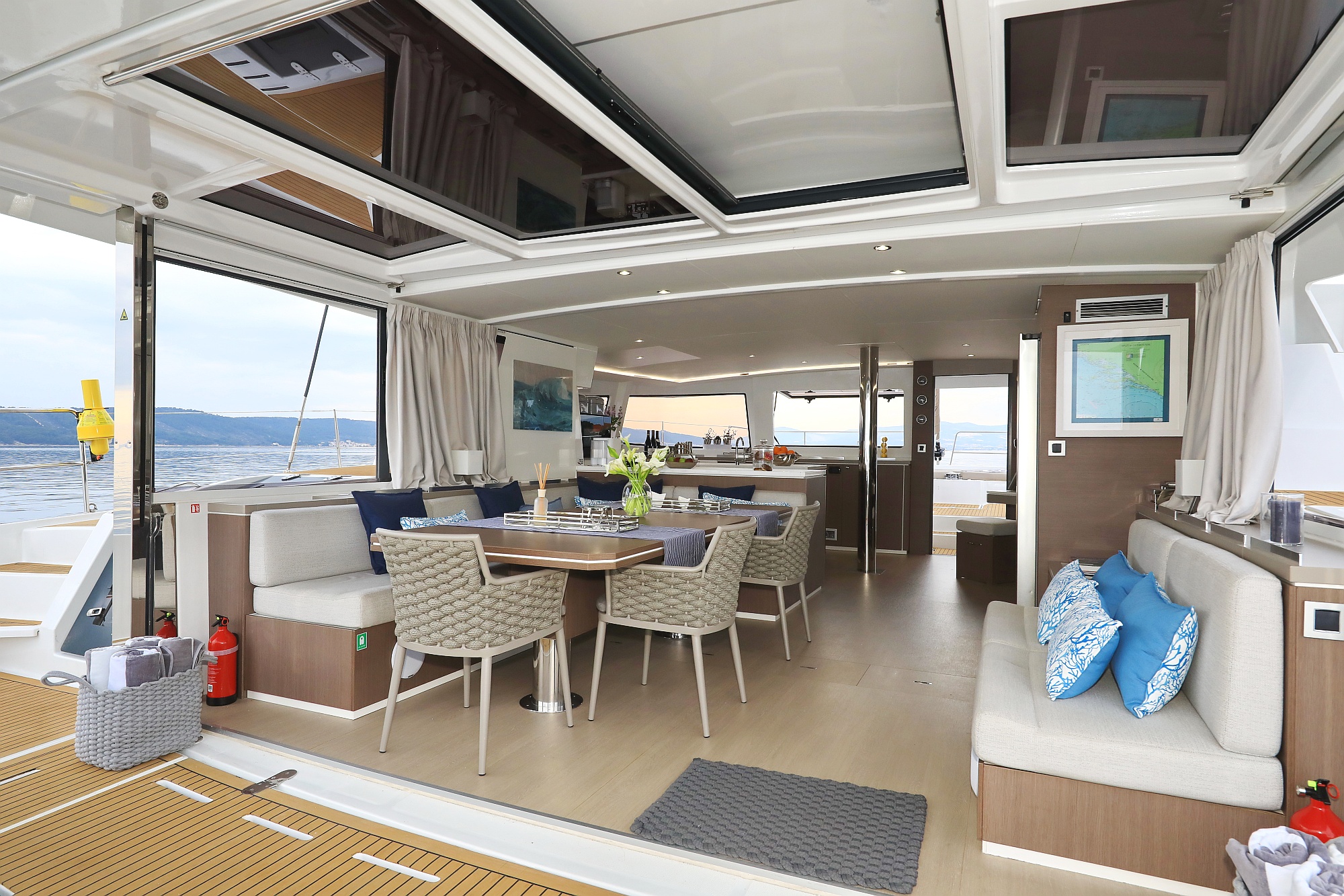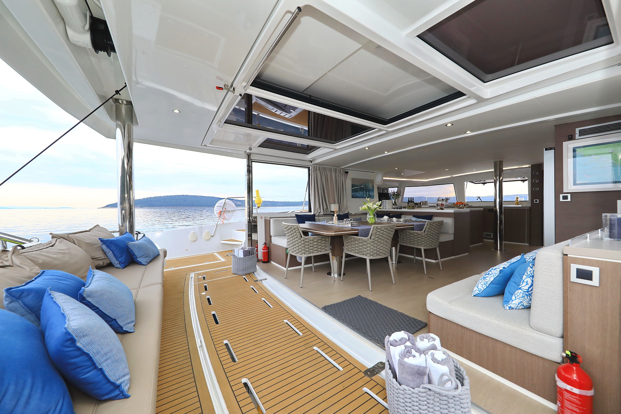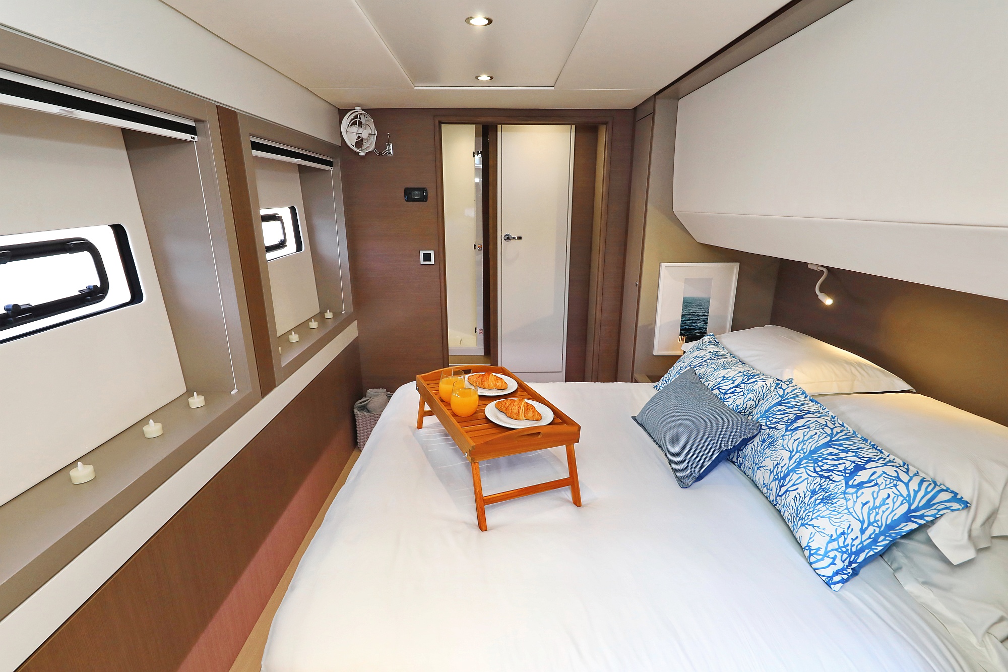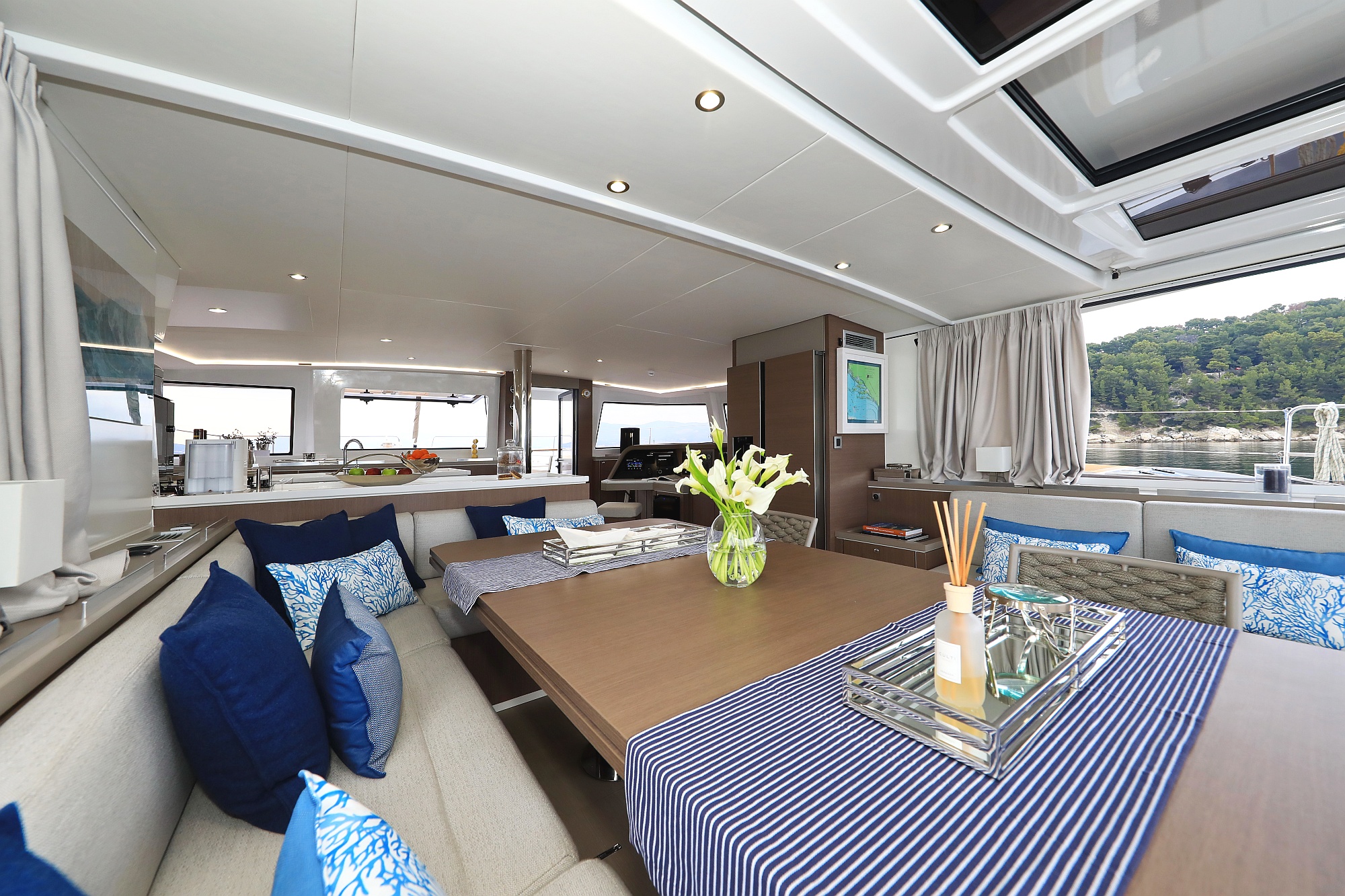 | Inside | Eiswürfelmaschine, Gasherd mit Backofen, Generator, Geschirrspüler, Heizung, Inverter 12V/220V, Klimaanlage (ohne Landstrombedarf), Kühlschrank mit Gefrierfach, LCD Fernseher, Mikrowelle, Nespresso-Maschine, Pantryausstattung, Radio mit CD, MP3, USB und Bluetooth, Trockner, USB Steckdosen in Salon und Kabinen, Ventilatoren in Kabinen, Waschmaschine, Watermaker |