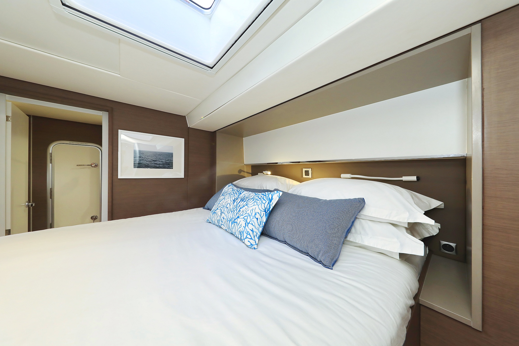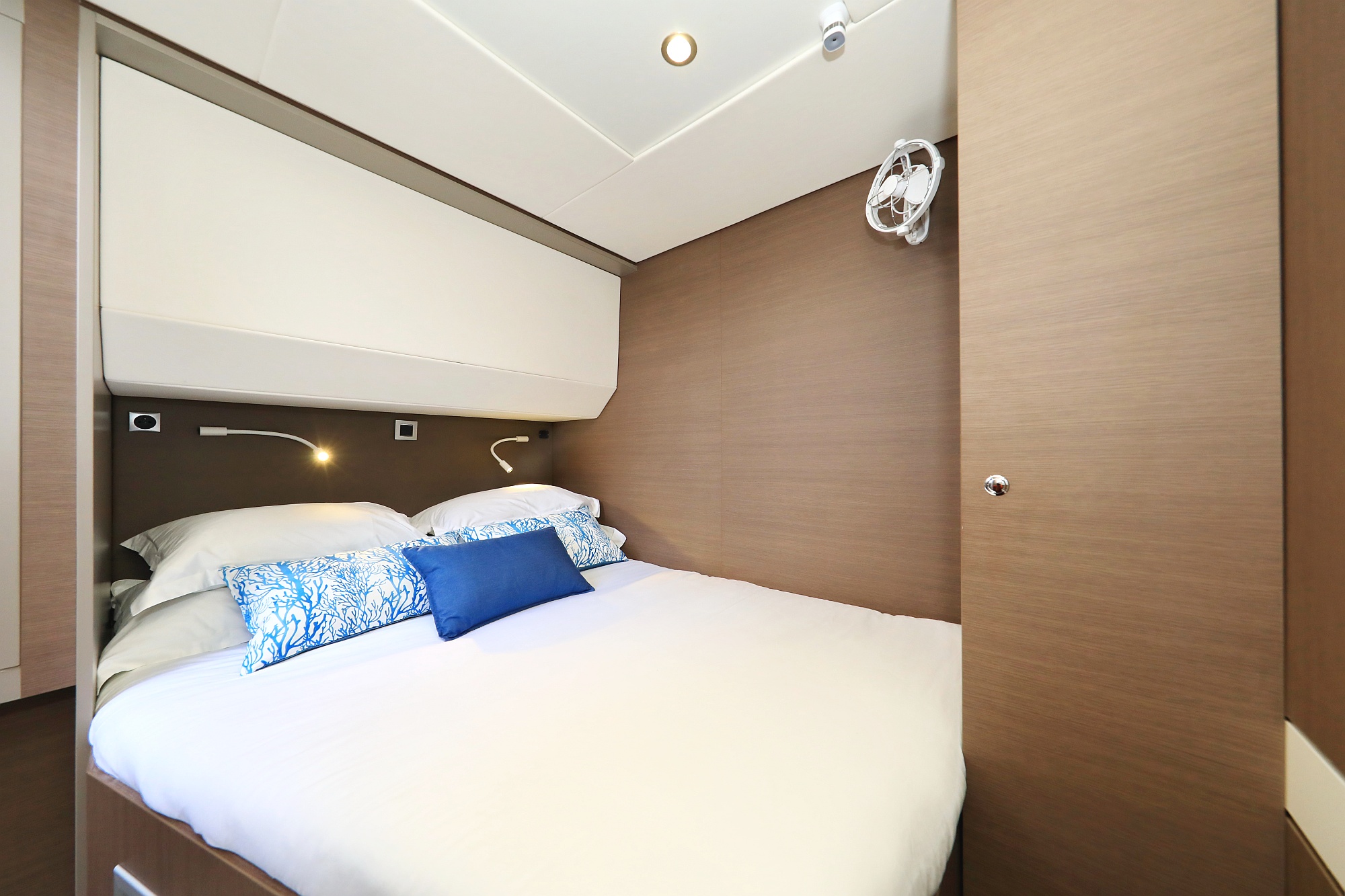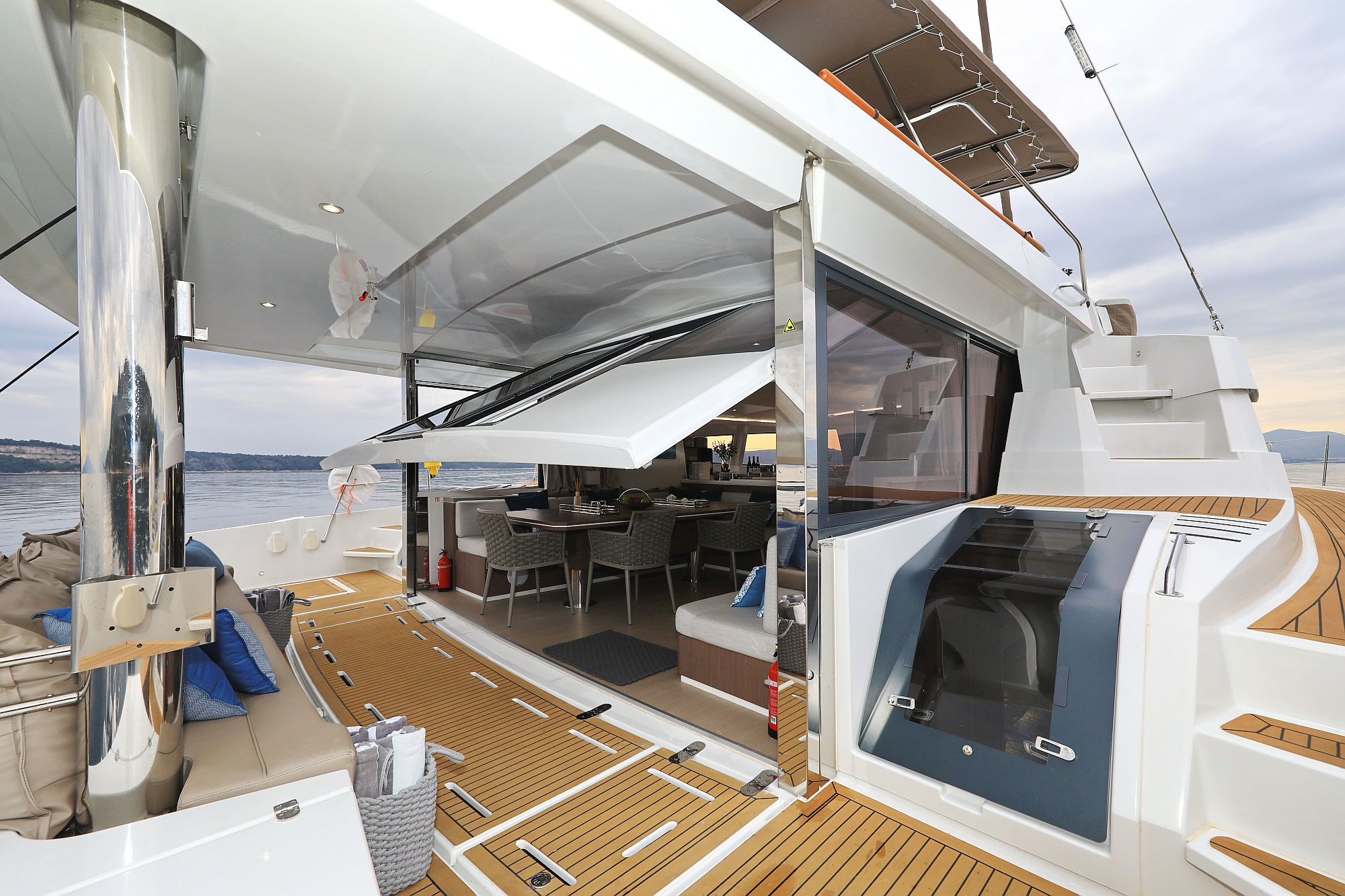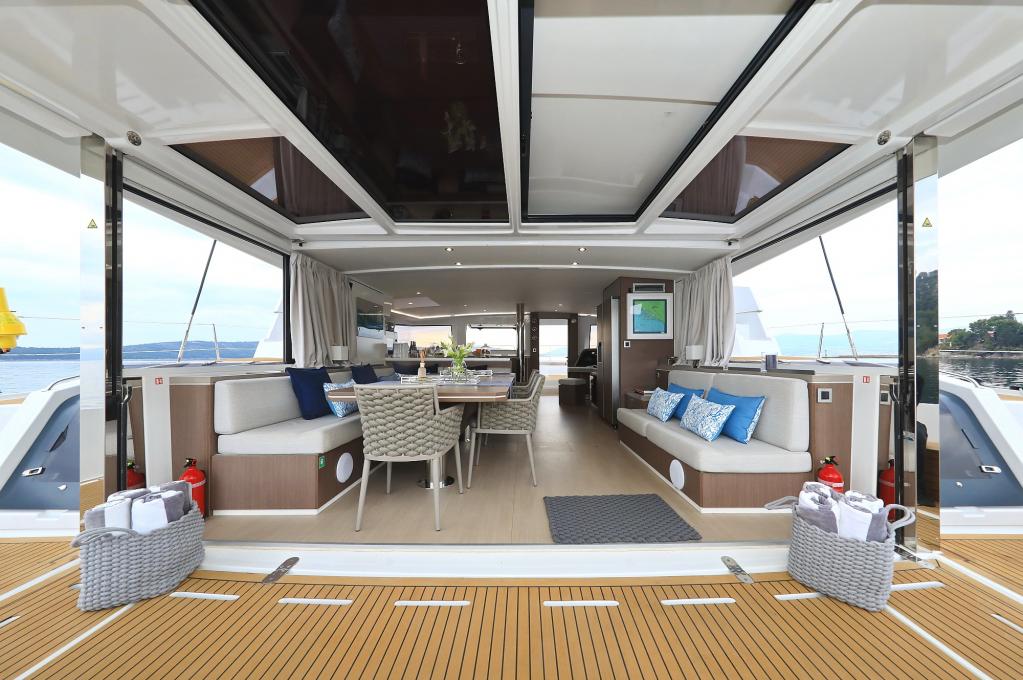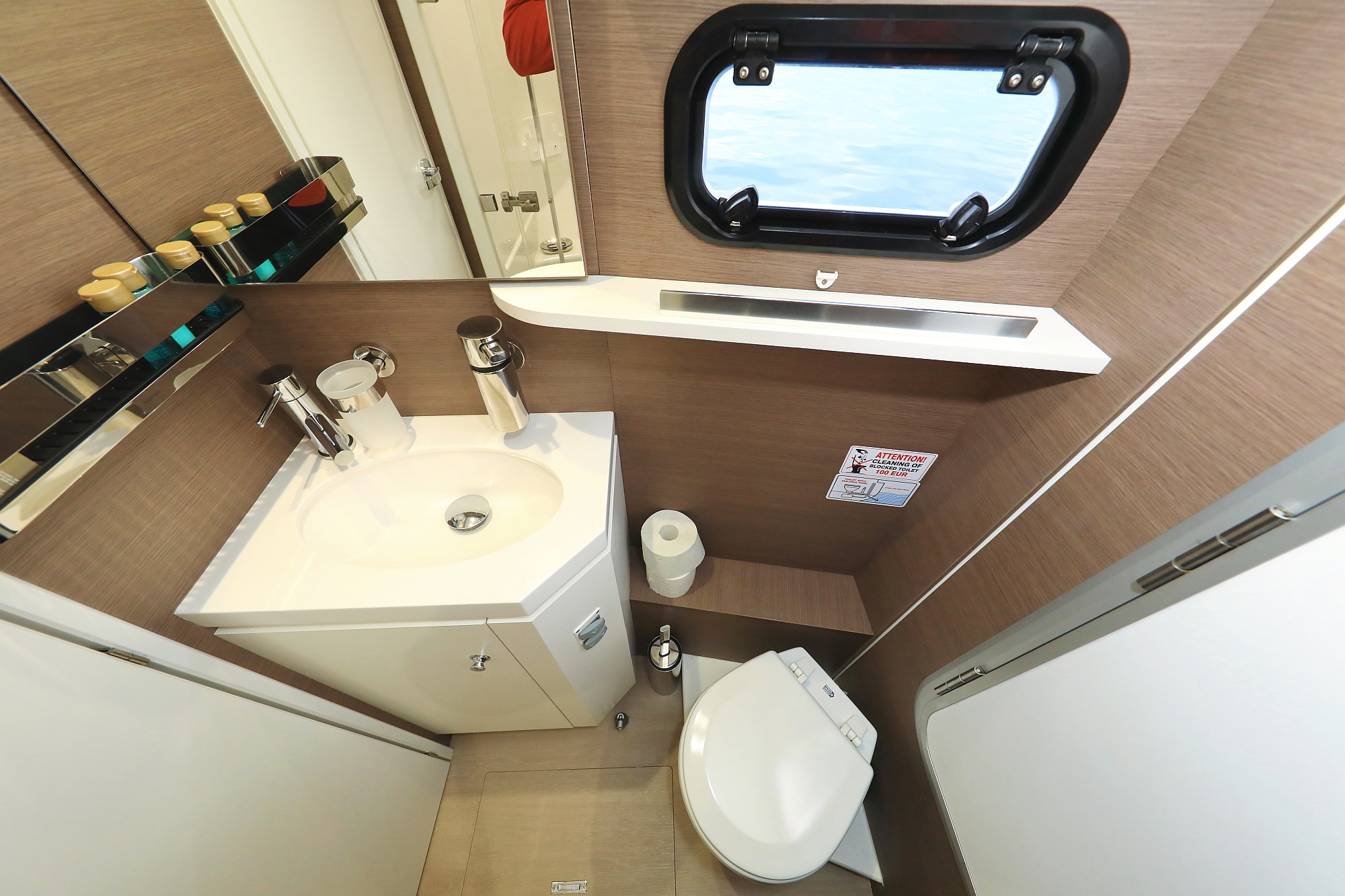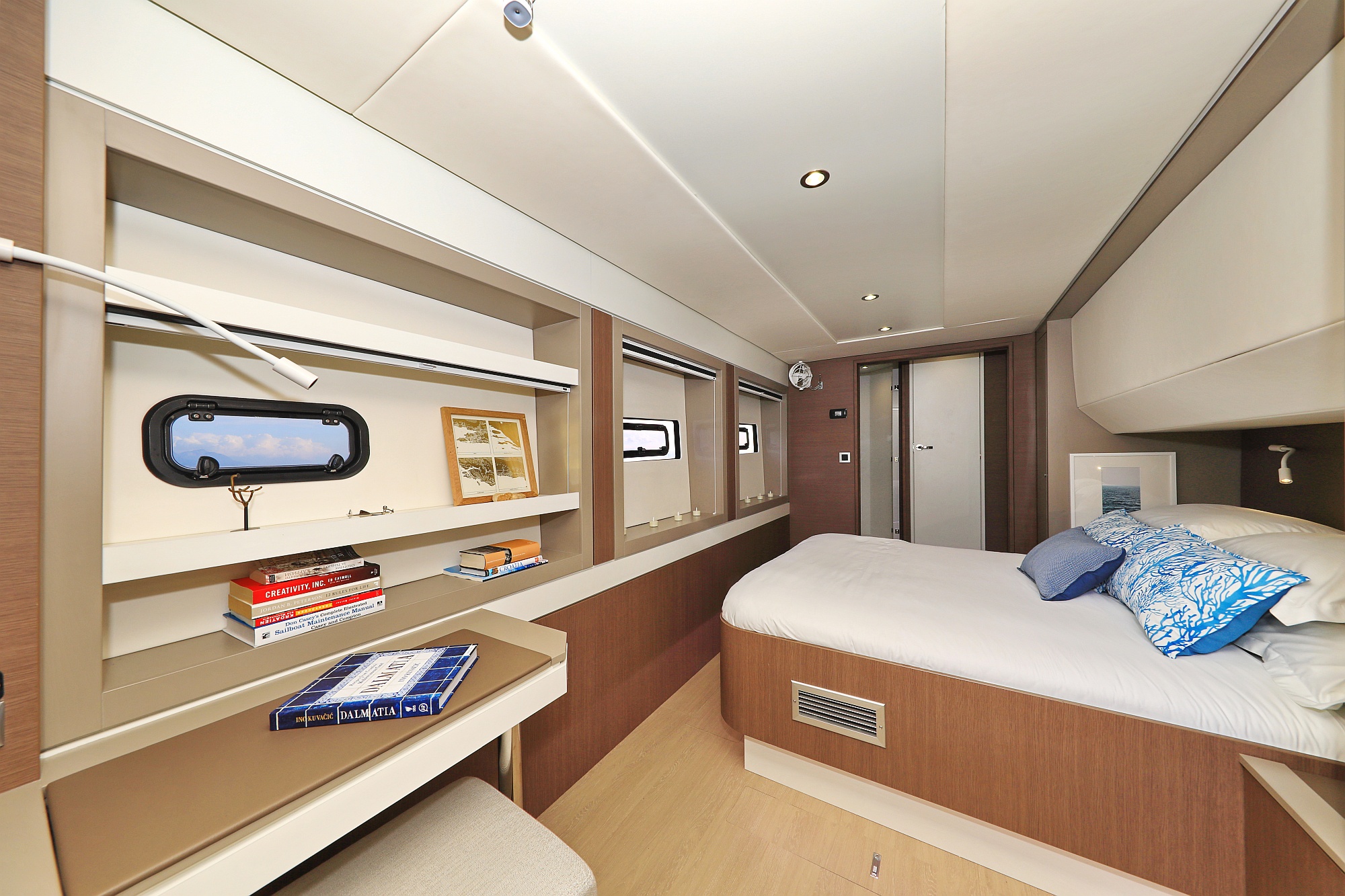 | Inside | Eiswürfelmaschine, Gasherd mit Backofen, Generator, Geschirrspüler, Heizung, Inverter 12V/220V, Klimaanlage (ohne Landstrombedarf), Kühlschrank mit Gefrierfach, LCD Fernseher, Mikrowelle, Nespresso-Maschine, Pantryausstattung, Radio mit CD, MP3, USB und Bluetooth, Trockner, USB Steckdosen in Salon und Kabinen, Ventilatoren in Kabinen, Waschmaschine, Watermaker |