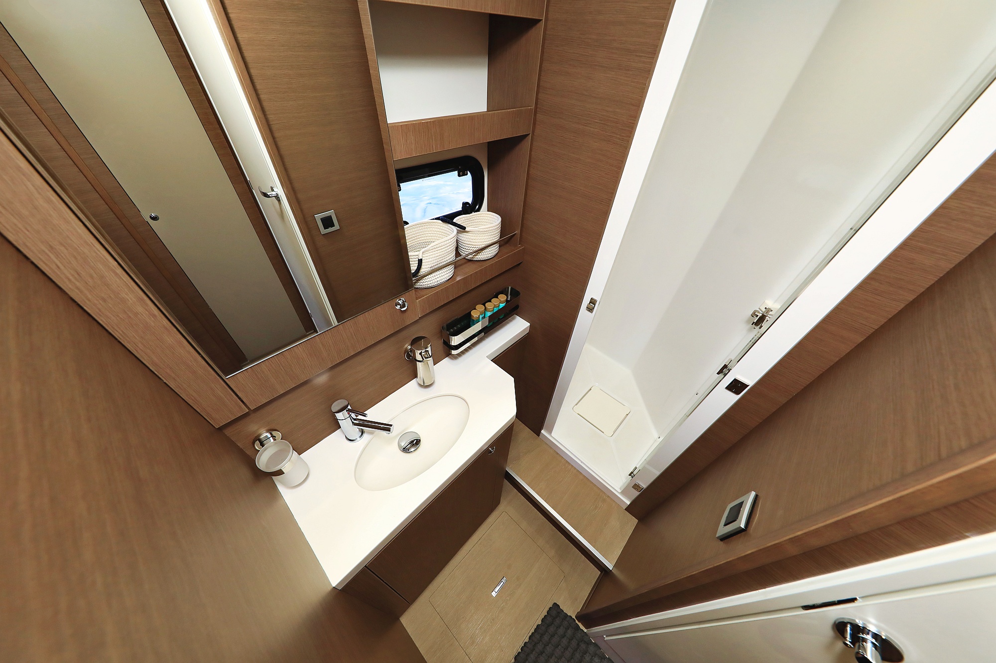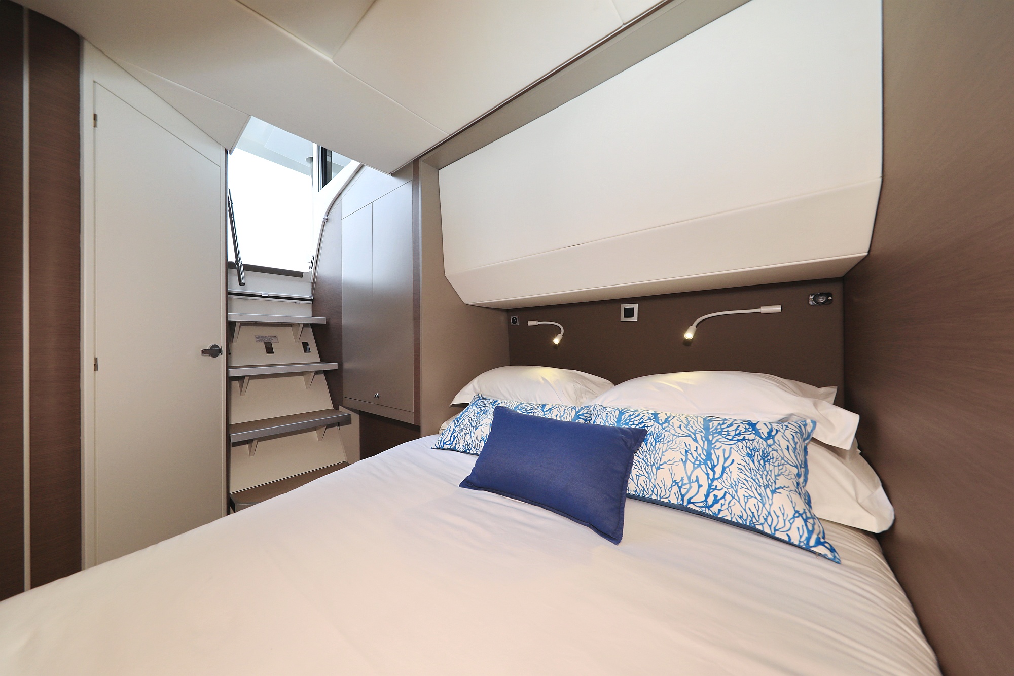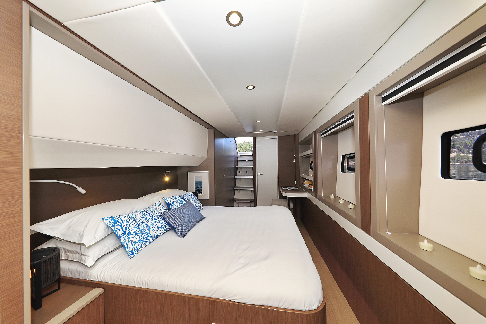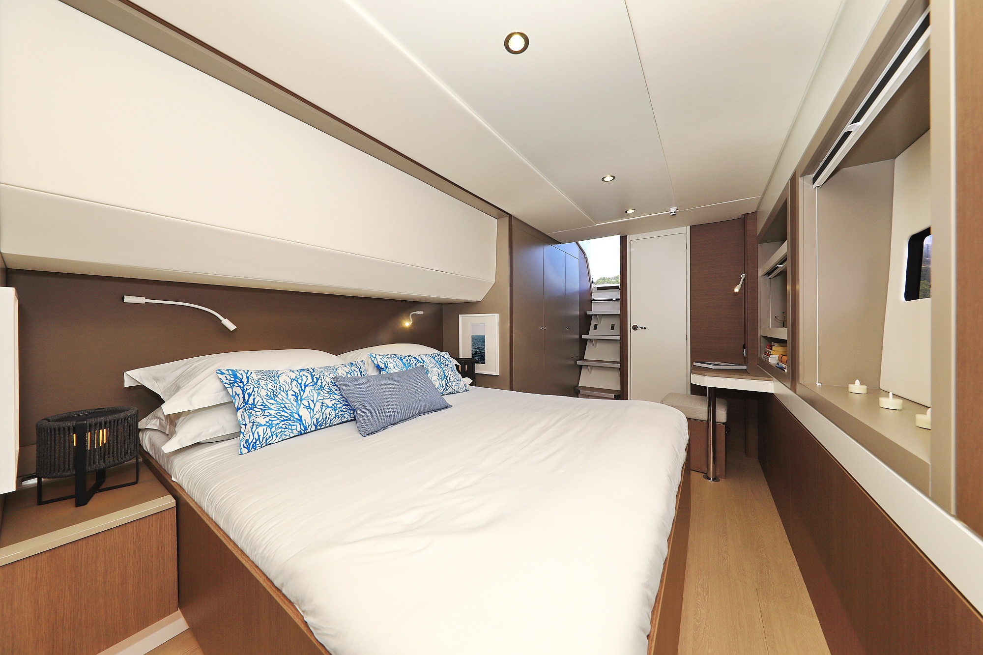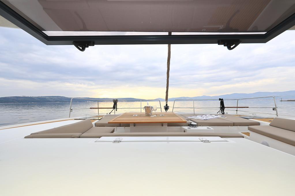 | Inside | Eiswürfelmaschine, Gasherd mit Backofen, Generator, Geschirrspüler, Heizung, Inverter 12V/220V, Klimaanlage (ohne Landstrombedarf), Kühlschrank mit Gefrierfach, LCD Fernseher, Mikrowelle, Nespresso-Maschine, Pantryausstattung, Radio mit CD, MP3, USB und Bluetooth, Trockner, USB Steckdosen in Salon und Kabinen, Ventilatoren in Kabinen, Waschmaschine, Watermaker |