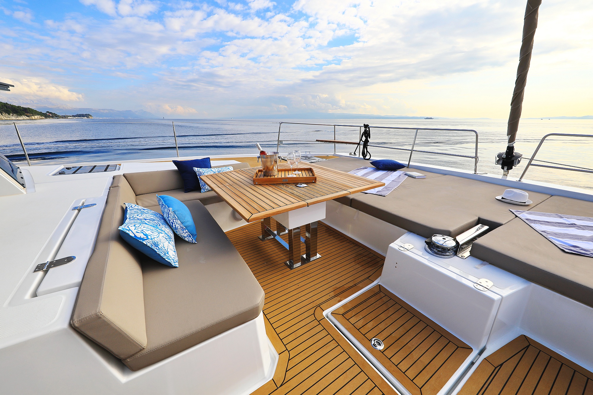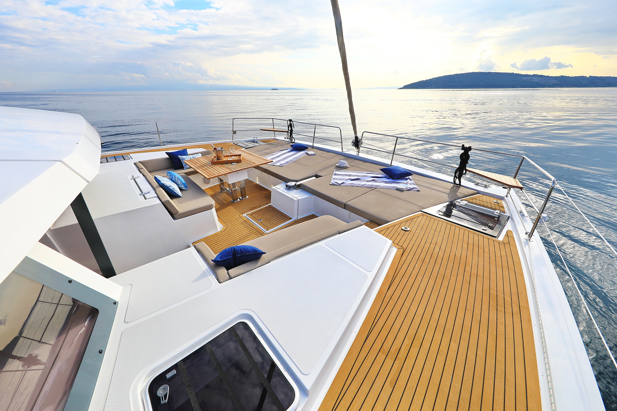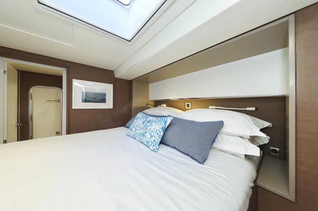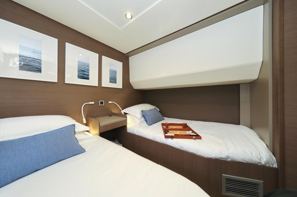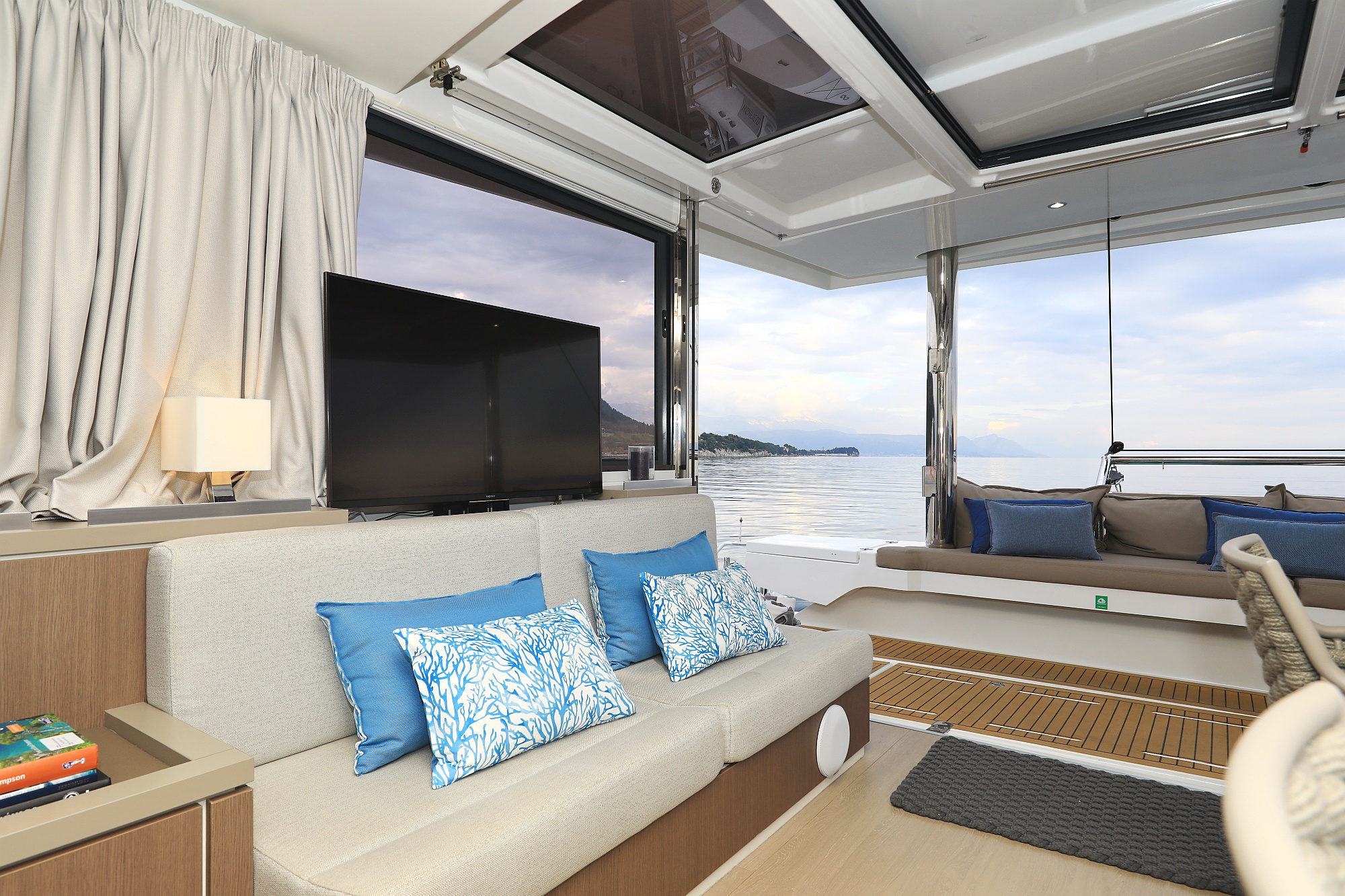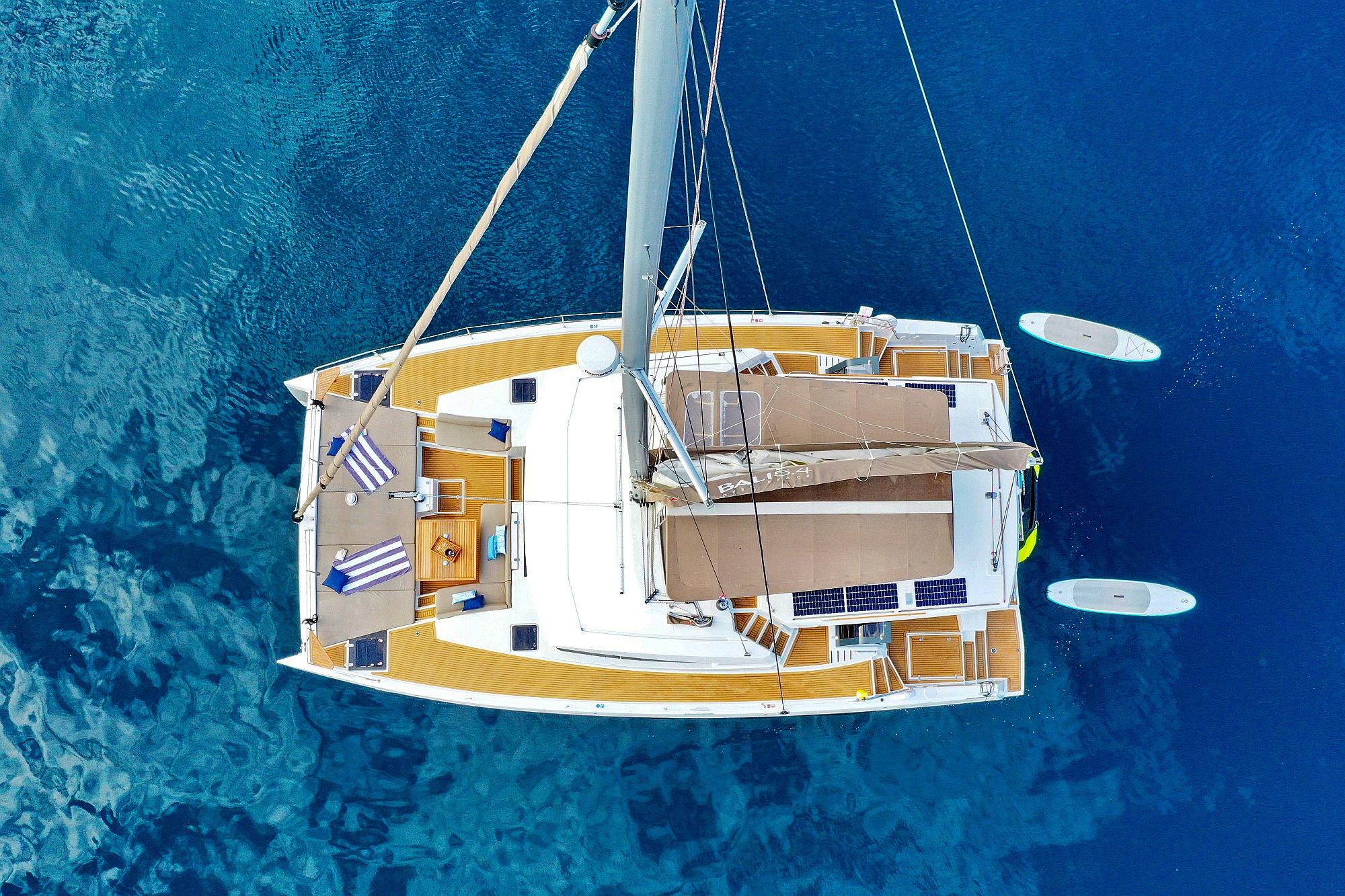 | Inside | Eiswürfelmaschine, Gasherd mit Backofen, Generator, Geschirrspüler, Heizung, Inverter 12V/220V, Klimaanlage (ohne Landstrombedarf), Kühlschrank mit Gefrierfach, LCD Fernseher, Mikrowelle, Nespresso-Maschine, Pantryausstattung, Radio mit CD, MP3, USB und Bluetooth, Trockner, USB Steckdosen in Salon und Kabinen, Ventilatoren in Kabinen, Waschmaschine, Watermaker |